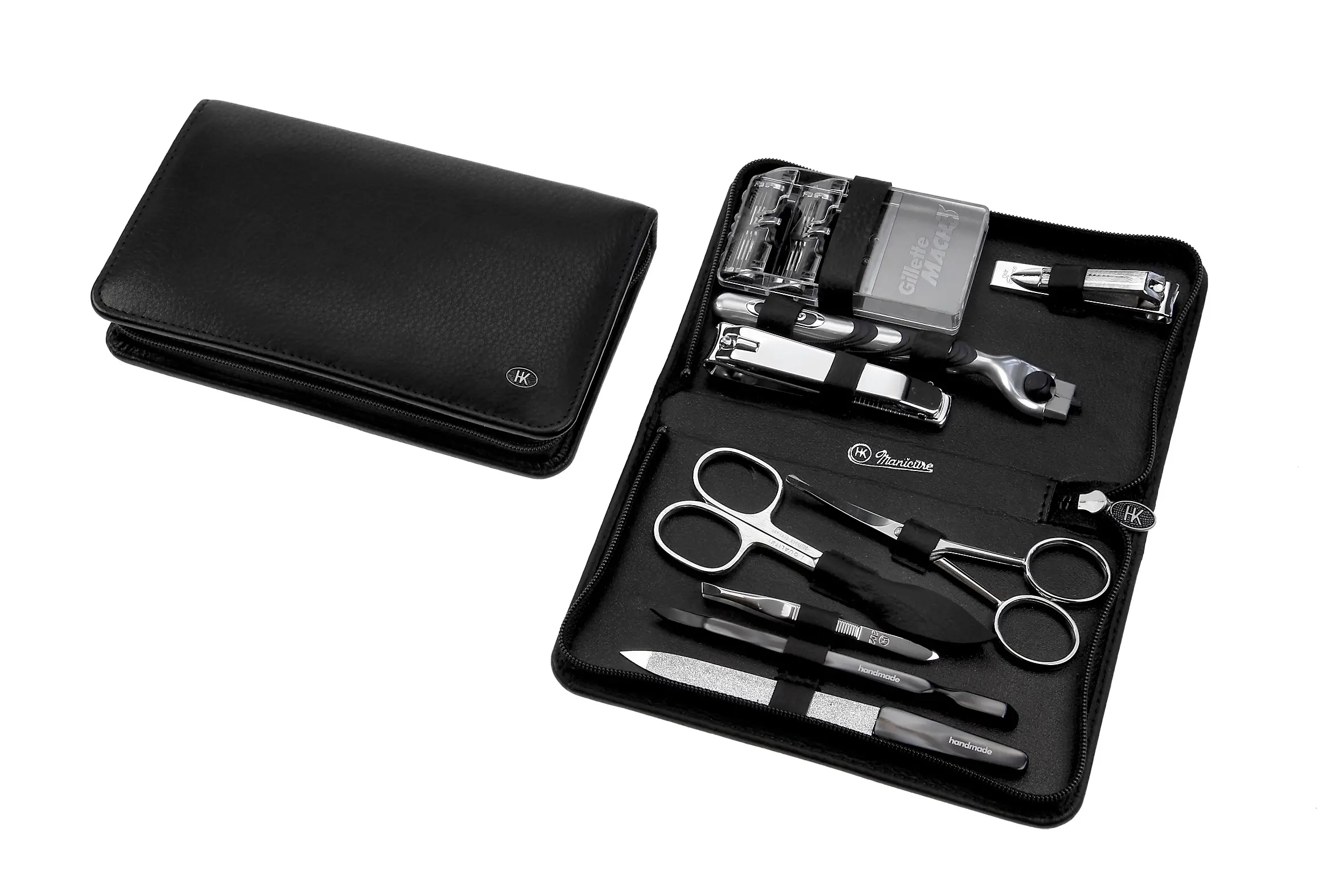 Herren-Pflegeset: 9-tlg. Bestückung, vernickelt; Vollrindleder, schwarz