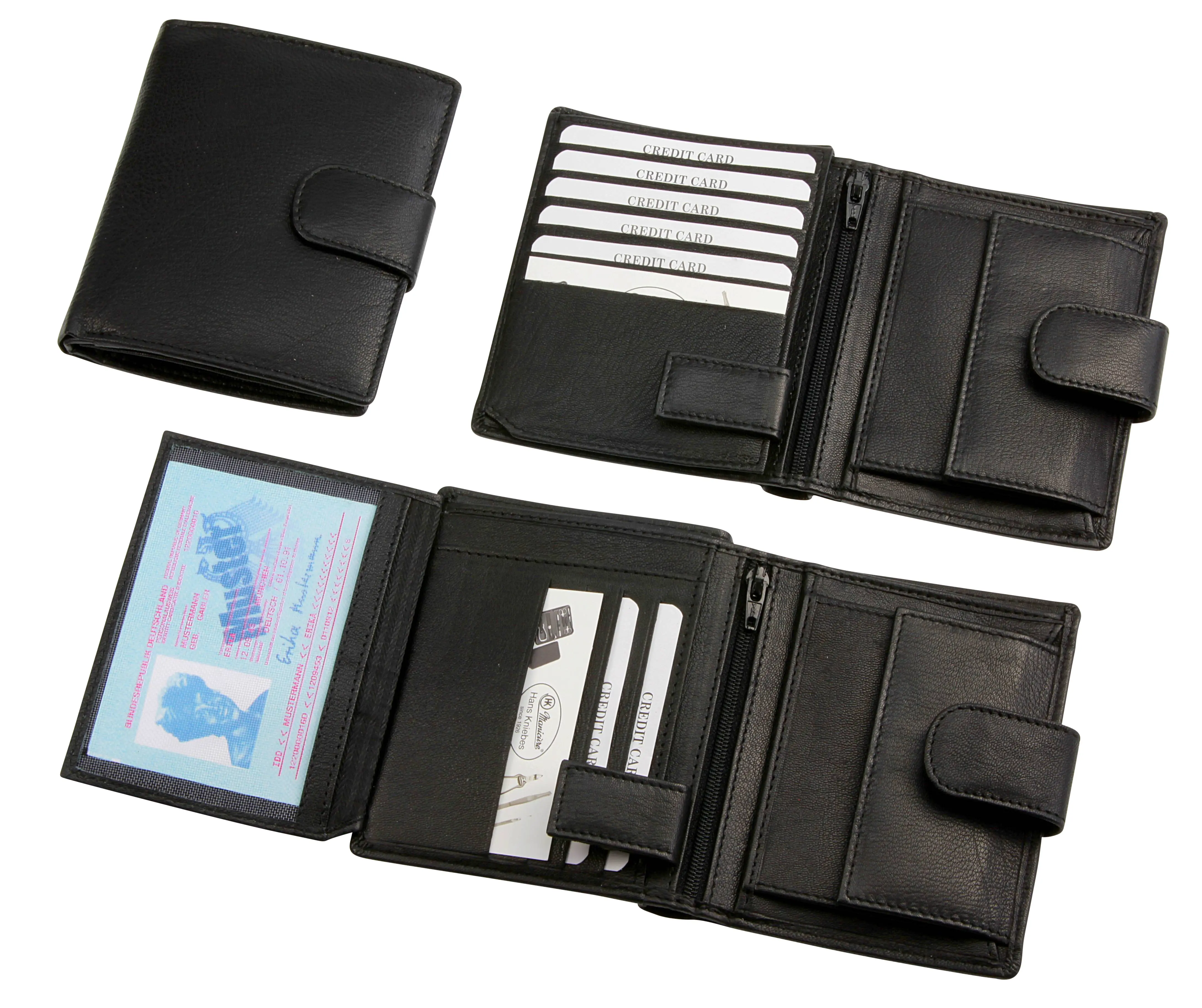 aus schwarzem Nappa-Schafleder mit einem Münzfach, zwei Scheintaschen, zehn Kartenfächern und fünf Ausweisfächern