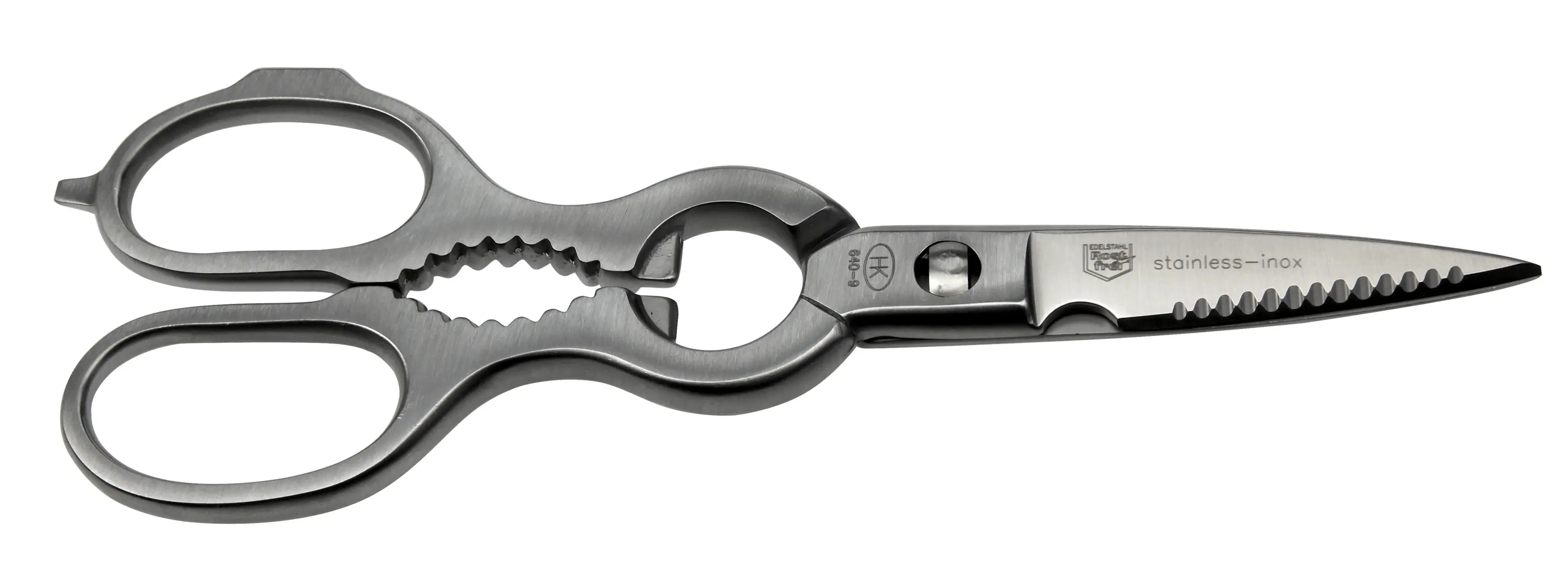 Zum leichten Reinigen (aber auch zum späteren Nachschärfen) nach Saucen oder Küchenresten ist die Schere leicht demontierbar, wie unsere Abbildung zeigt. Sie erfüllt mehrere Aufgaben in der Küche, vom Schneiden, Sägen, Flaschen öffnen, Dosen öffnen bis hin zum Nüsse knacken. Ein „Allrounder und Assistent der Küchenleitung" in großen und kleinen Küchen, den man nach Gebrauch nicht mehr missen möchte.