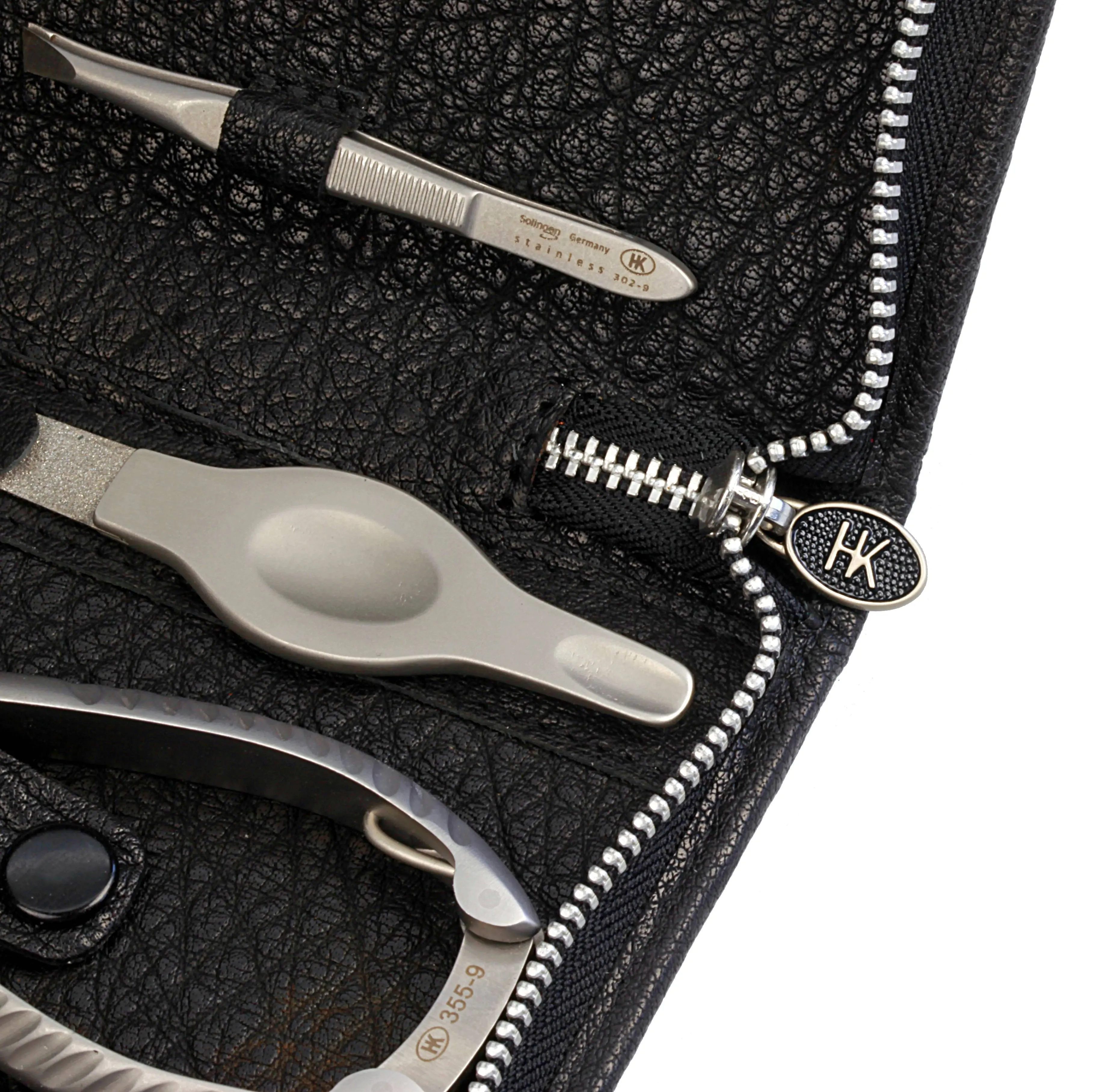Produktinformationen "Man.-Etui mit Metall-Reißverschluss: 6-tlg. Bestückung, rostfrei-edelmattiert; schrumpfgegerbtes Büffelleder, schwarz mit Kontrastnaht"