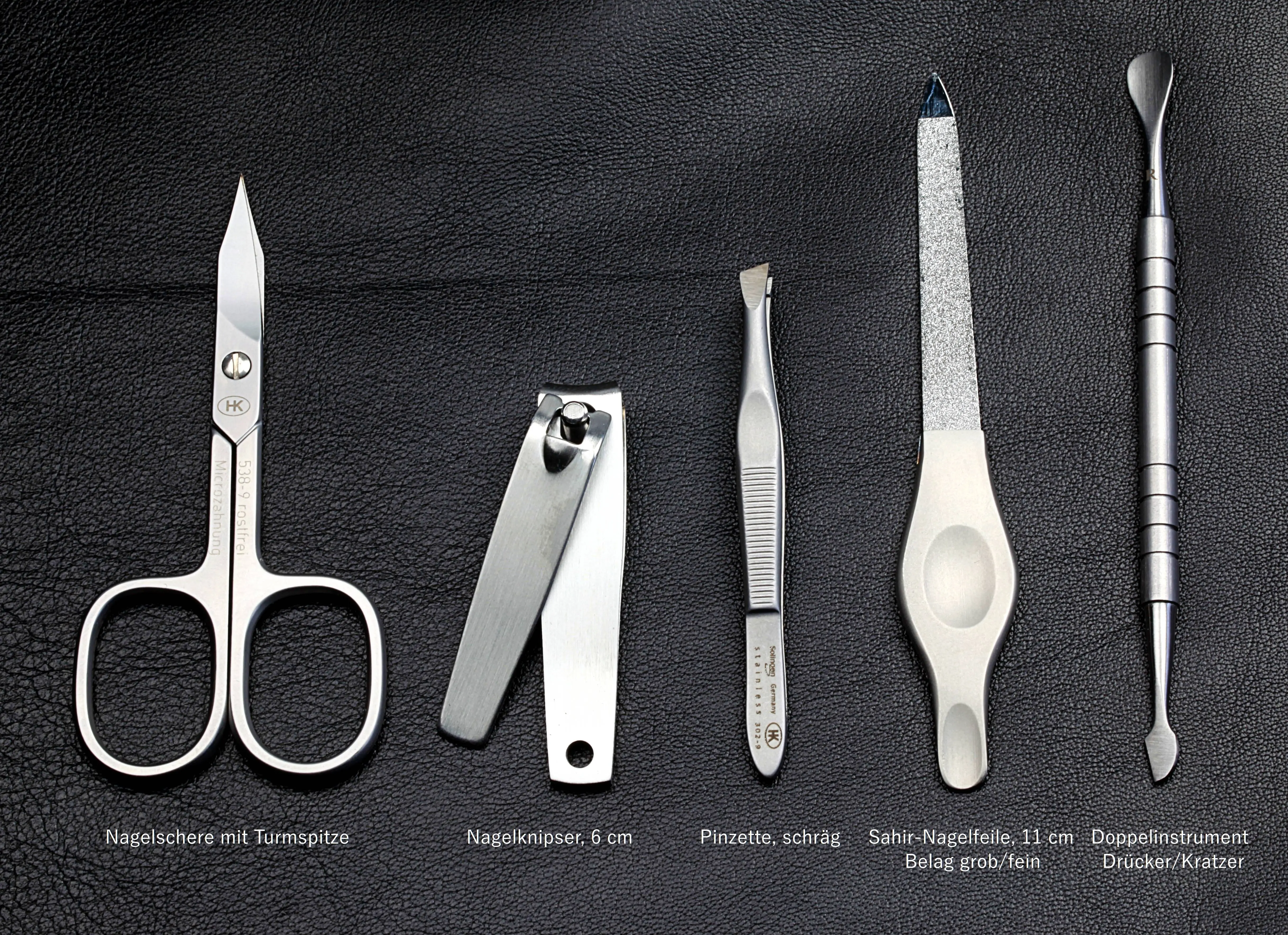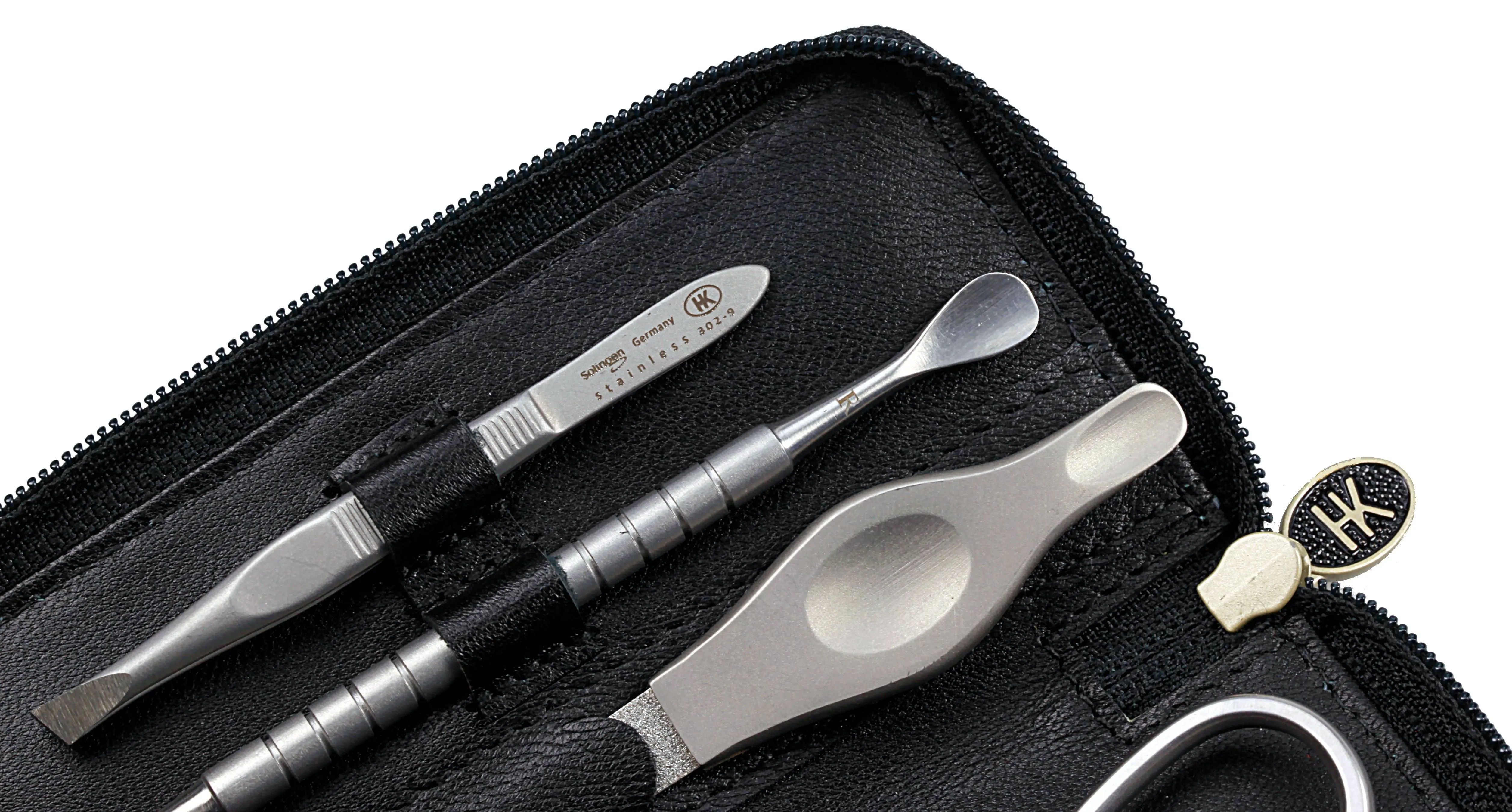 Alle fünf hochwertigen HK-MANICURE Instrumente sind aus rostfreiem Edelstahl gefertigt und haben eine mattierte Optik für blendfreies Arbeiten. Die Instrumente sind antiallergen.