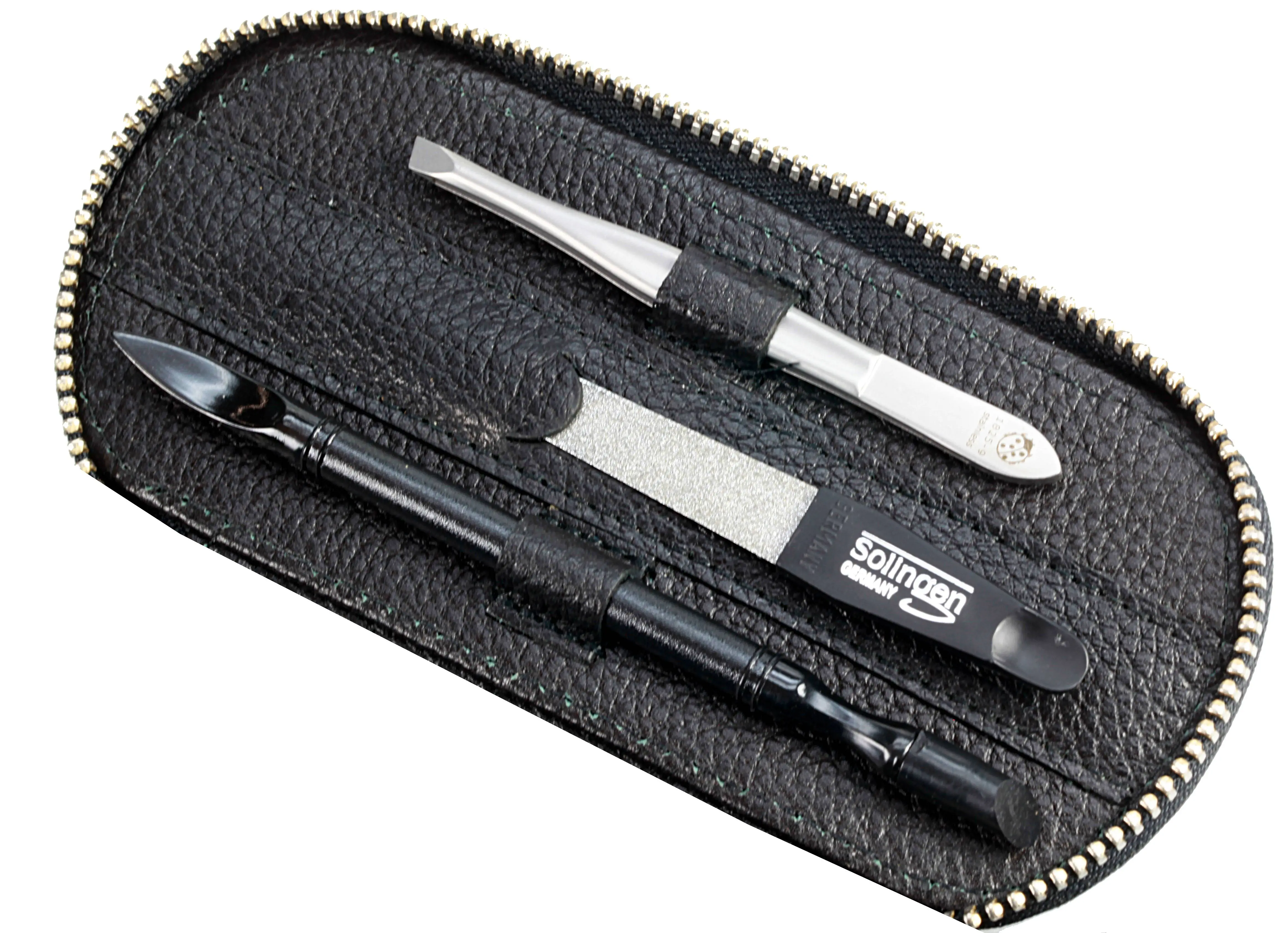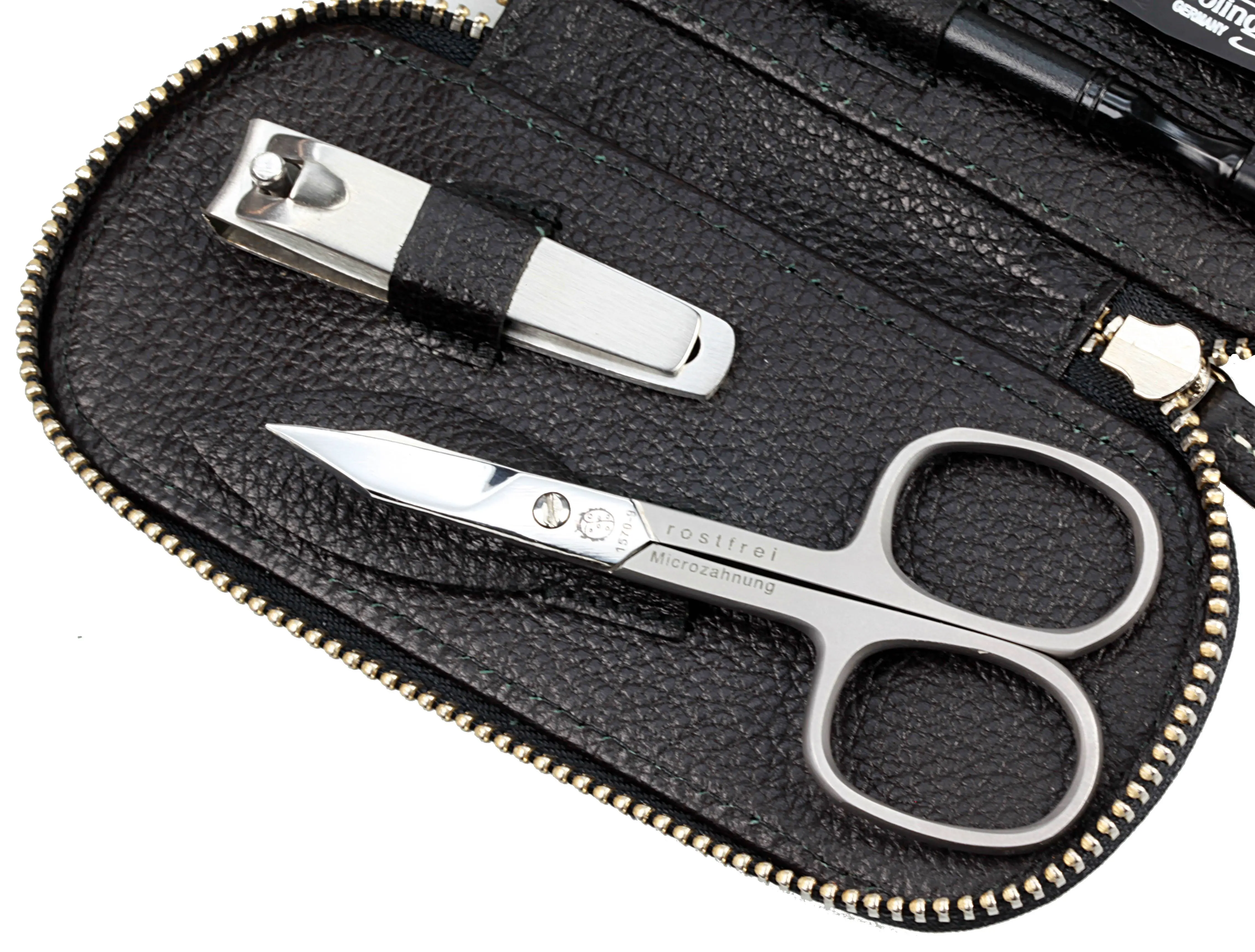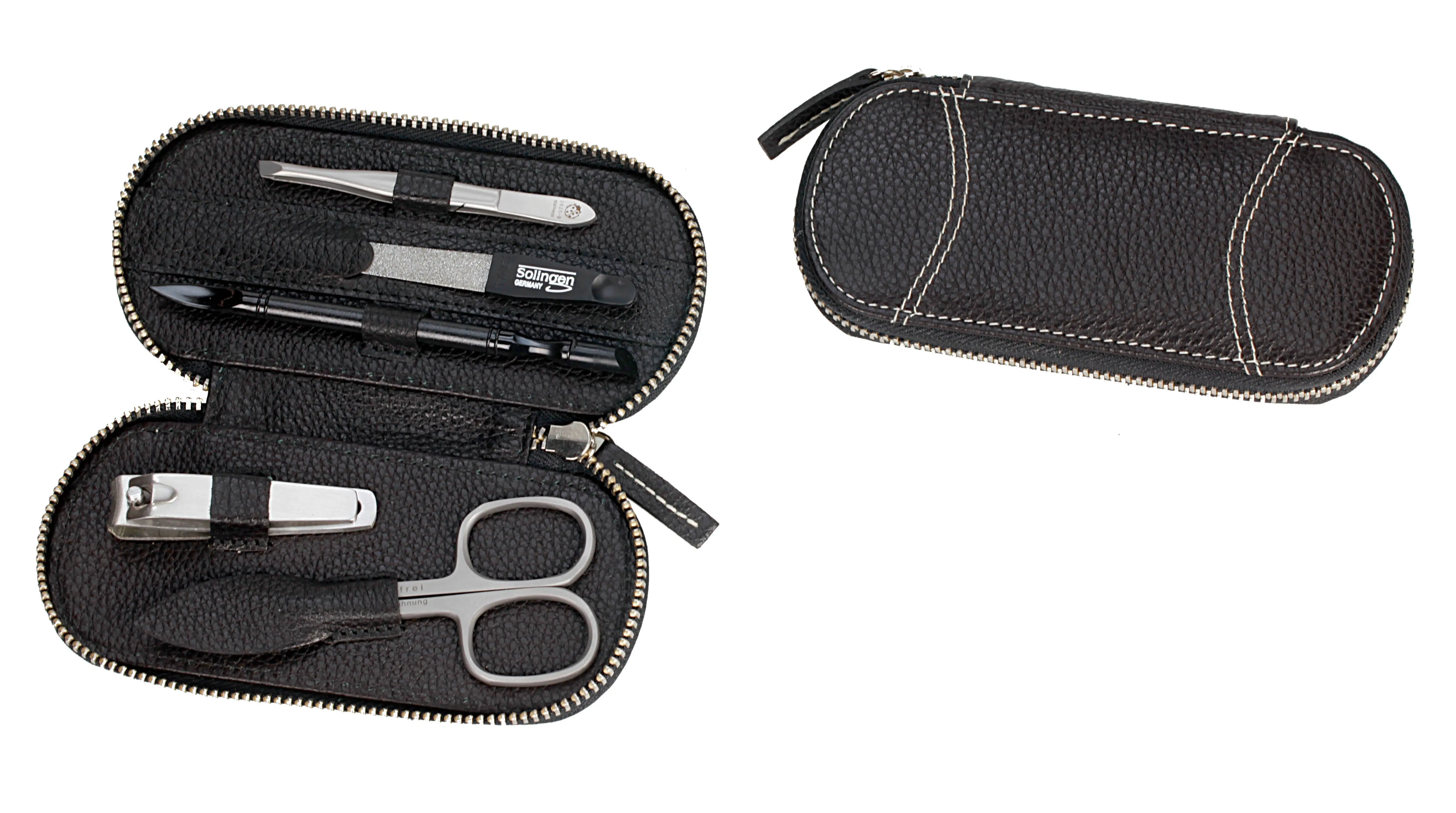 Produktinformationen "Manicure-Etui, Metall-Reißverschluss: 5-tlg. Bestückung, rostfrei-edelmattiert; echt Rindleder, schwarz mit Kontrastnähten"