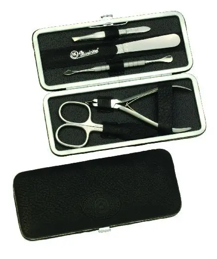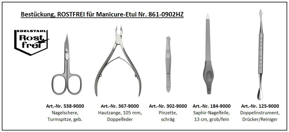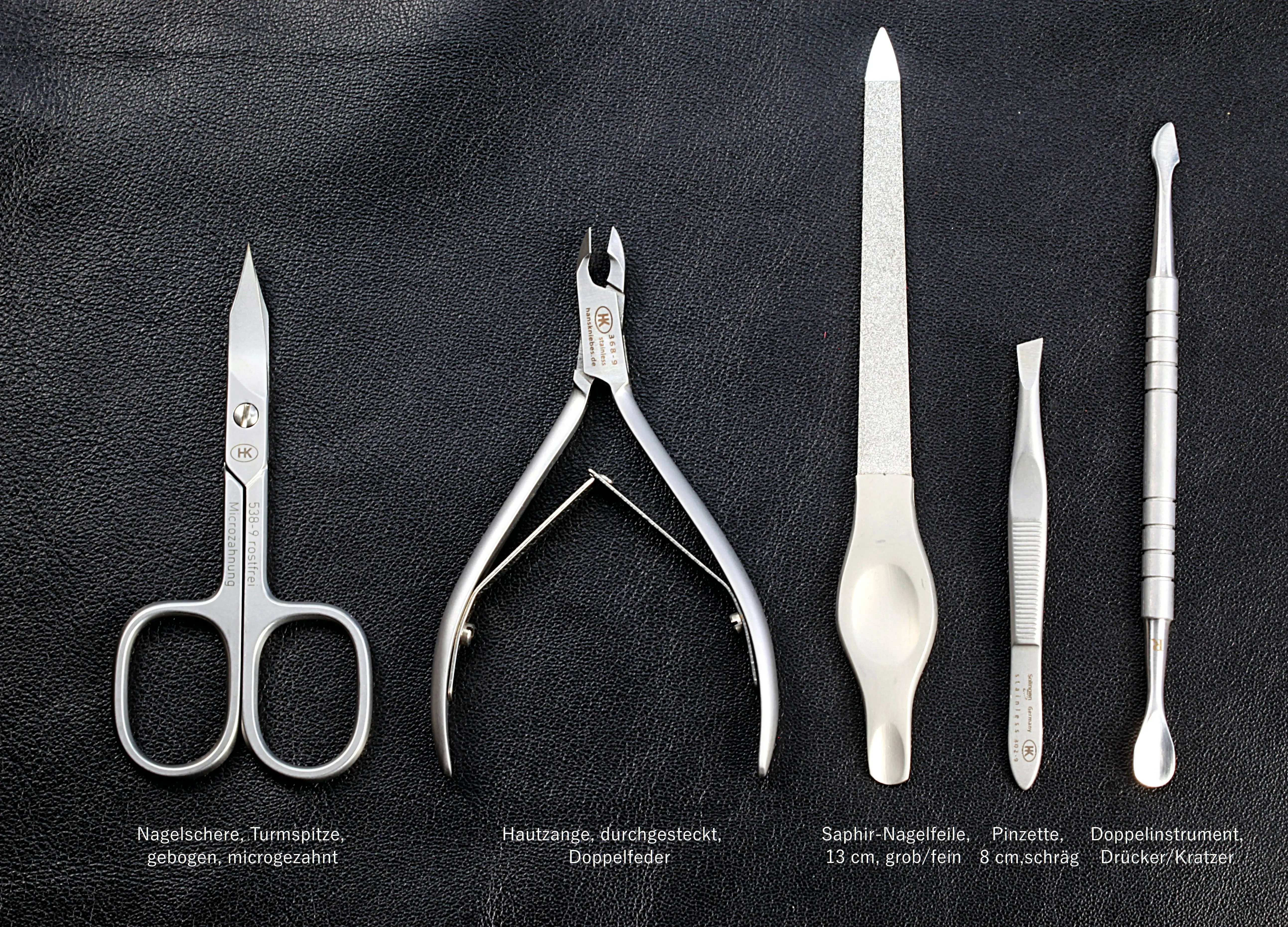 Die hochwertige Bestückung - ganz aus rostfreiem Edelstahl gearbeitet - umfasst folgende fünf HK-MANICURE Nagelpfelge-Instrumente: