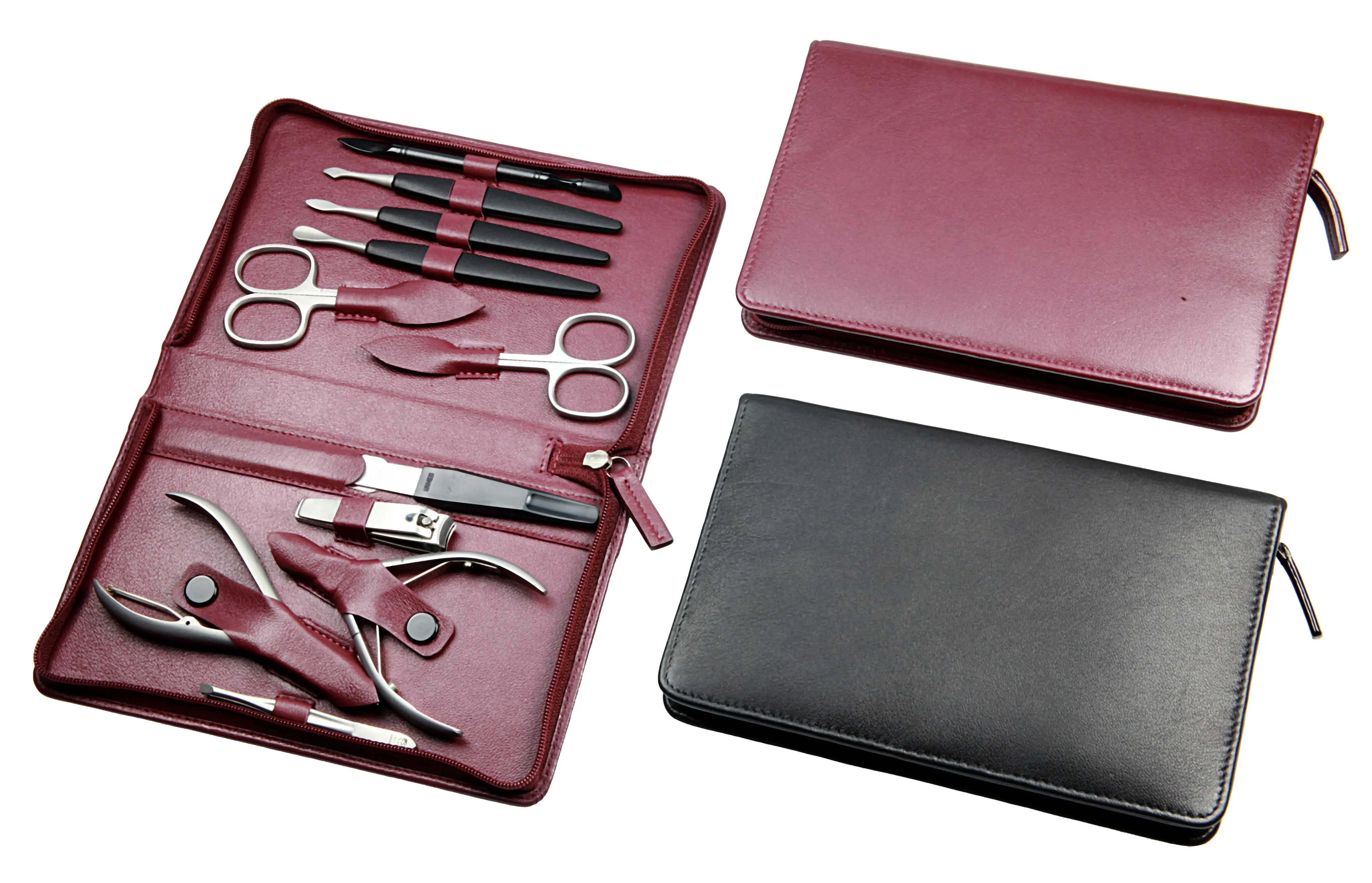 Ein Klassiker im zeitlosen Gewand: Dieses Reißverschluss-Etui aus feinem, bordeaux-farbenem Nappa-Lammleder mit seinem ebenmässigem, flachem Narbenbild verfügt über eine überaus komplette Bestückung mit elf hochwertigen Nagelpflegeinstrumenten aus rostfreiem Edelstahl in mattierter Ausführung: