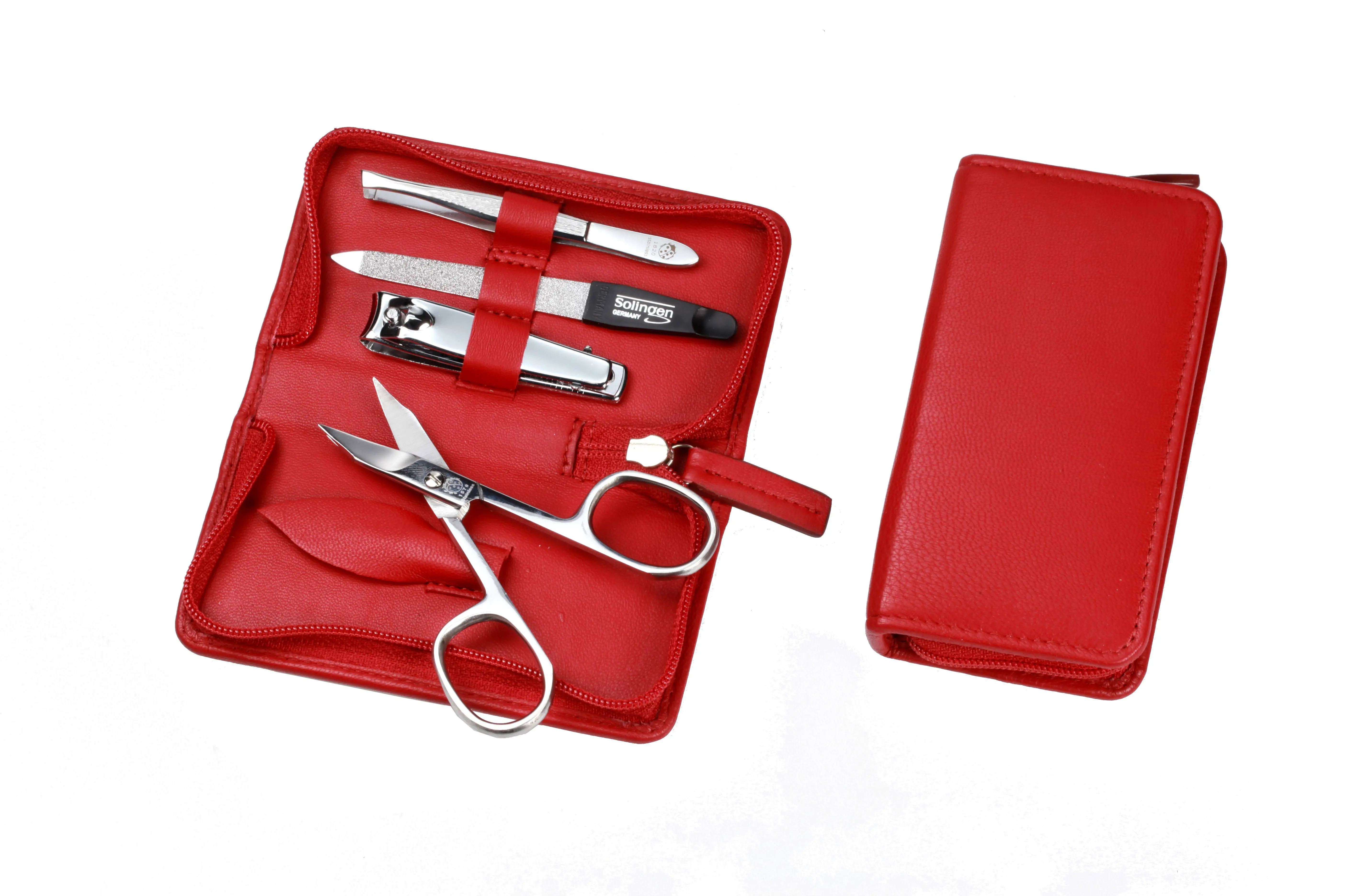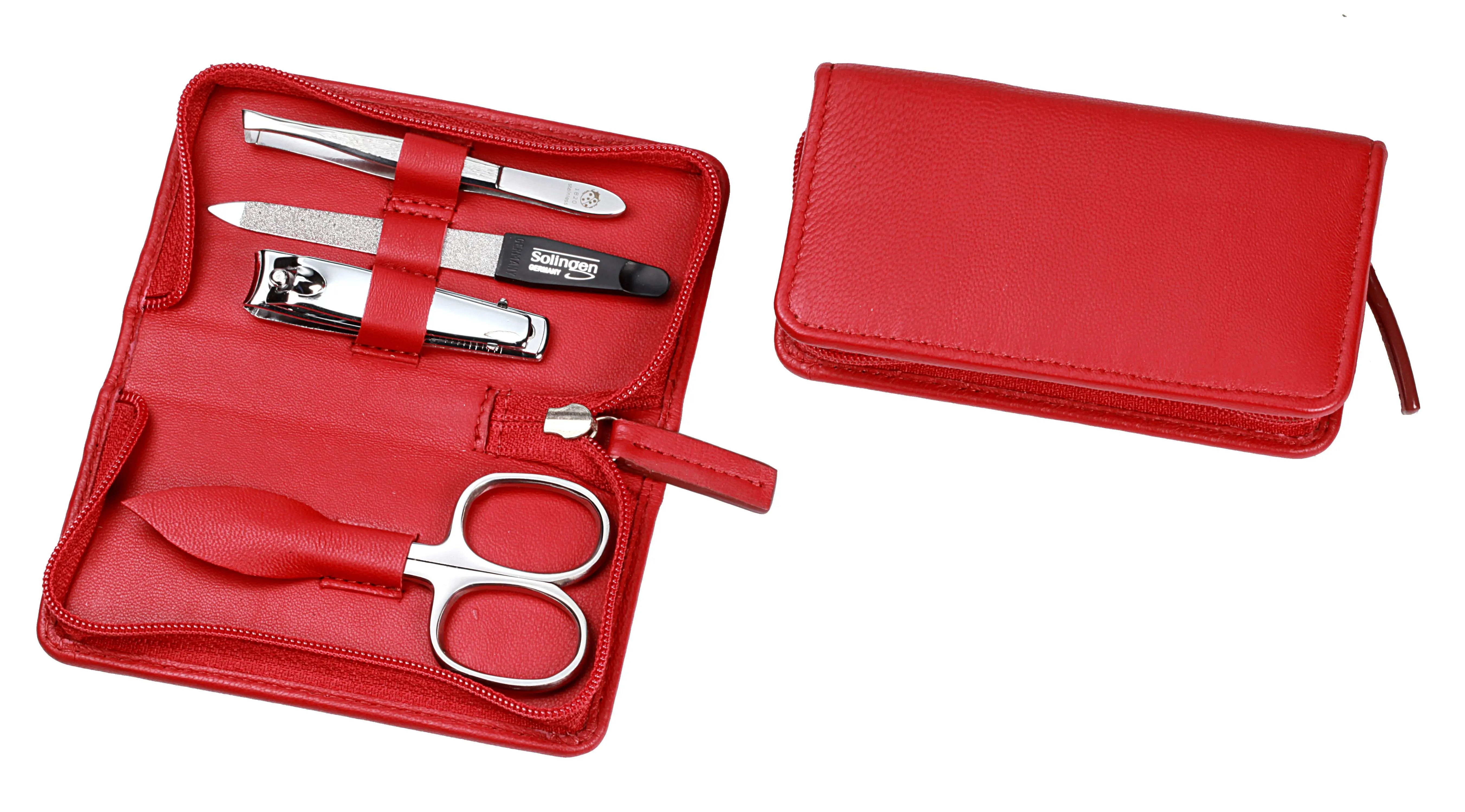 Produktinformationen "Manicure-Etui, Reißverschluss: 4-tlg. Bestückung, rostfrei-glanzpoliert; Nappa-Lammleder, rot"