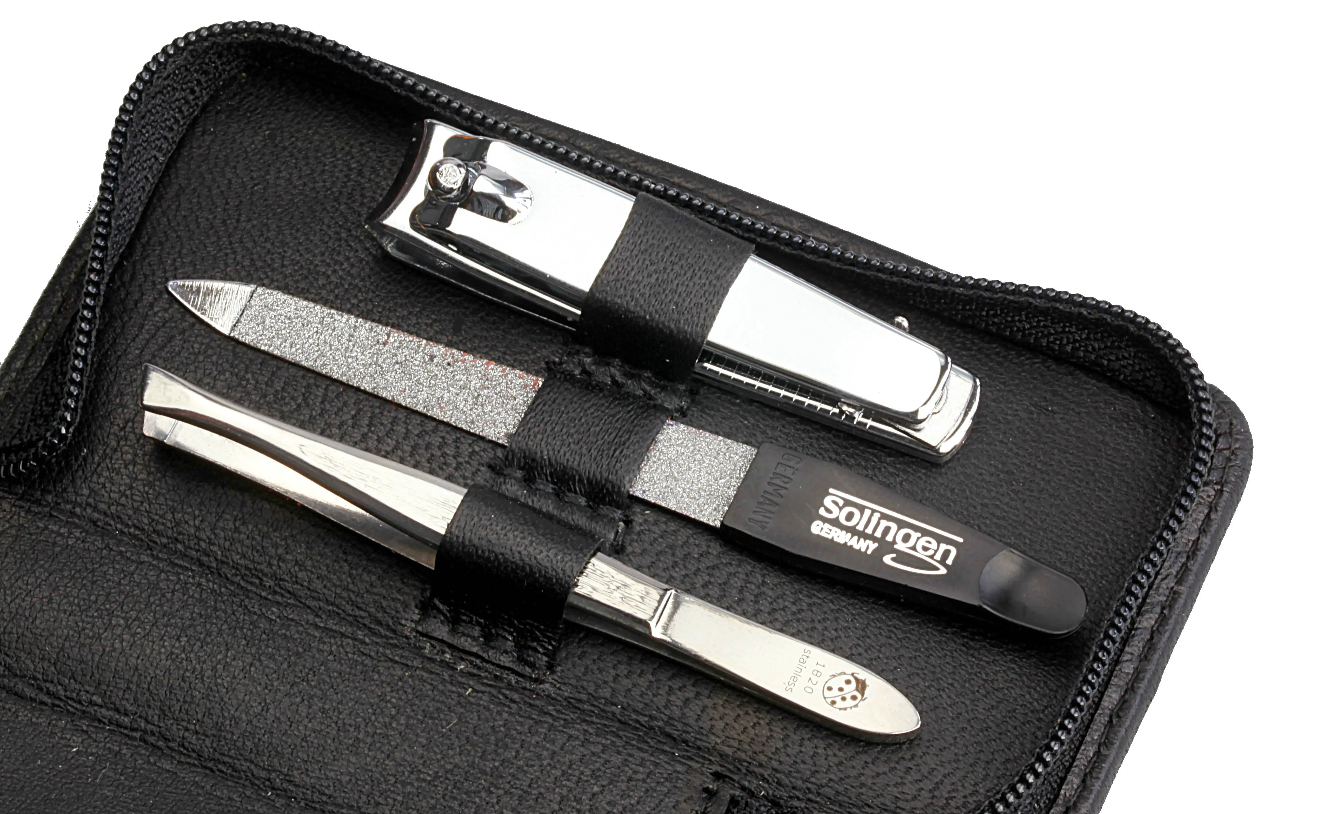 Ein Klassiker unserer Kollektion ist dieses Reißverschluss-Etui: Mit Liebe zum Detail ist es aus handschuhweichem Nappaleder in Farbe schwarz sorgfältig gefertigt. Schlicht im Design und kompakt in seinen Abmessungen, kann es durch die "inneren Werte" überzeugen! Es beinhaltet vier hochwertige Nagelpflege-Instrumente in bewährter SONNENSCHEIN-Markenqualität, die aus rostfreiem Esdelstahl in glanzpolierter Ausführung gefertigt sind: