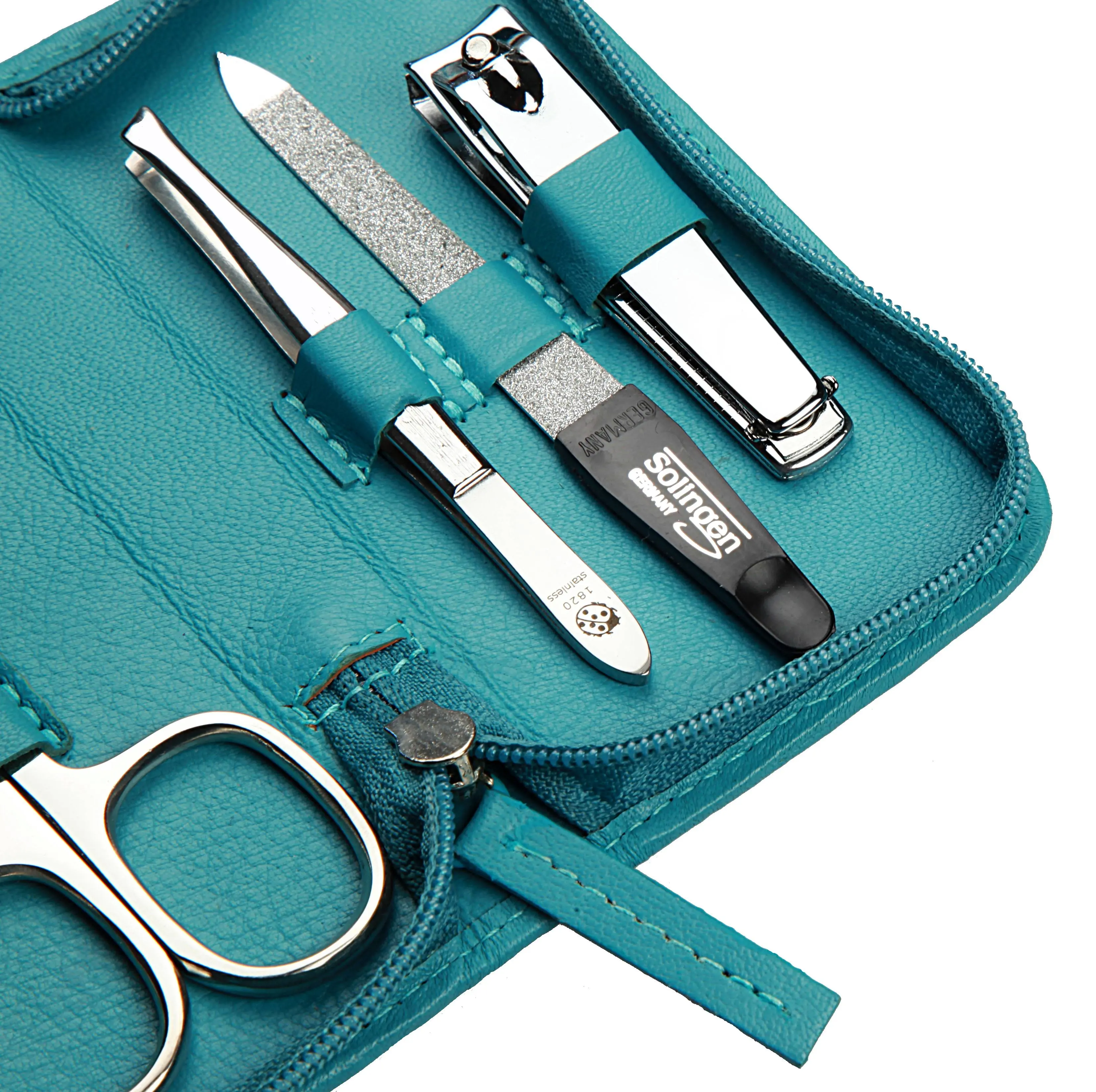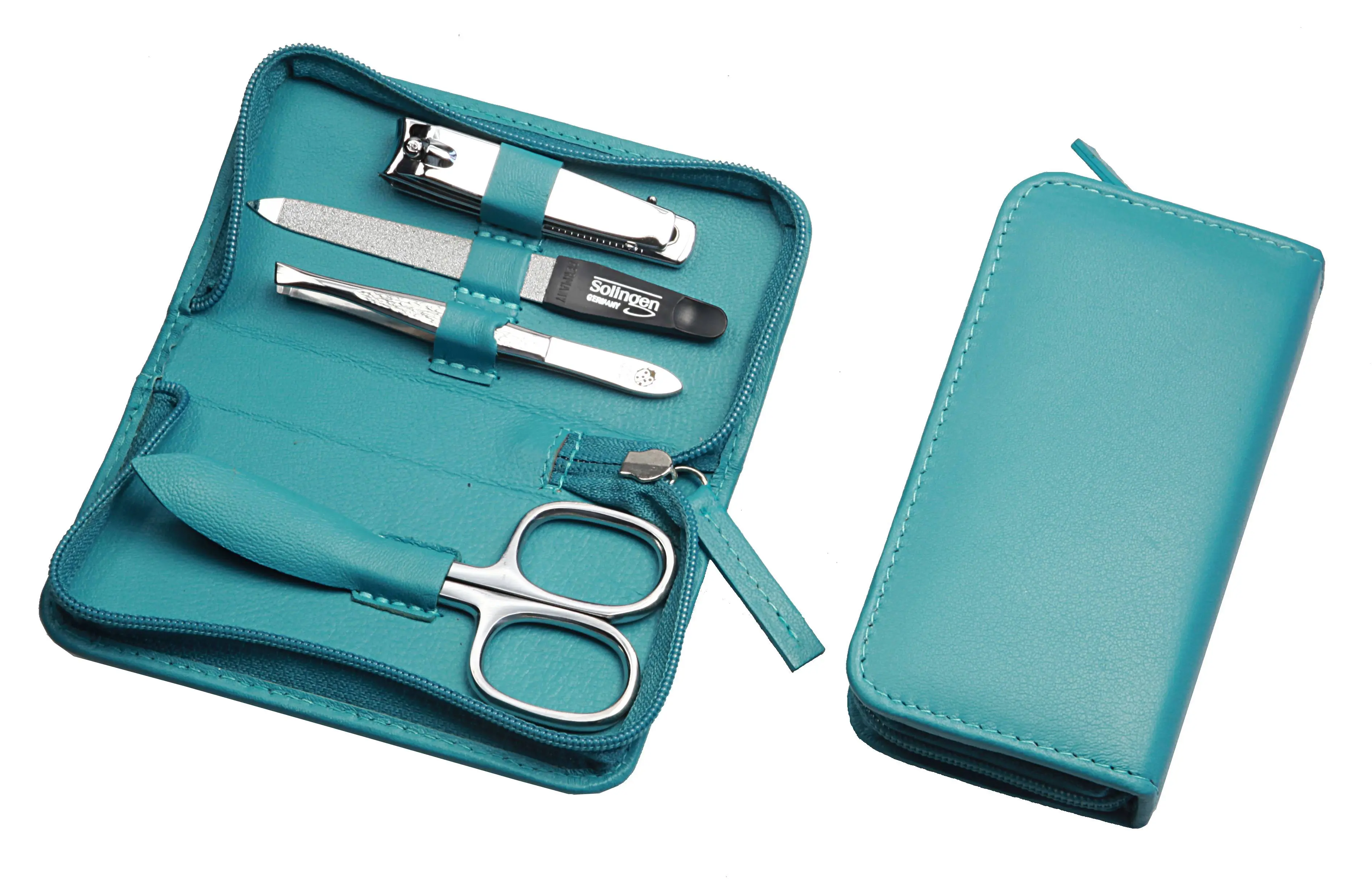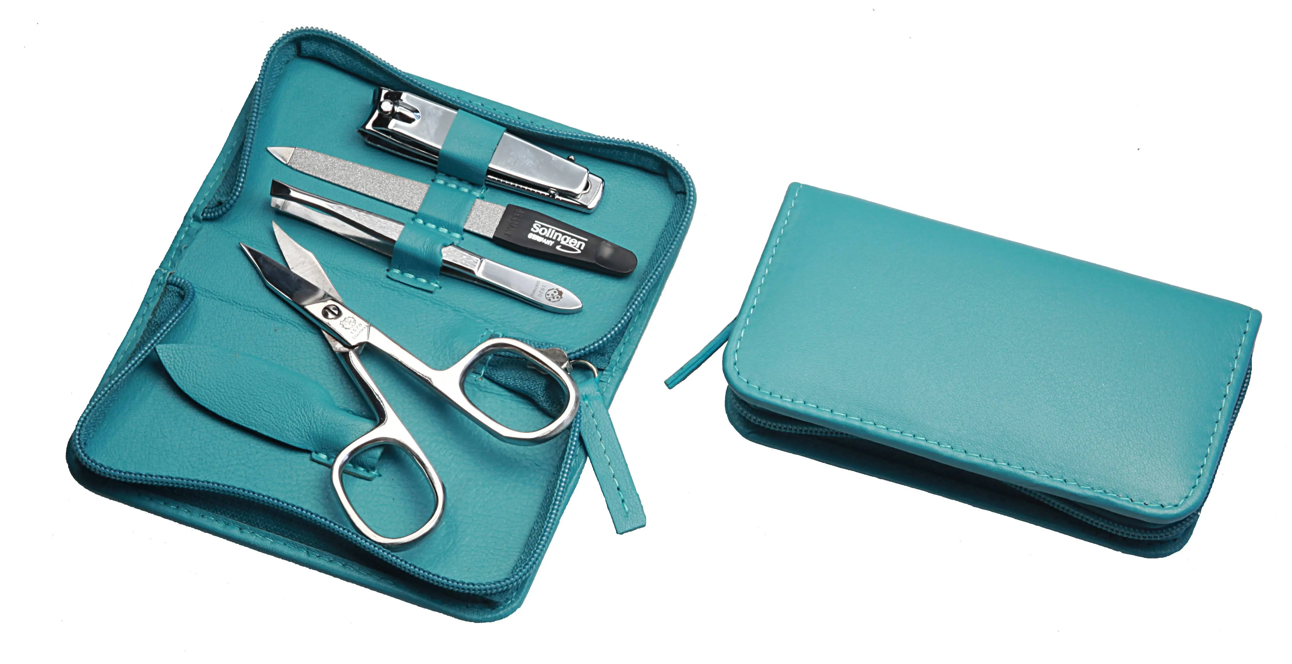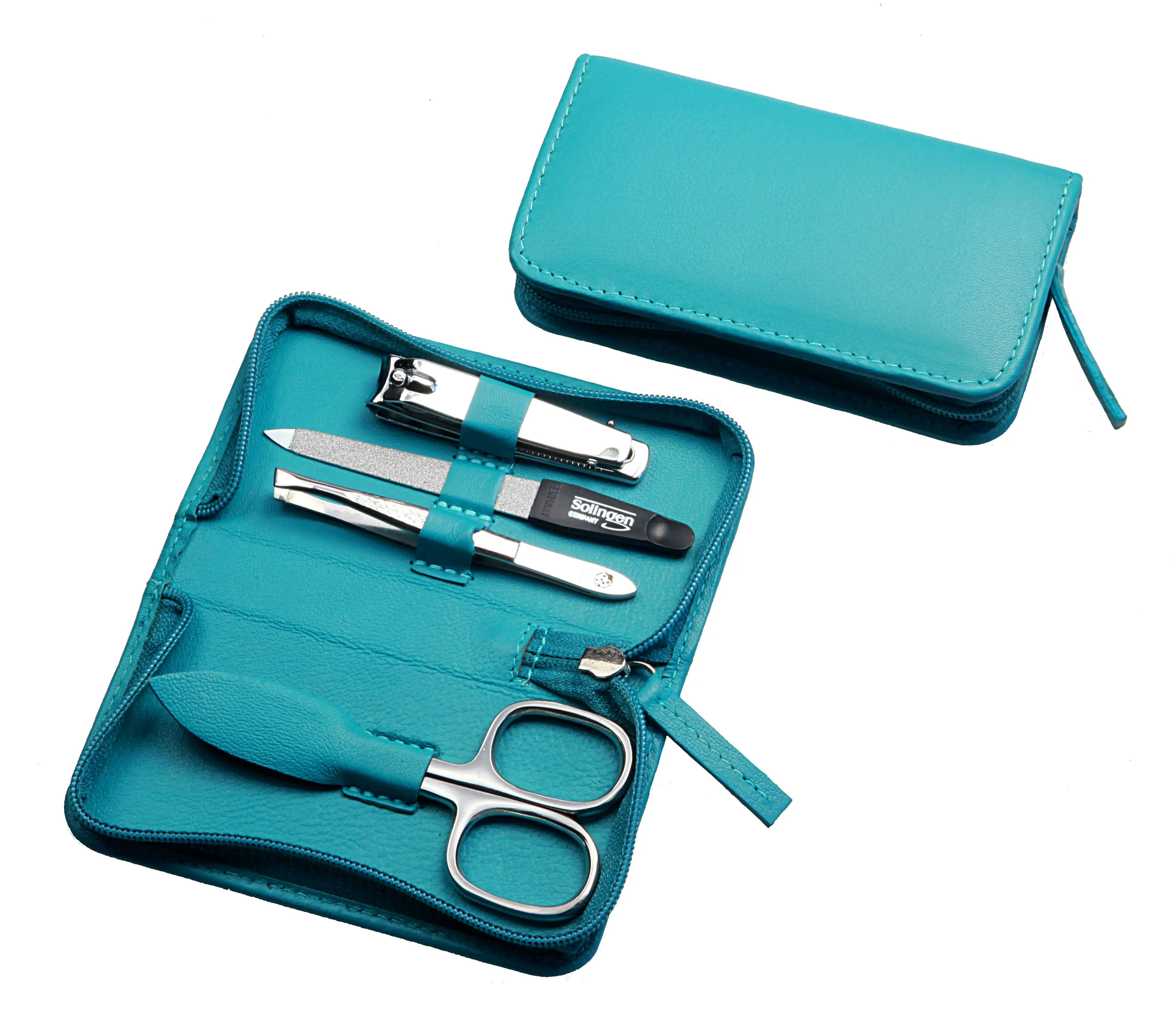 Produktinformationen "Manicure-Etui, Reißverschluss: 4-tlg. Bestückung, rostfrei-glanzpoliert; Nappa-Lammleder, türkis"