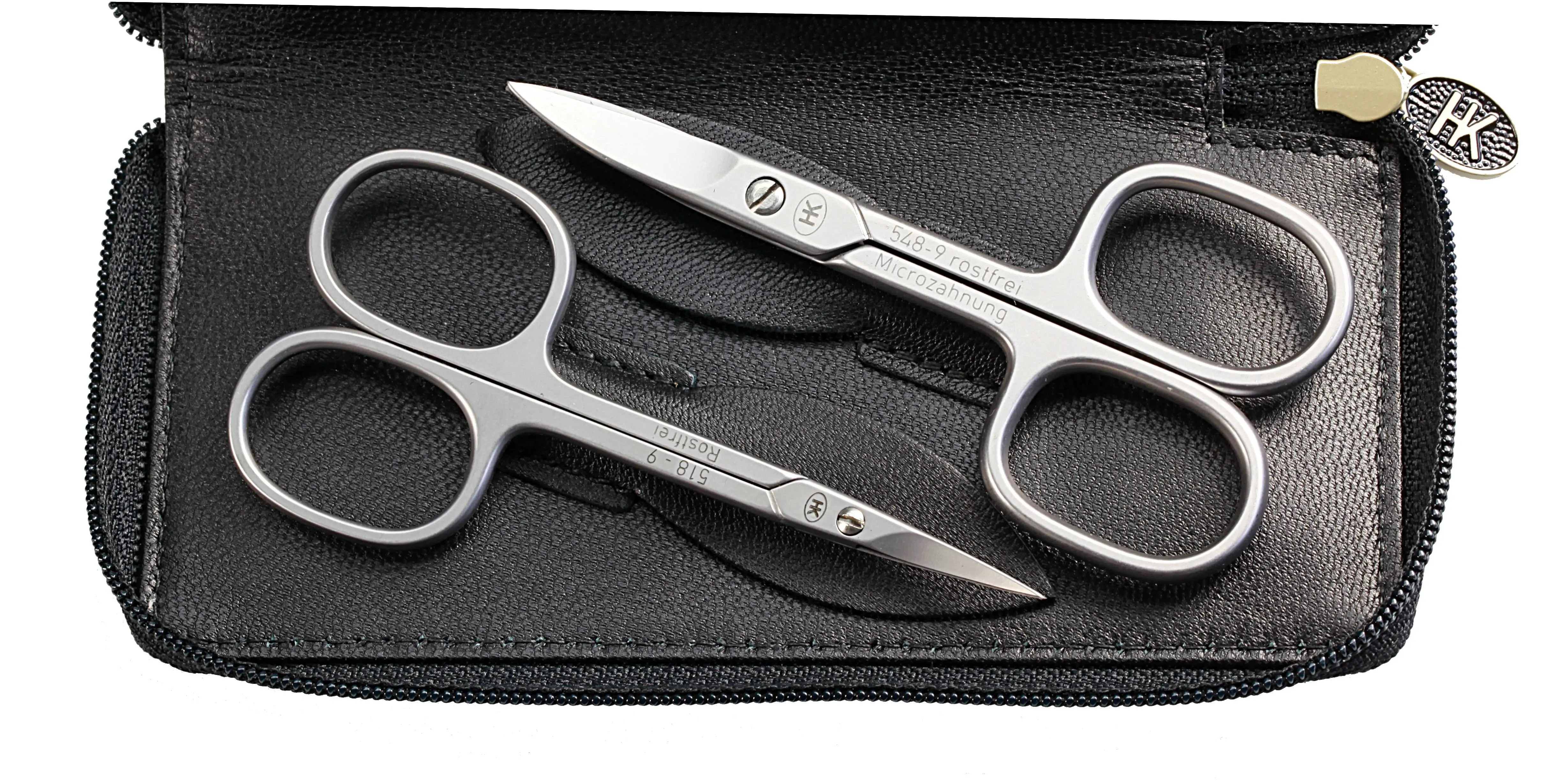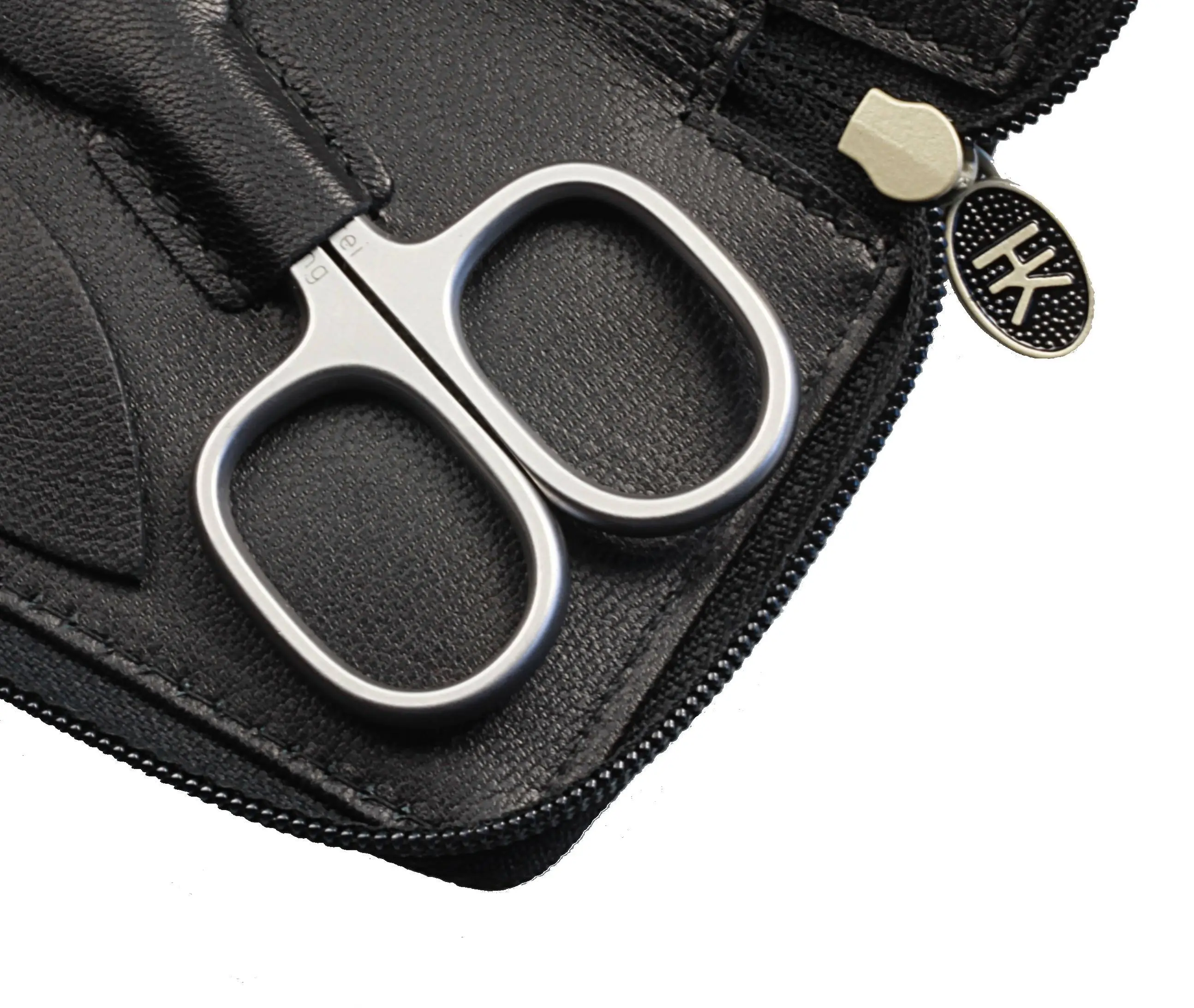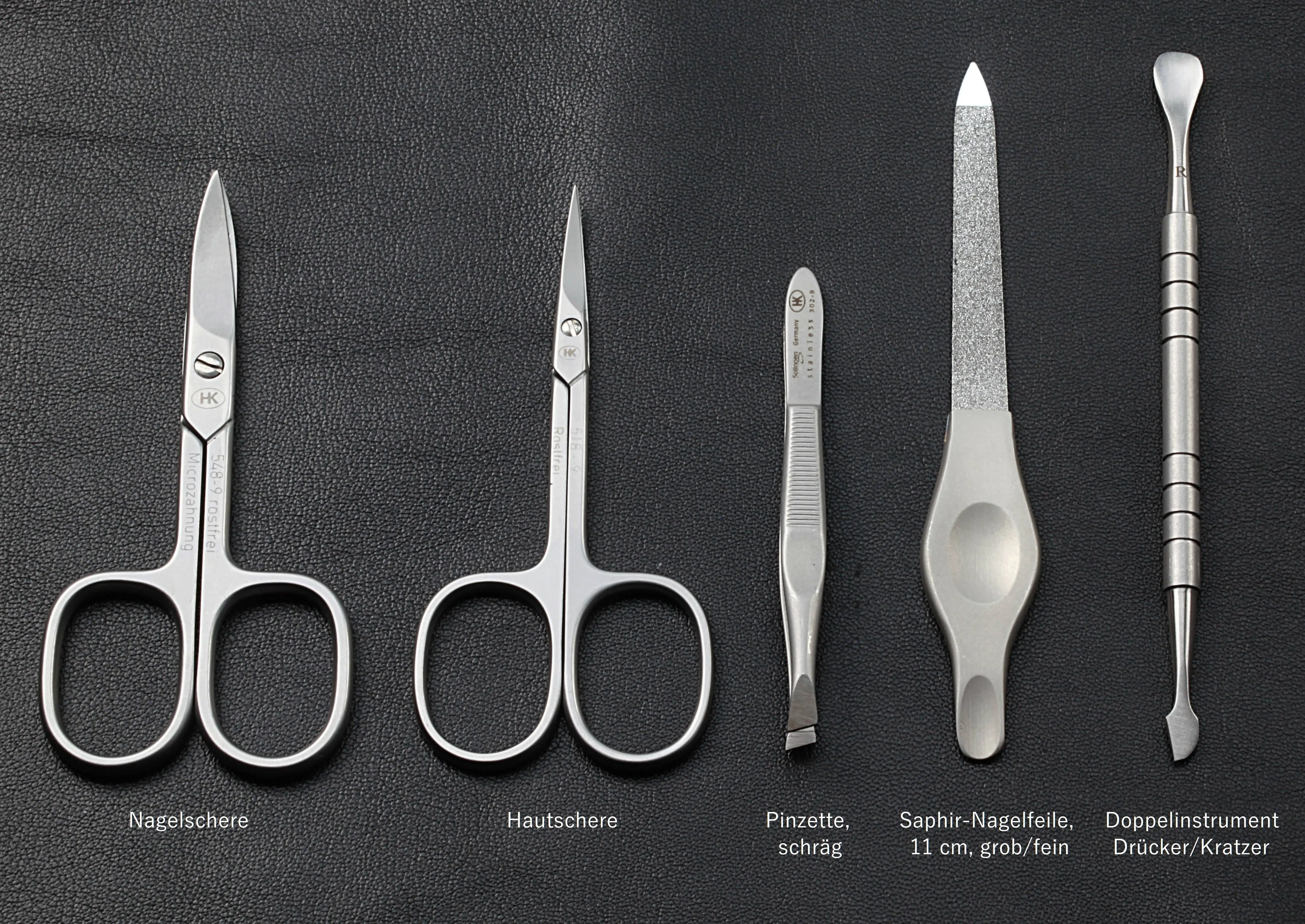 Weiche Schale, harter Kern! Dieses ohne stärkende Kartoneinlage weich und flexibel gearbeitete Manicure-Etui mit Reißverschluss beinhaltet die folgenden hochwertigen HK-MANICURE Nagelpflege-Instrumente: