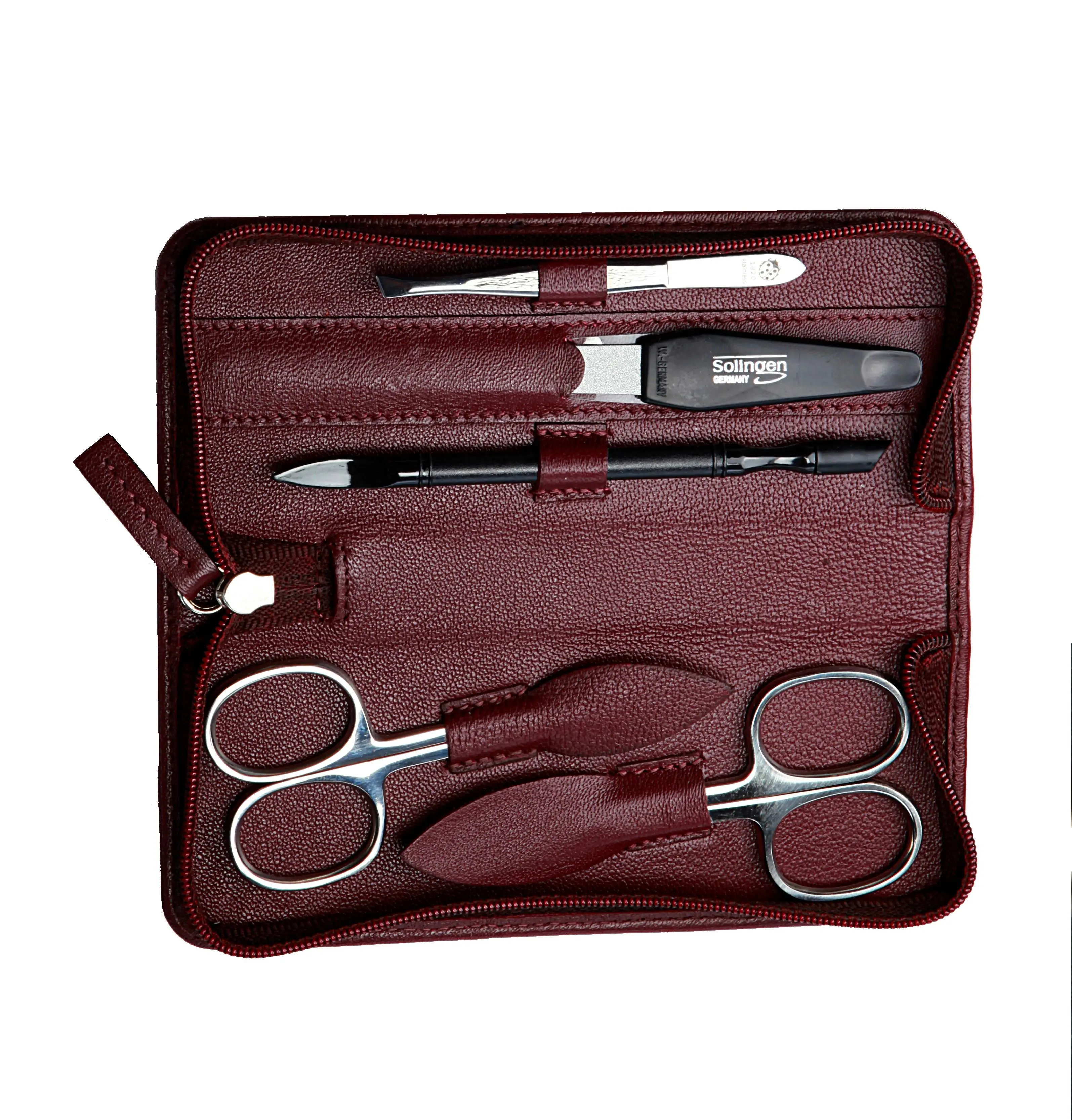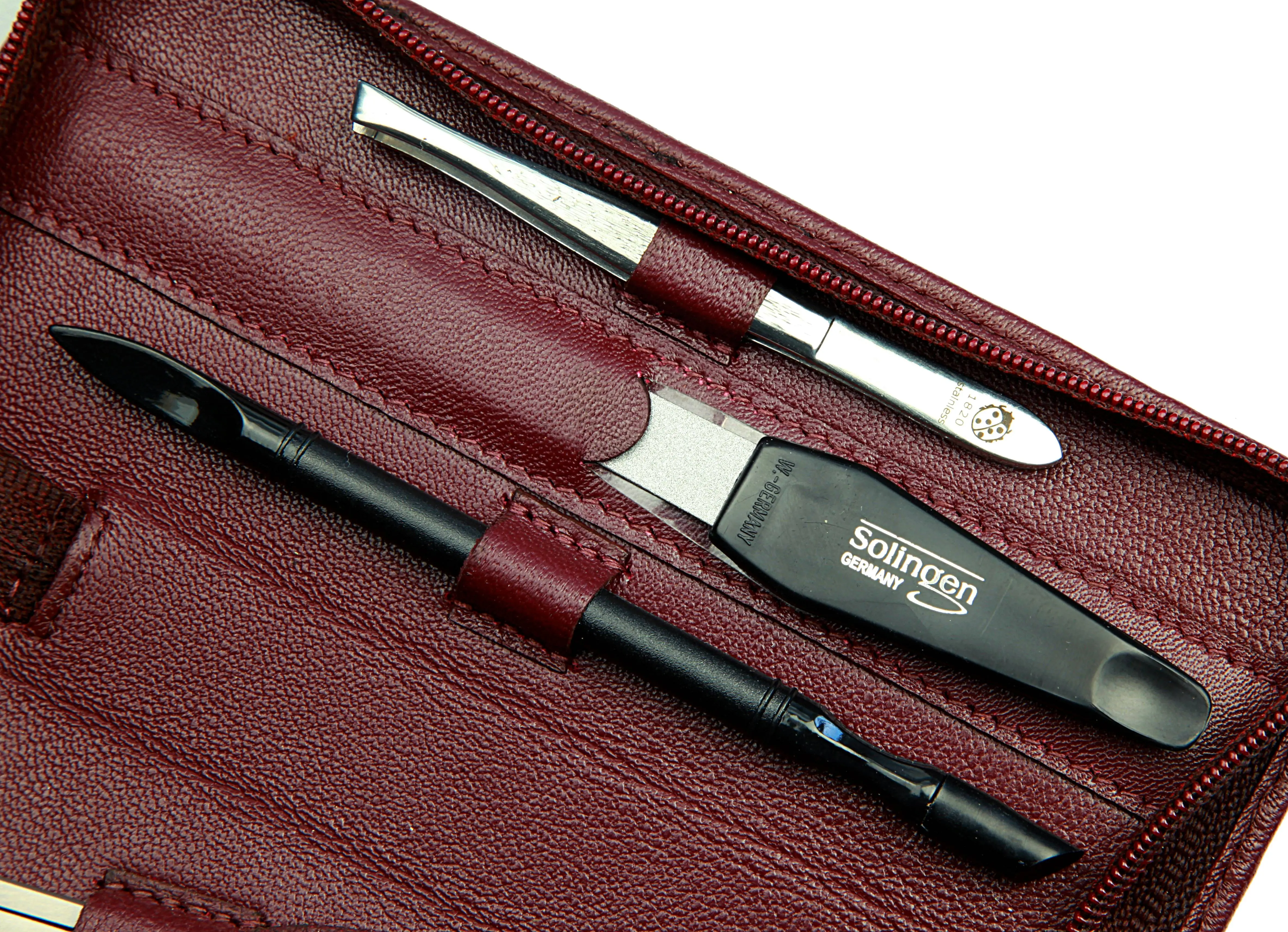 Produktinformationen "Manicure-Etui, Reißverschluss: 5-tlg. Bestückung, rostfrei-glanzpoliert; Nappa-Lammleder, bordeaux"