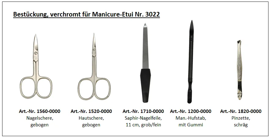 Kompakt, von schlichter Eleganz und überaus praktisch ist dieses Manicure-Etui. Es beinhaltet die folgenden fünf hochwertigen Nagelpflegeinstrumente in bewährter SONNENSCHEIN-Markenqualität, die sorgfältig aus rostfreiem Edelstahl in glanzpolierter Optik gefertigt sind: