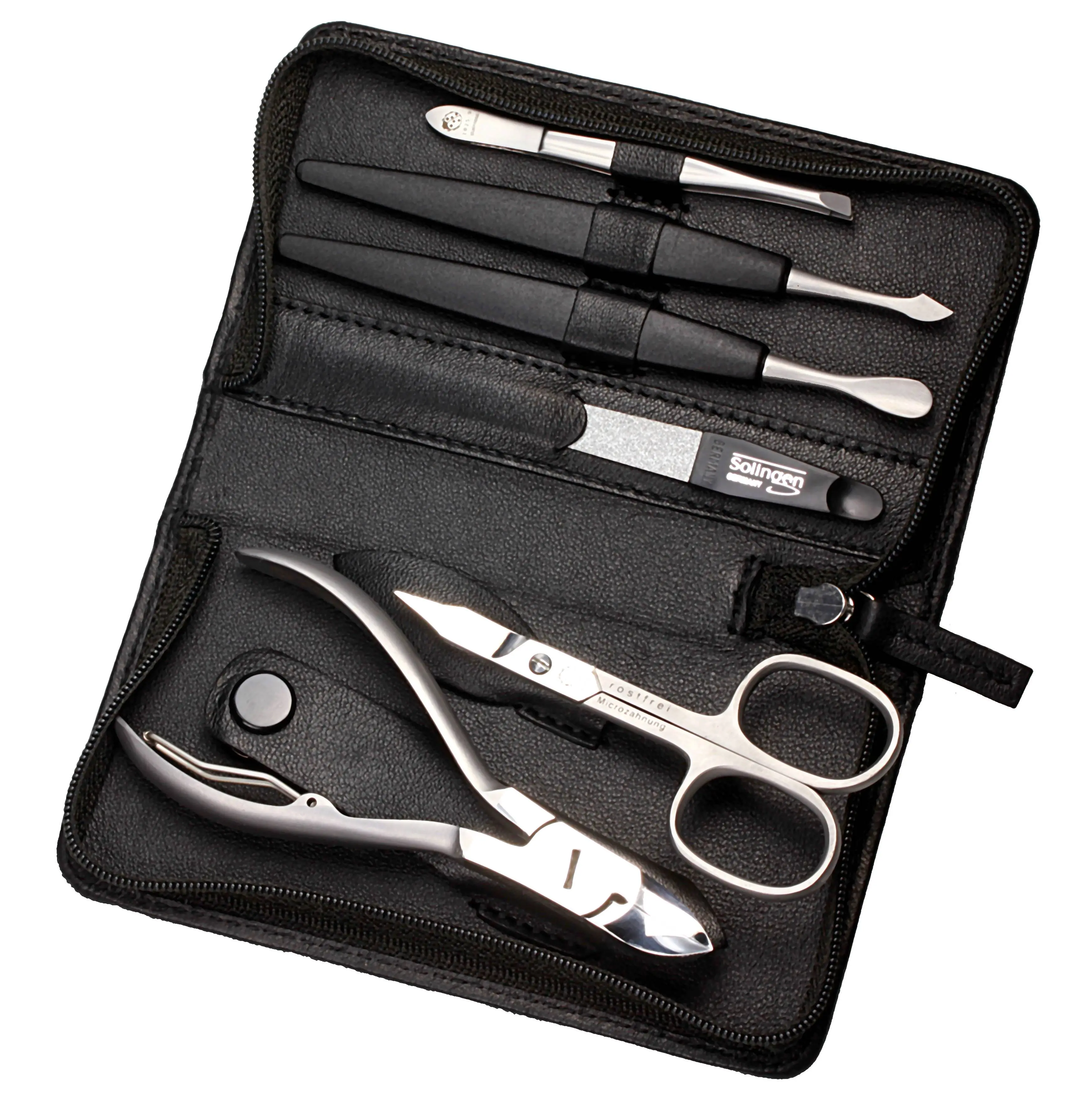 Zeitlos elegant ist dieses klassische Modell mit Nylon-Reißverschluss: Aus weichem Nappa-Lammleder in tiefem Schwarz sorgfältig von Hand gefertigt, beinhaltet es sechs hochwertige Nagelpflegeinstrumente aus rostfreiem Edelstahl in mattierter Ausführung: