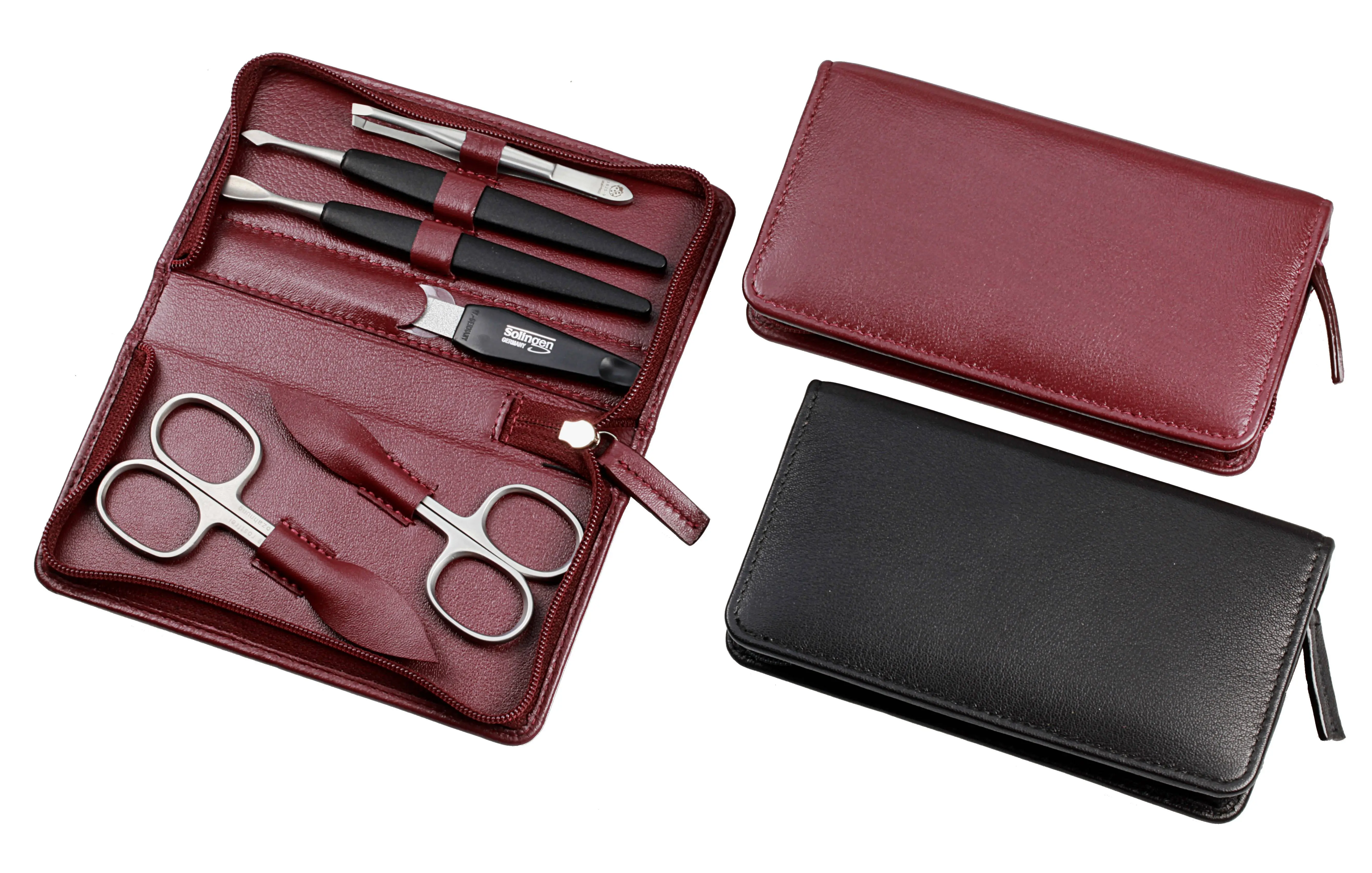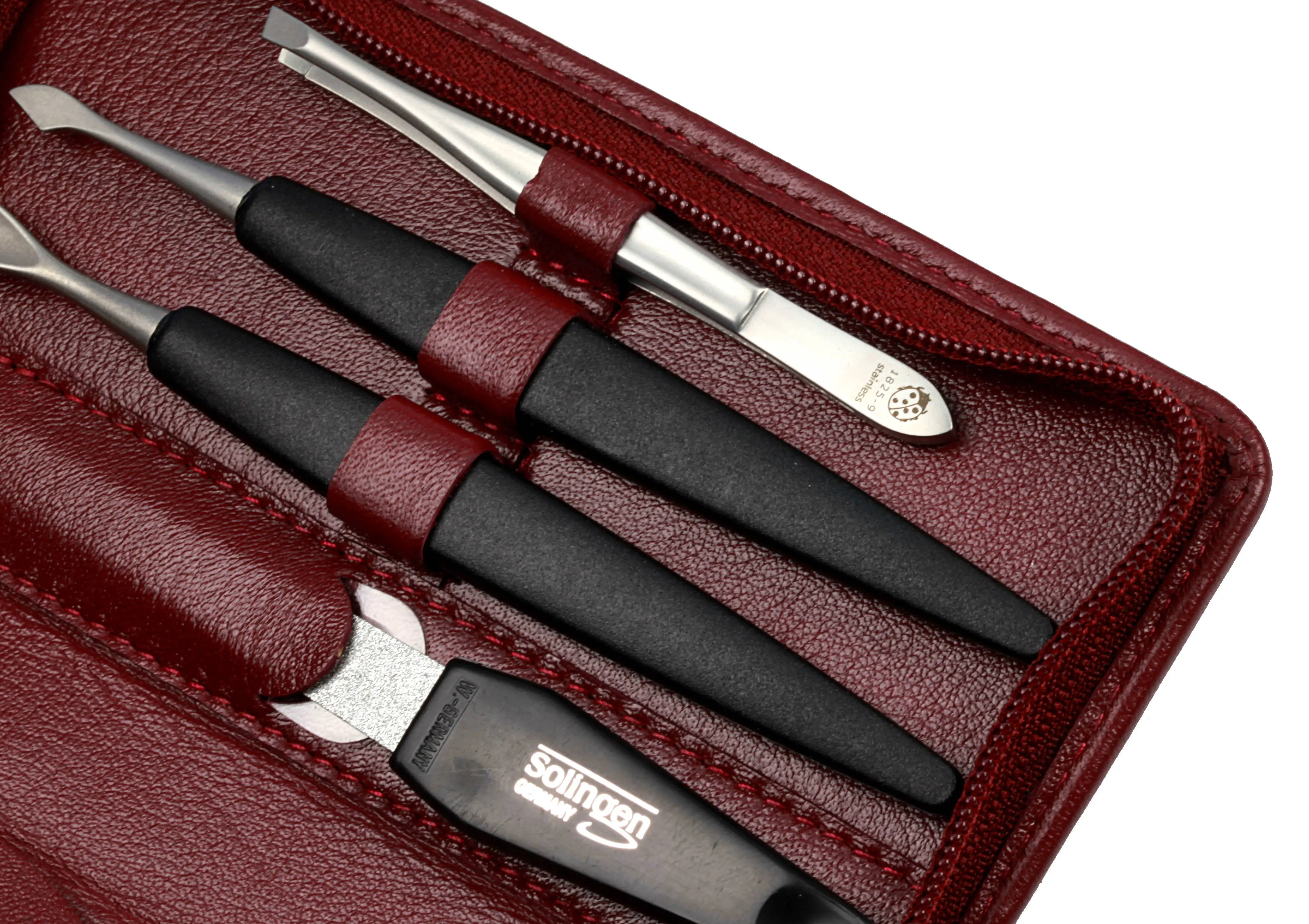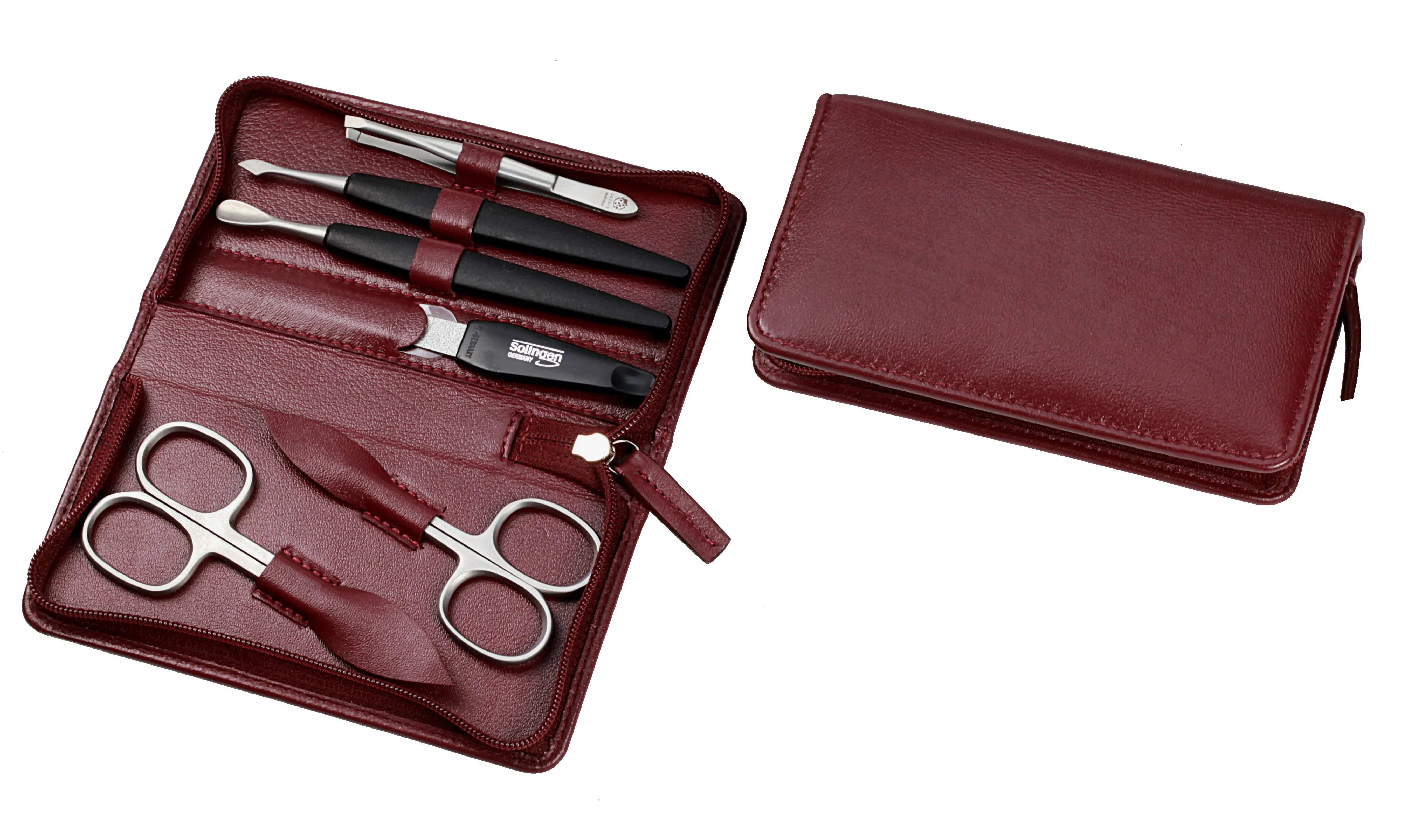 Zeitlos elegant ist dieses klassische Modell mit solidem Nylon-Reißverschluss: Aus weichem Nappa-Lammleder in einem warmen bordeaux-Ton sorgfältig von Hand gefertigt, beherbergt es sechs hochwertige Nagelpflegeinstrumente in bewährter SONNENSCHEIN-Markenqualität, die aus einem rostfreien Edelstahl gefertigt sind und eine mattierte, blendfreie Oberfläche haben: