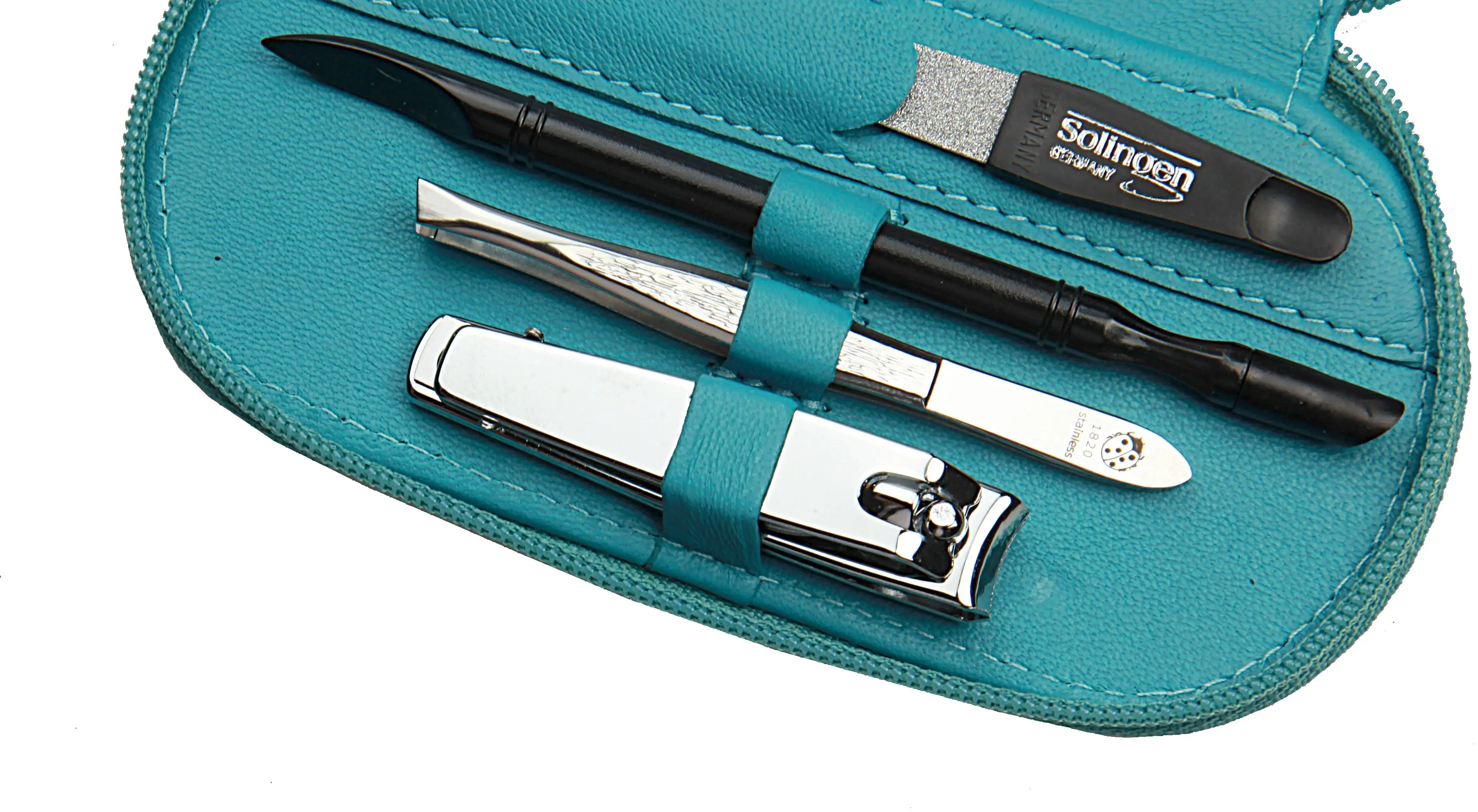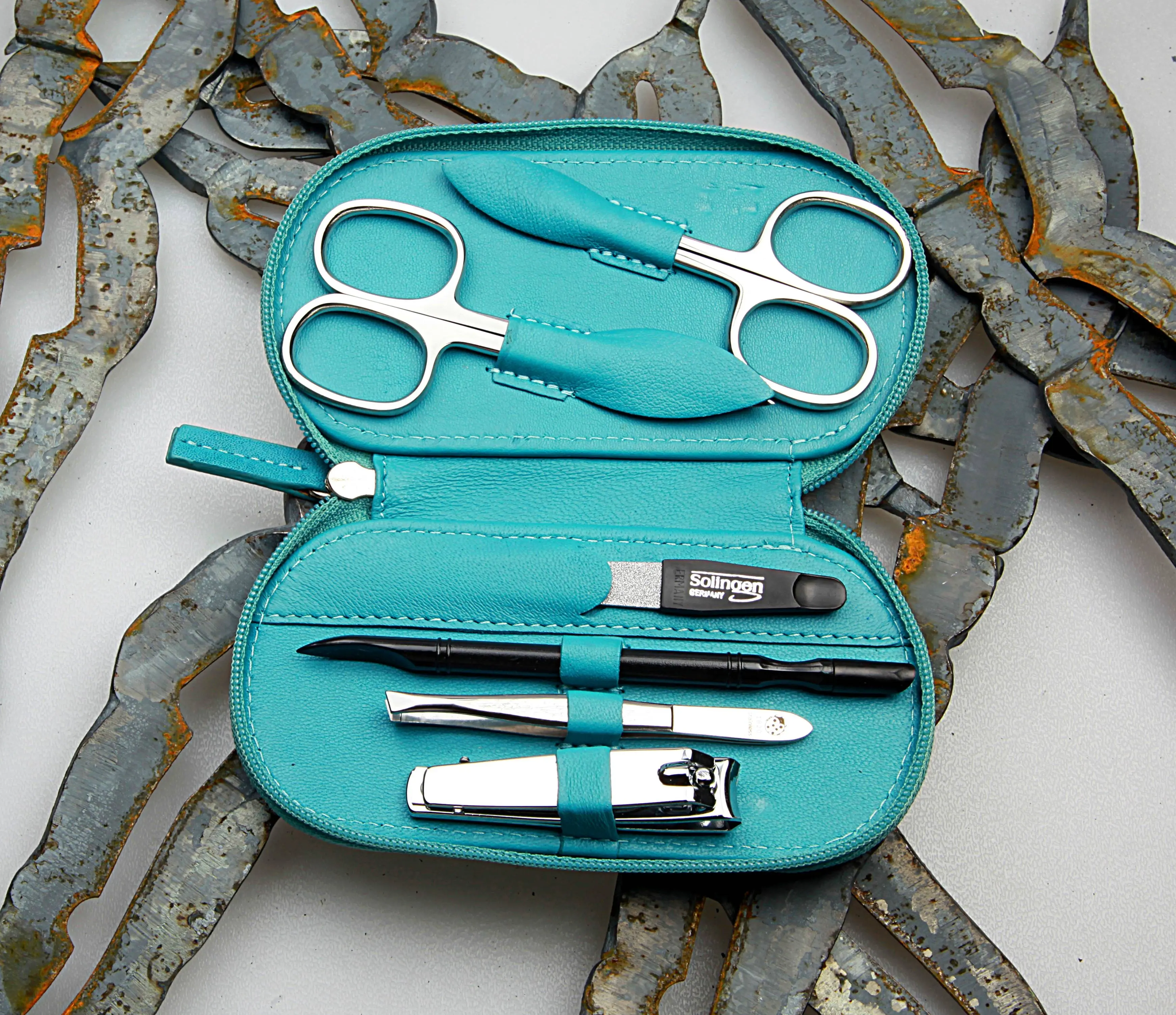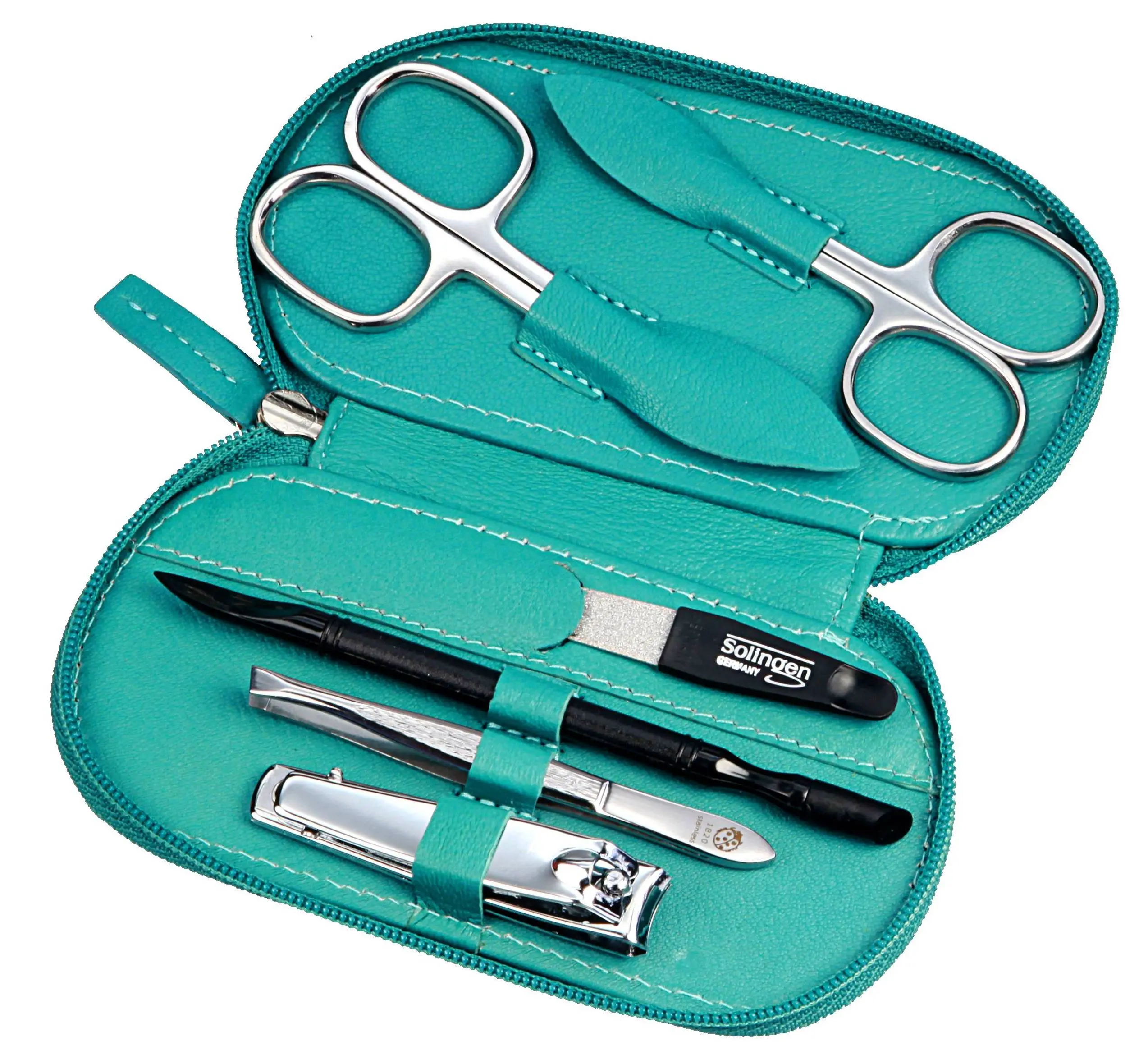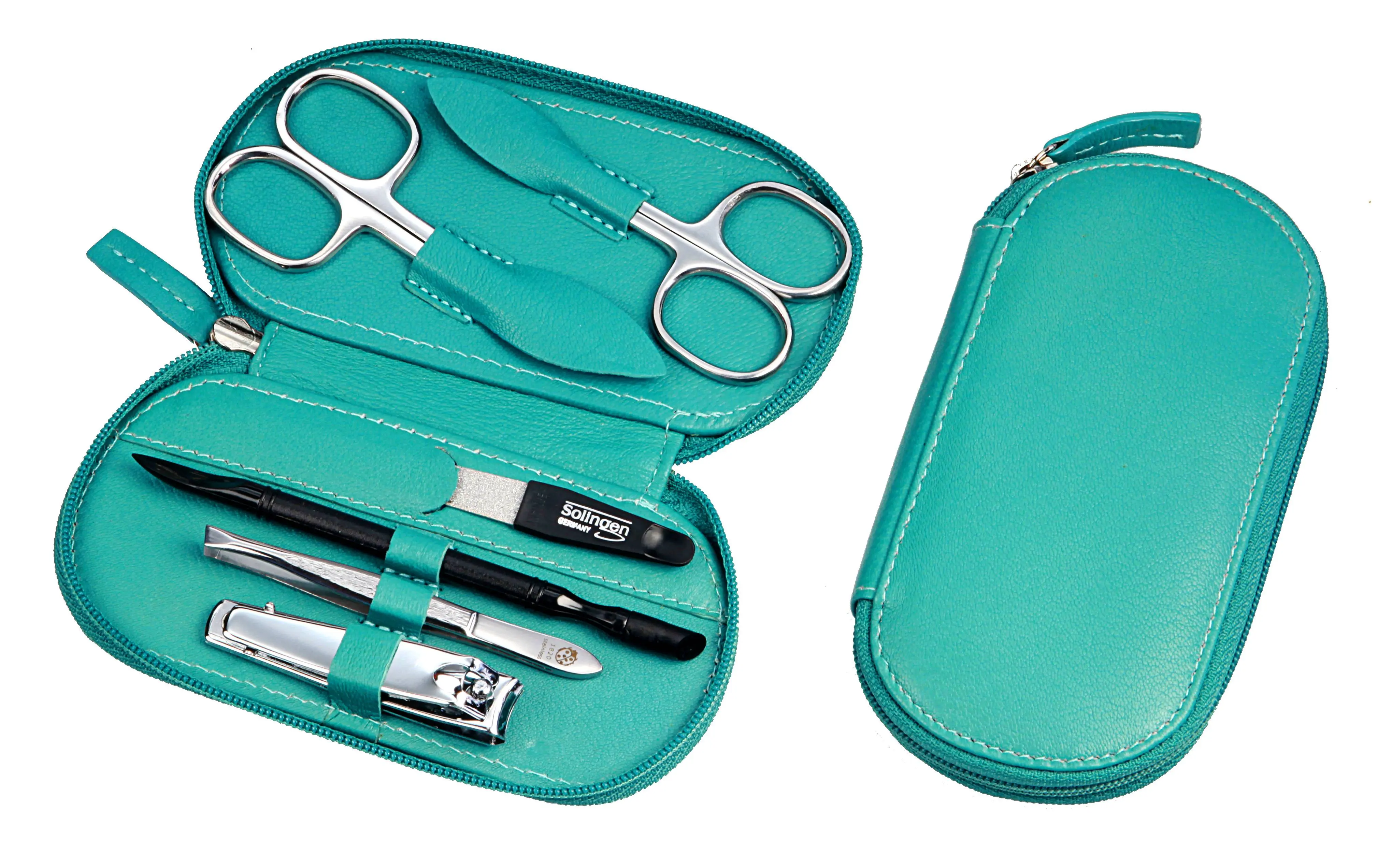 Produktinformationen "Manicure-Etui, Reißverschluss: 6-tlg. Bestückung, rostfrei-glanzpoliert; Nappa-Lammleder, türkis"