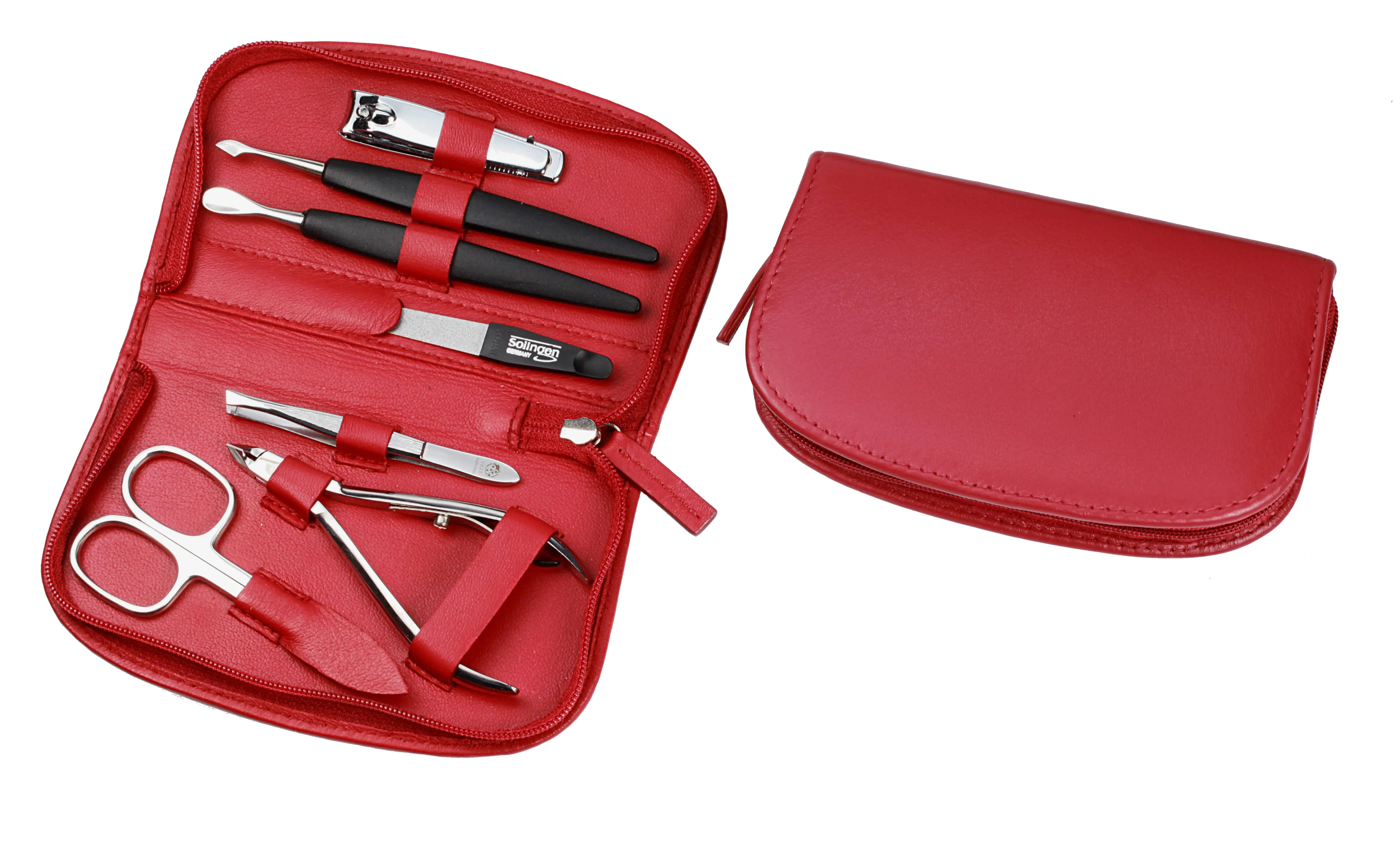 Denken Sie bei Reißverschluss-Etuis auch immer an eher schlichte, nicht gerade ausgefallene Formen? Mit diesem Vorurteil räumt dieses Modell ganz bestimmt für immer auf! Die elegant geschwungene Linieführung dieses Etuis wirkt leicht und souverän. Aus weichem Nappa-Lammleder in frischem Rot sorgfältig von Hand gefertigt, beherbergt dieses Etui sieben hochwertige Nagelpflegeinstrumente in bewährter SONNENSCHEIN-Markenqualität, die aus rostfreiem Edelstahl mit glanzpolierter Oberfläche gefertigt sind. Dabei ist die zumeist in Etuis enthaltene Hautschere bei diesem Modell bewusst durch eine Hautzange ersetzt worden:
