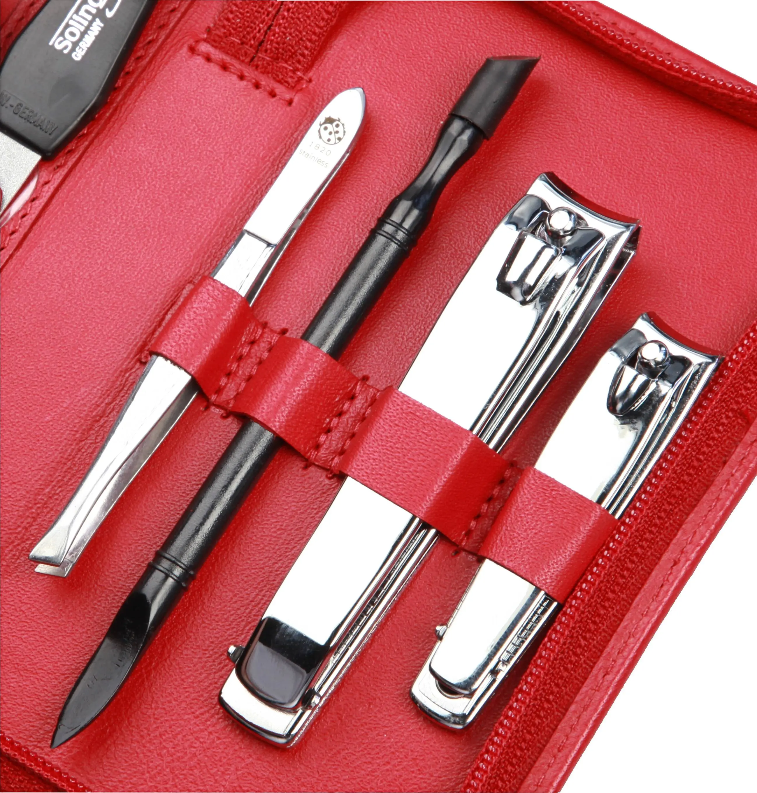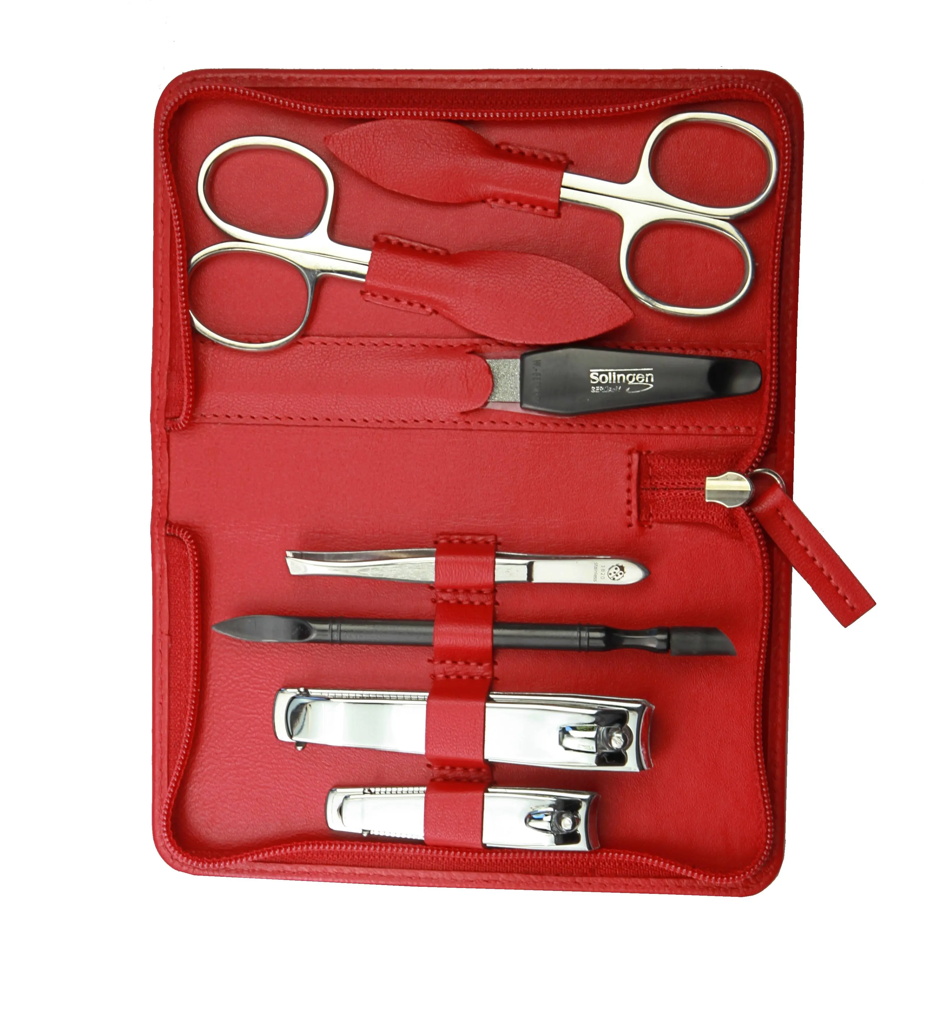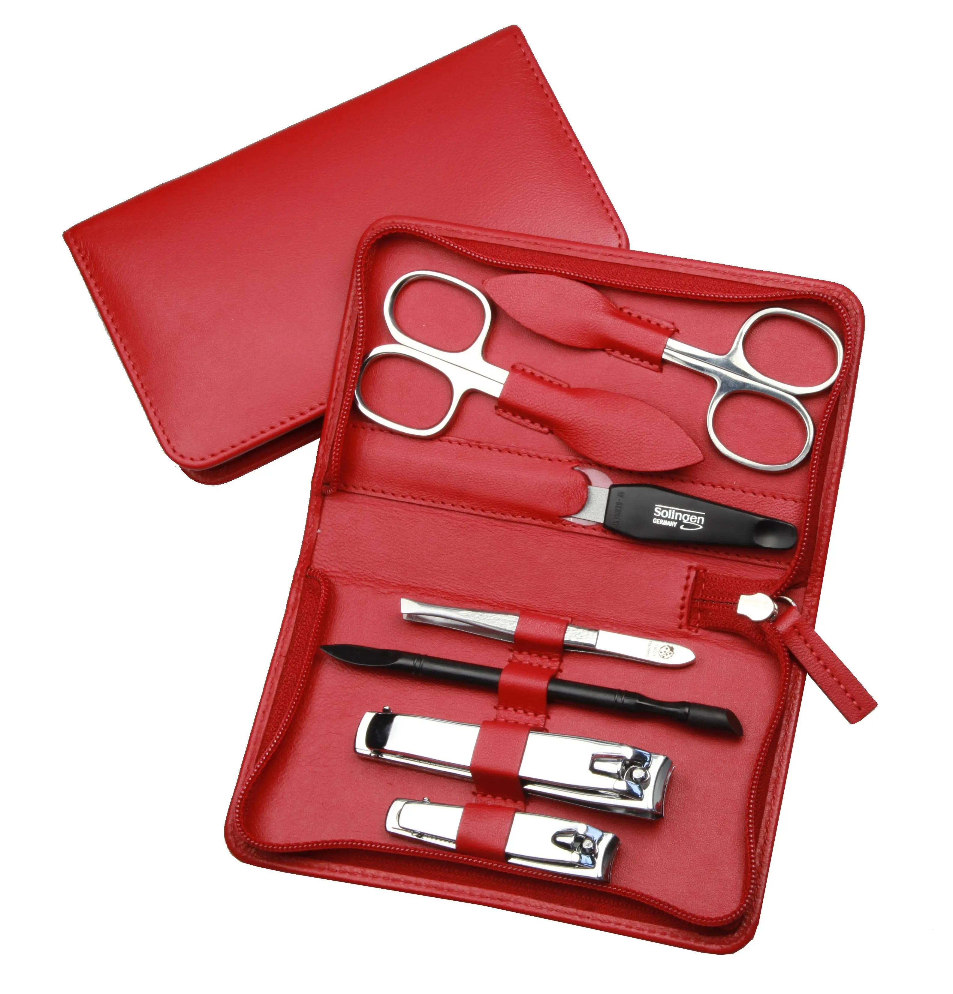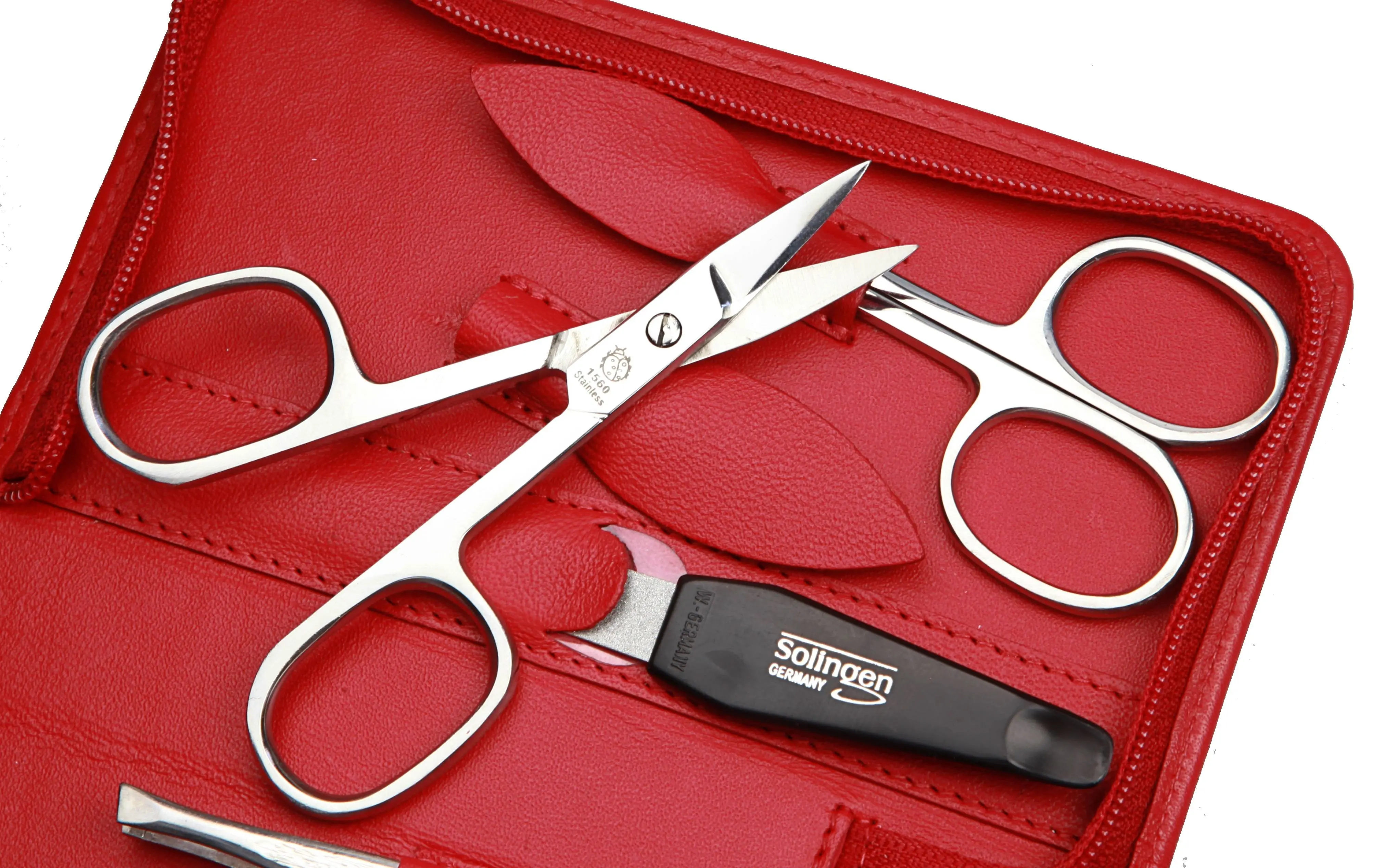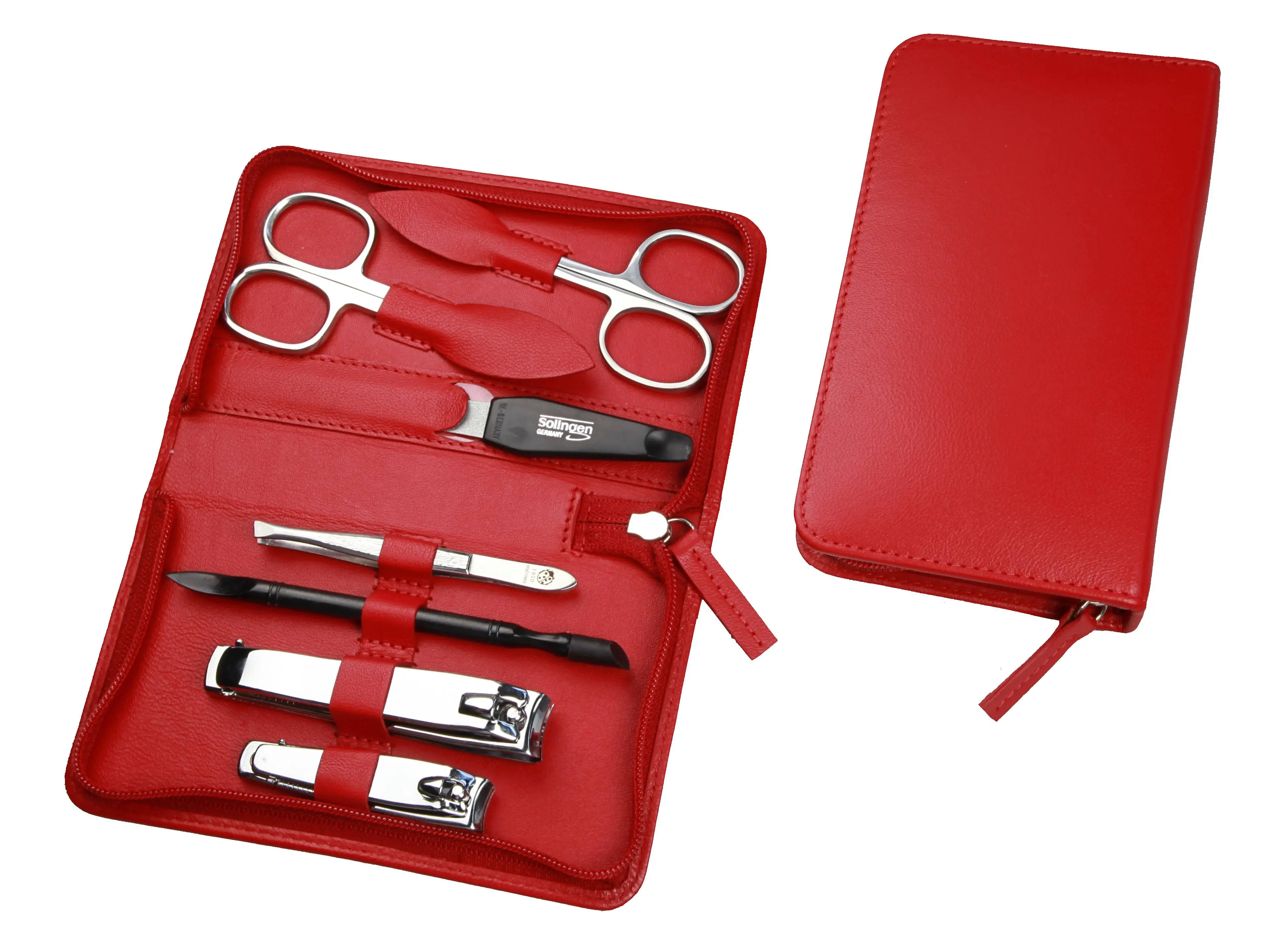 Produktinformationen "Manicure-Etui, Reißverschluss: 7-tlg. Bestückung, rostfrei-glanzpoliert; Nappa-Lammleder, rot"