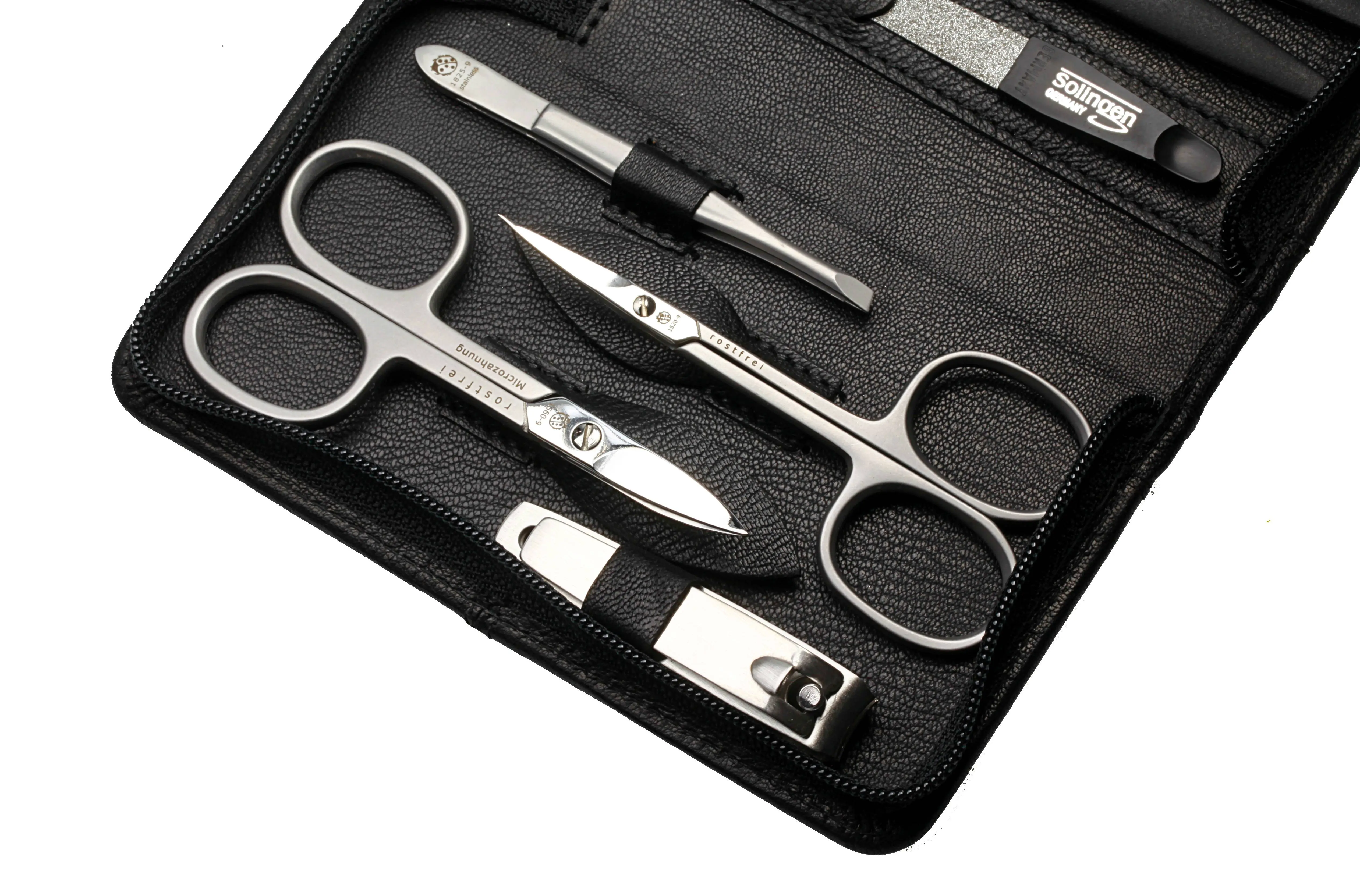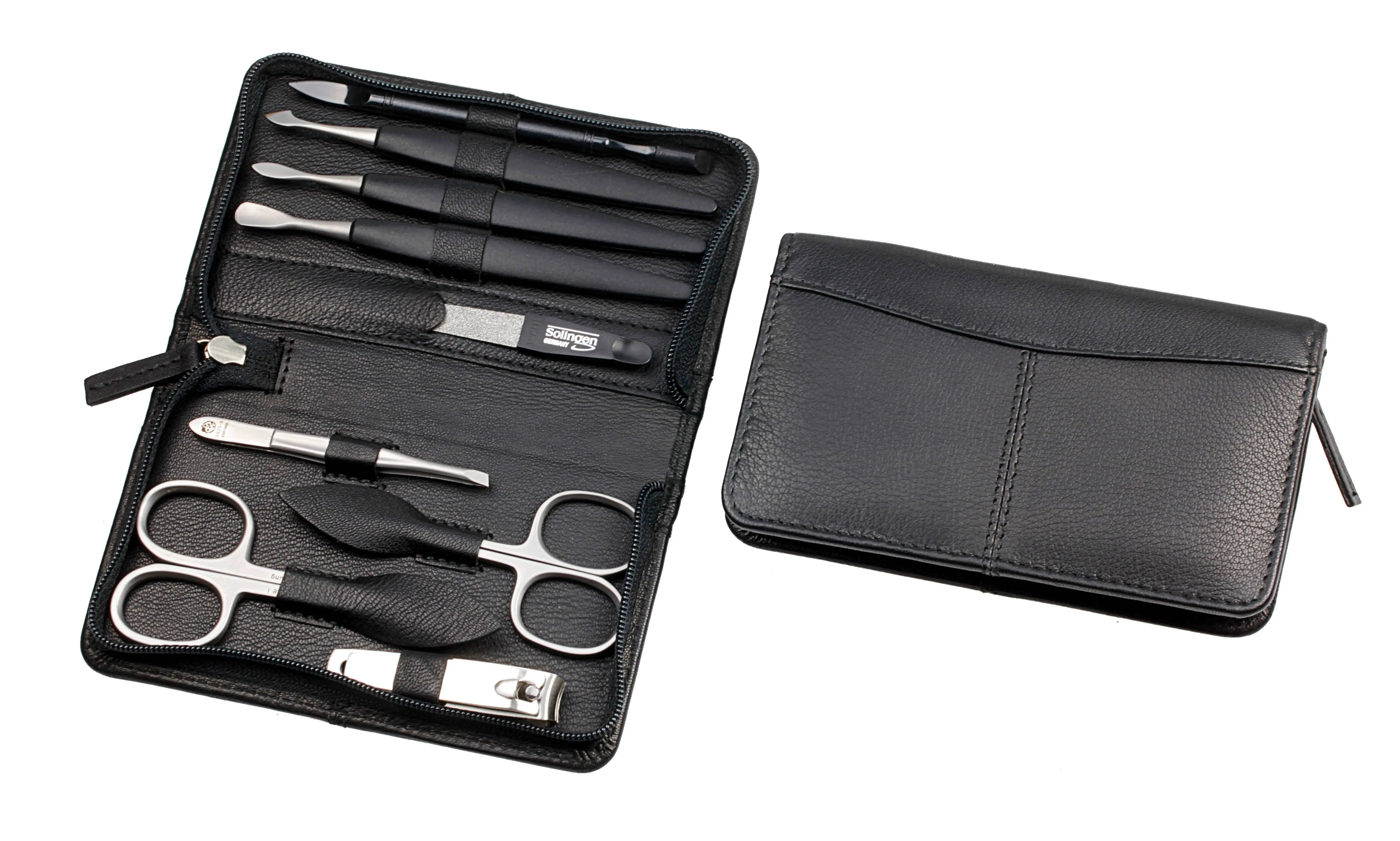 Produktinformationen "Manicure-Etui, Reißverschluss: 9-tlg. Bestückung, rostfrei-edelmattiert; Nappa-Schafleder, schwarz"
