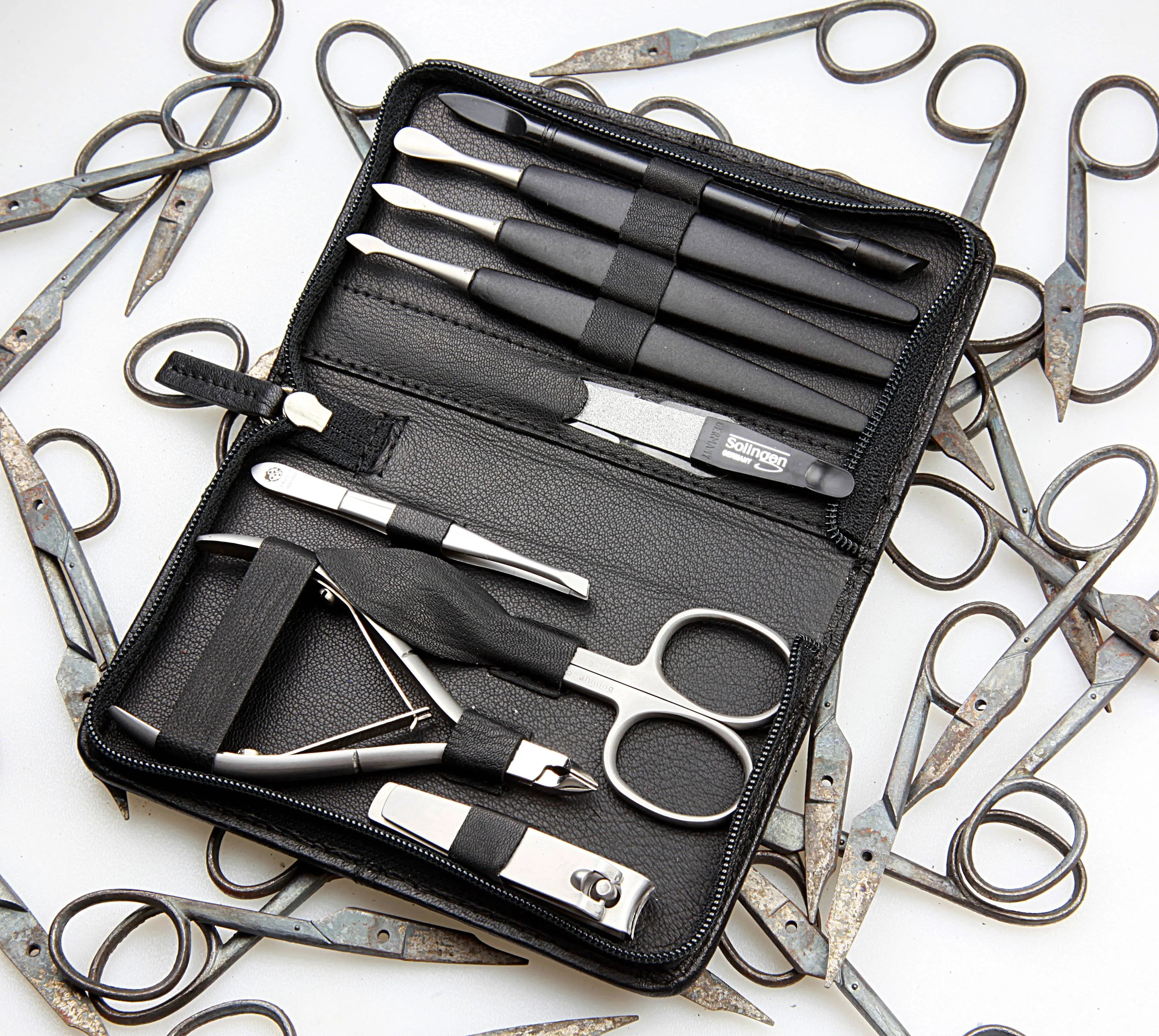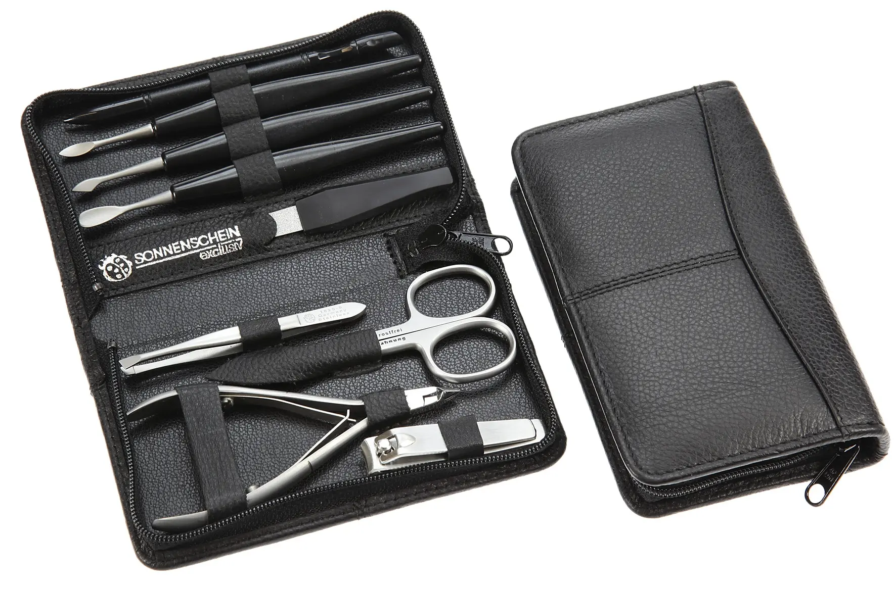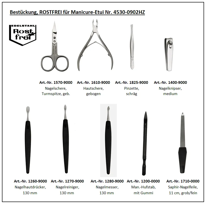 Umfangreich ist die Bestückung, die aus neun hochwertigen SONNENSCHEIN Nagelpflege-Instrumenten aus rostfreiem, mattiertem Edelstahl besteht. Dabei wartet der Inhalt mit einer Besonderheit auf: Während die meisten Etuis mit Nagel- und Hautschere bestückt sind, ist die Nagelschere hier mit einer Hautzange kombiniert! Die Bestückung im Detail:
