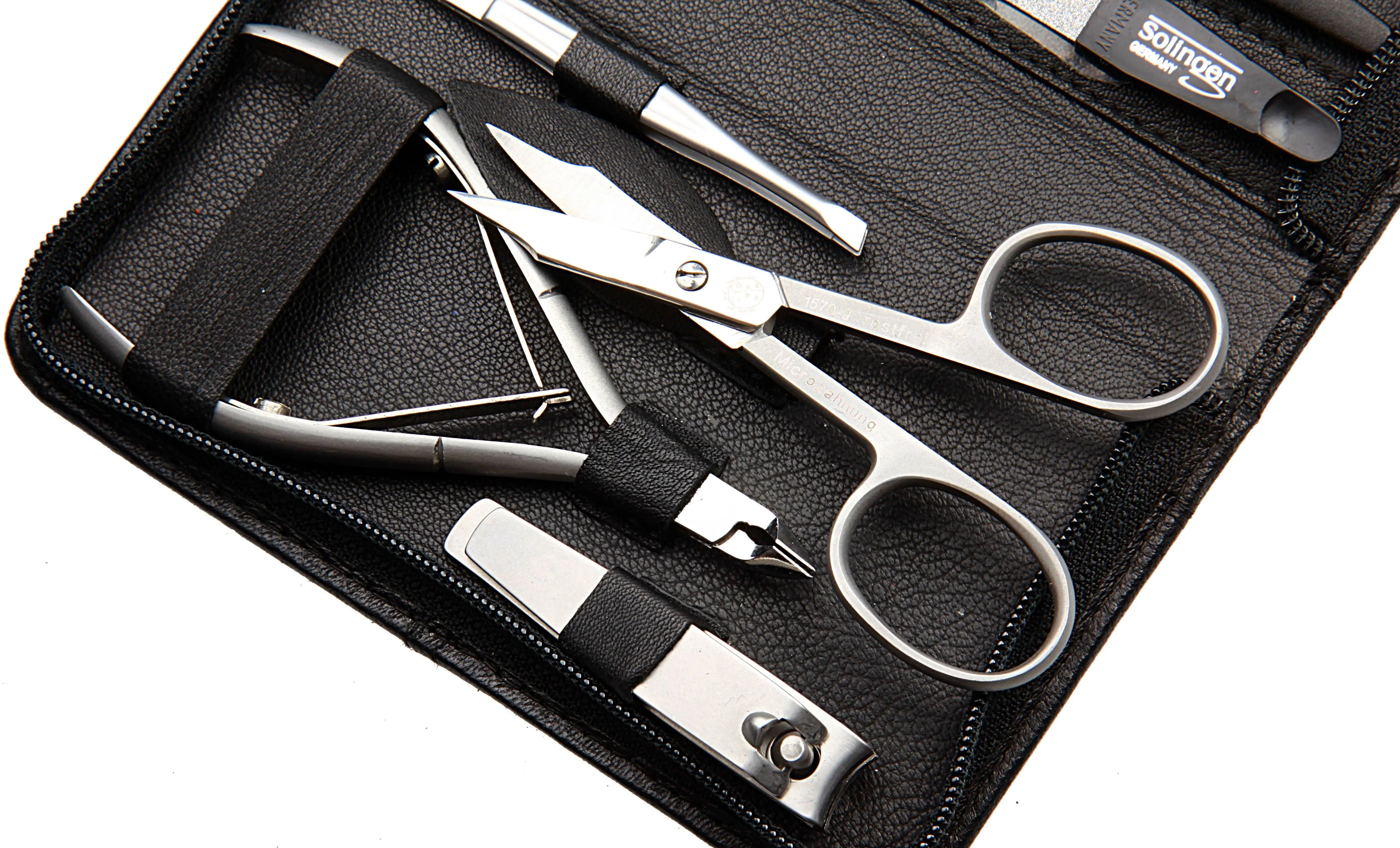 Produktinformationen "Manicure-Etui, Reißverschluss: 9-tlg. Bestückung, rostfrei-edelmattiert; echt Nappa-Schaleder, schwarz"