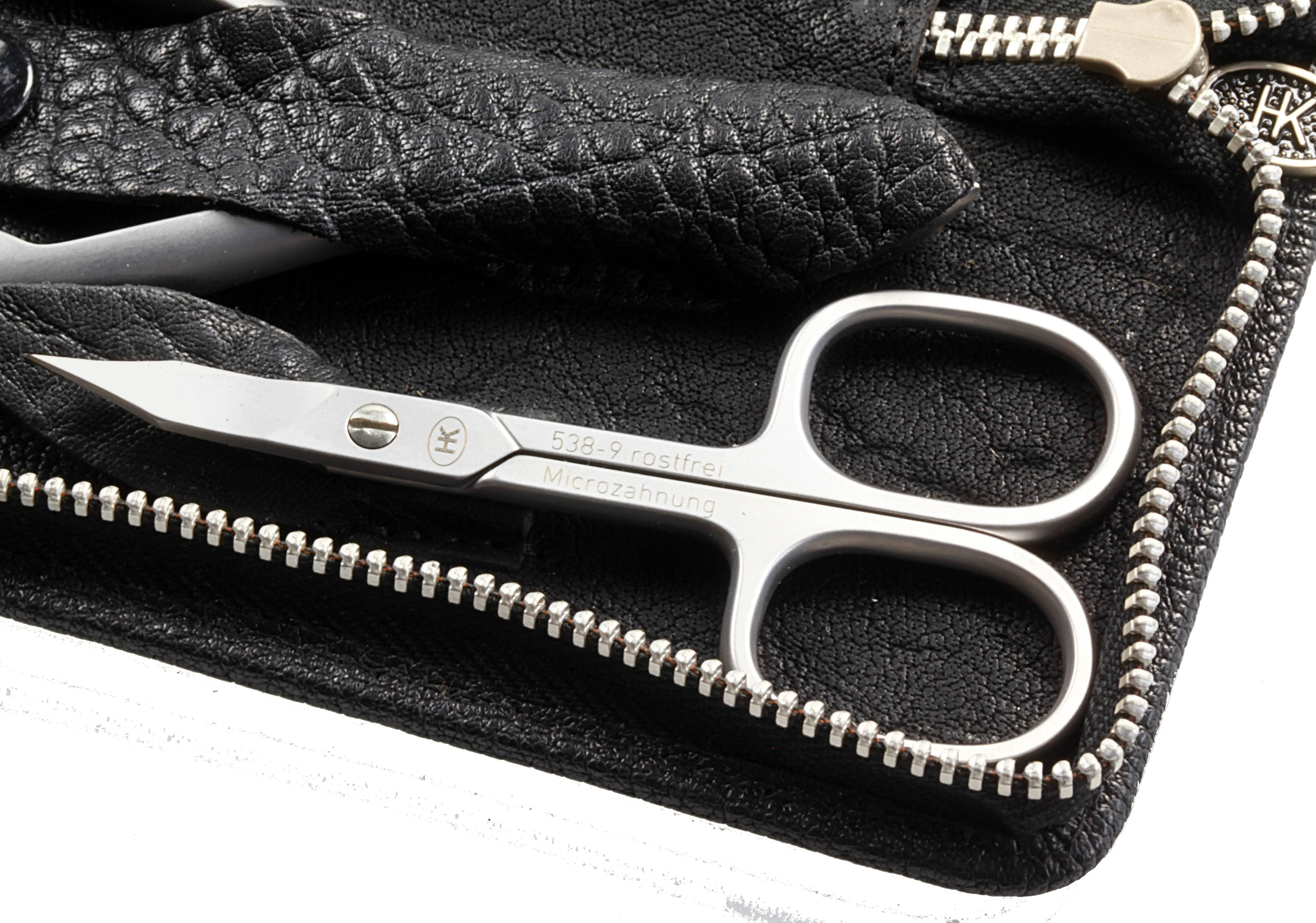 Produktinformationen "Manicure-Etui mit Metall-Reißverschluss: 5-tlg. Bestückung, rostfrei-edelmattiert; schrumpfgegerbtes Büffelleder, schwarz mit hellen Kontrastnähten"