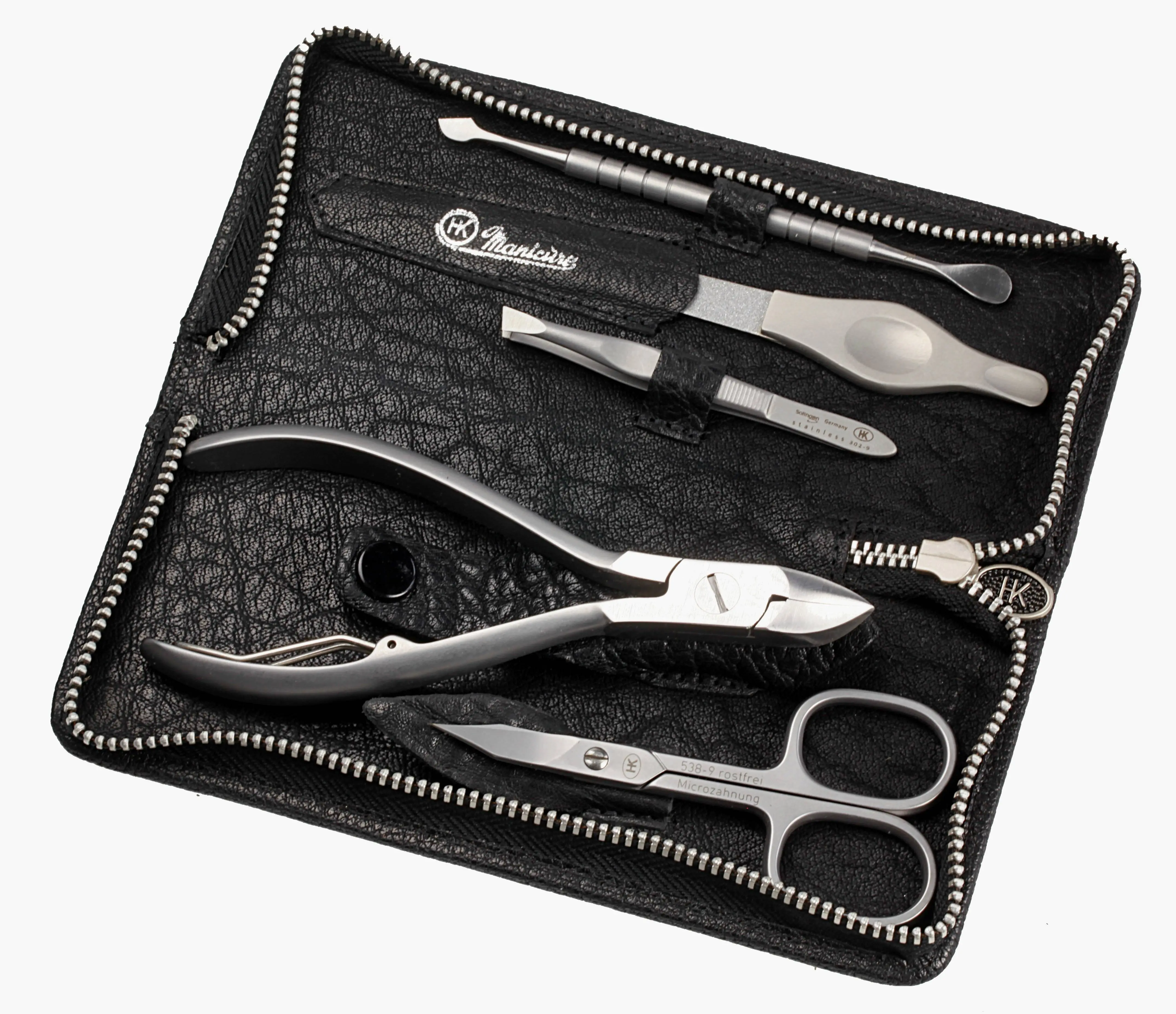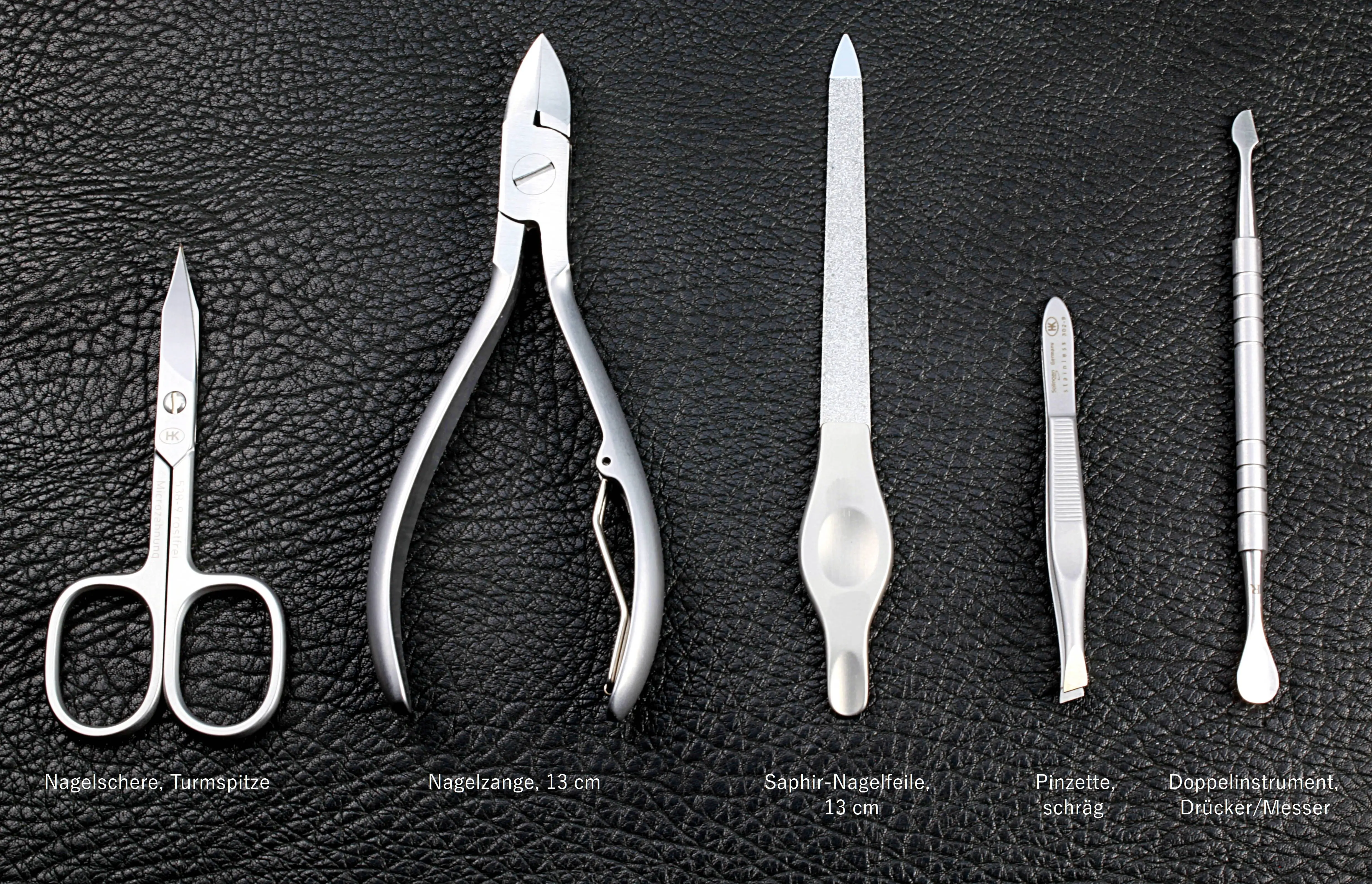 Die hochwertige, antiallergene Bestückung aus rostfreiem Edelstahl in mattierter, blendfreier Optik umfasst die folgenden fünf HK-MANICURE Nagelpflege-Instrumente: