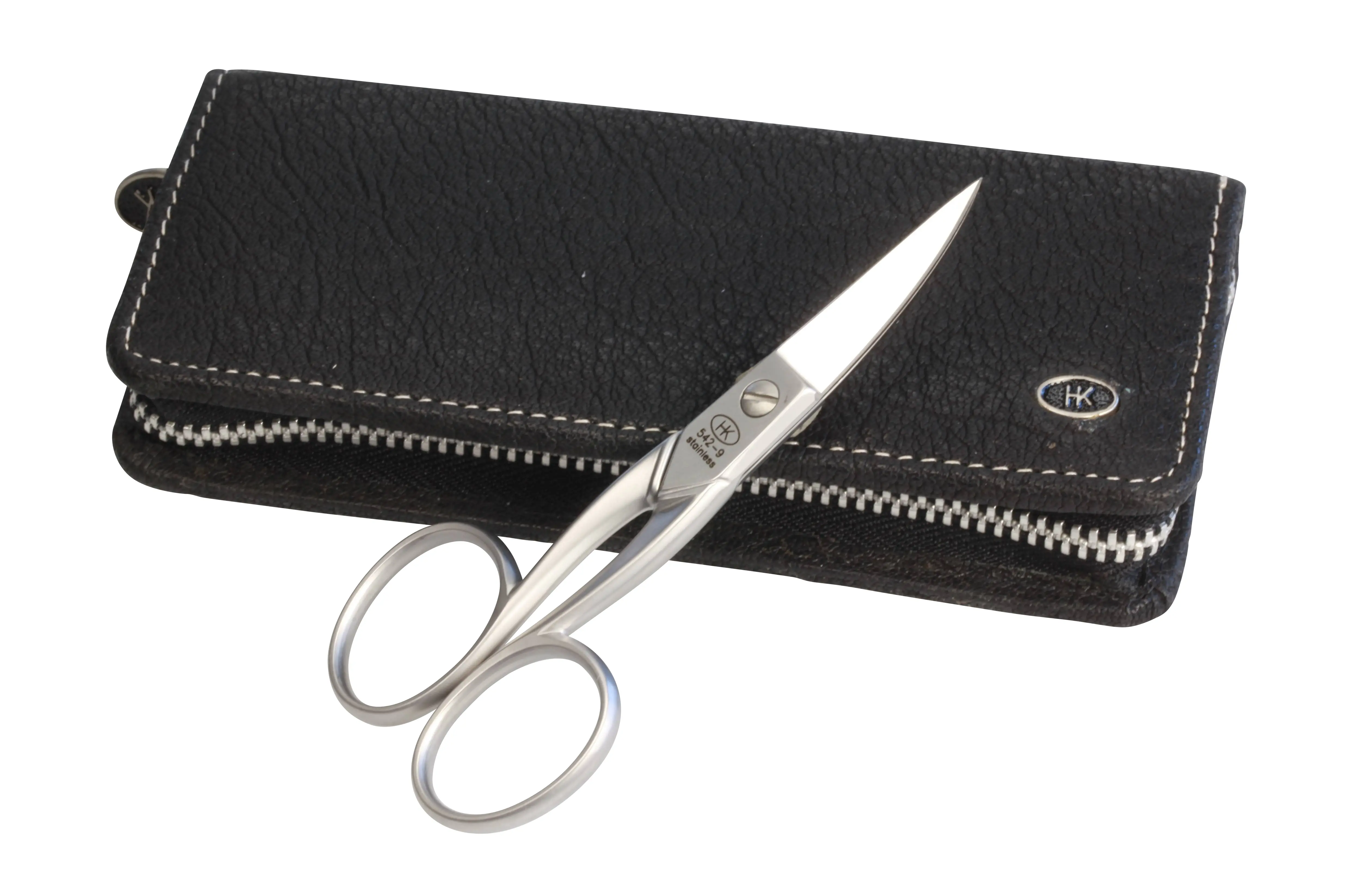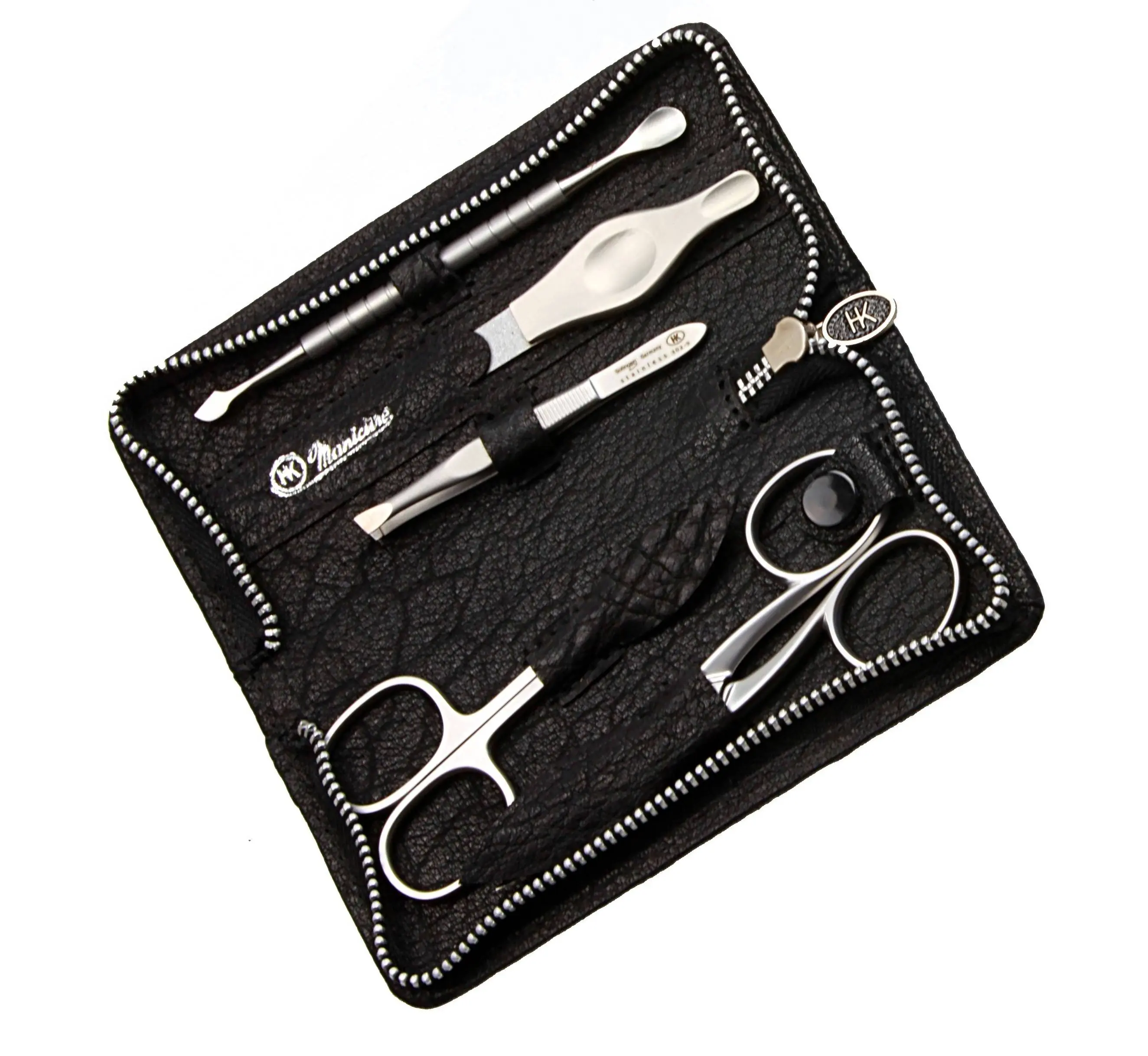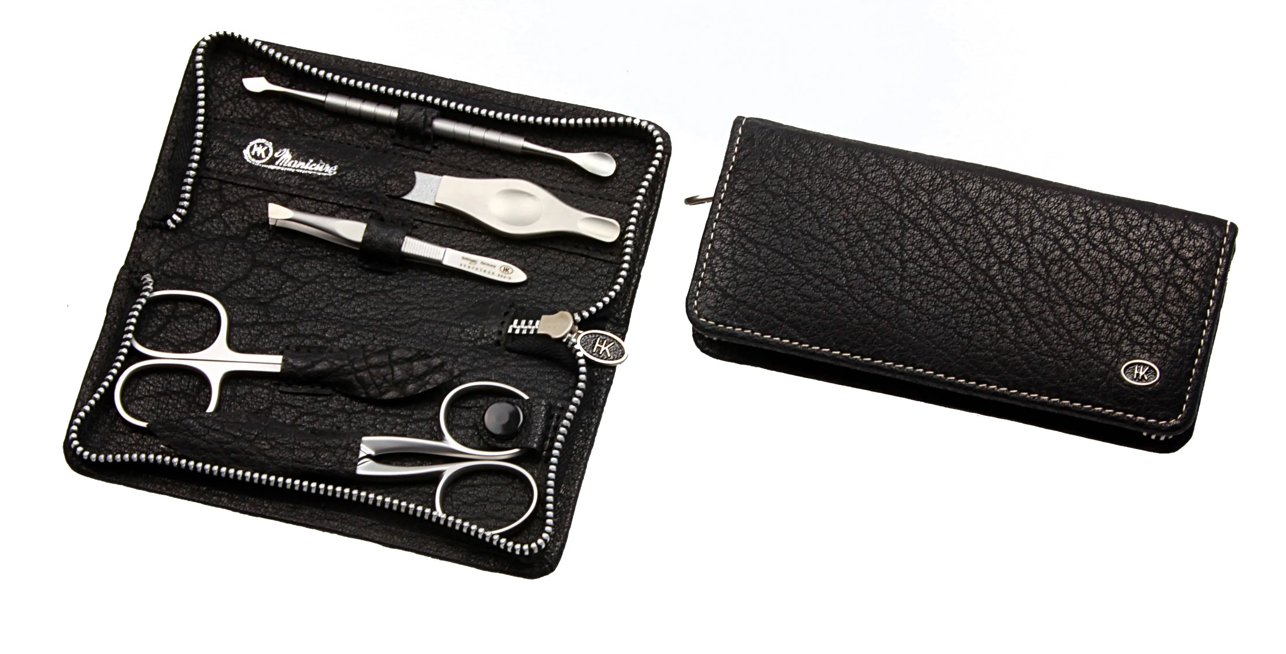 Manicure-Etui mit Metall-Reißverschluss: 5-tlg. Bestückung, rostfrei-edelmattiert; schrumpfgegerbtes Büffelleder, schwarz mit hellen Kontrastnähten