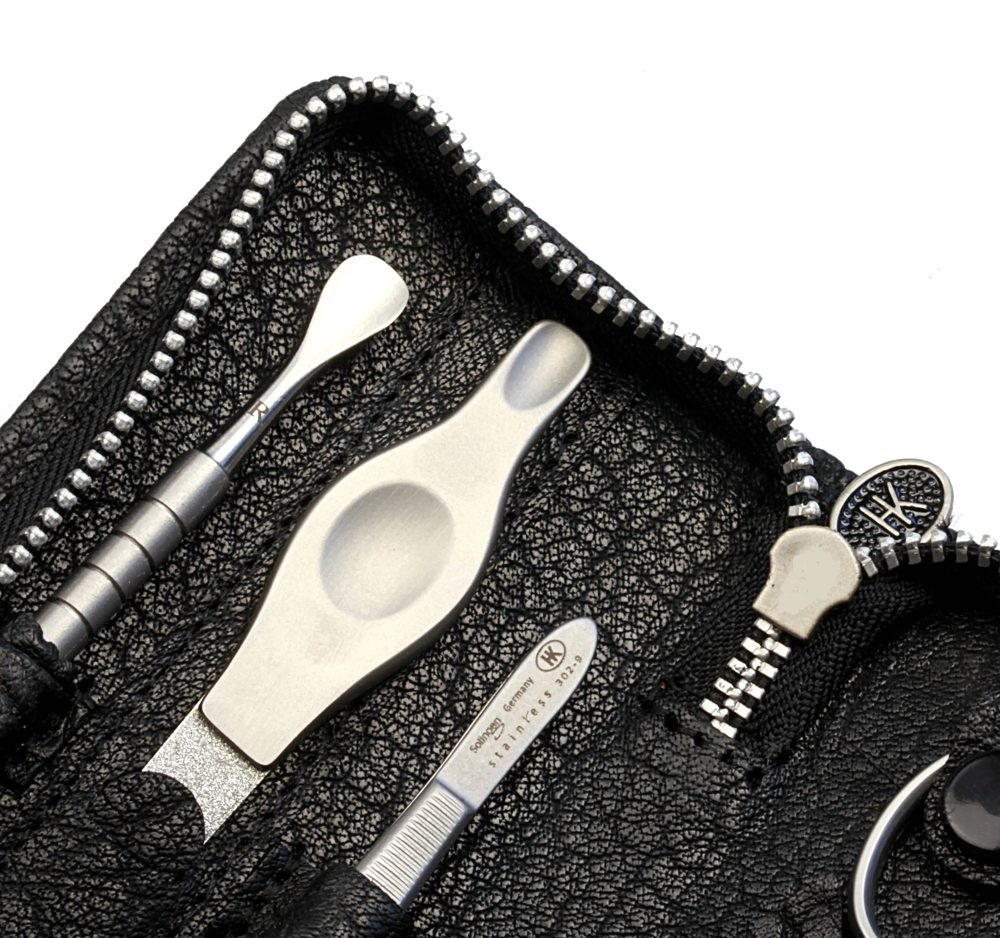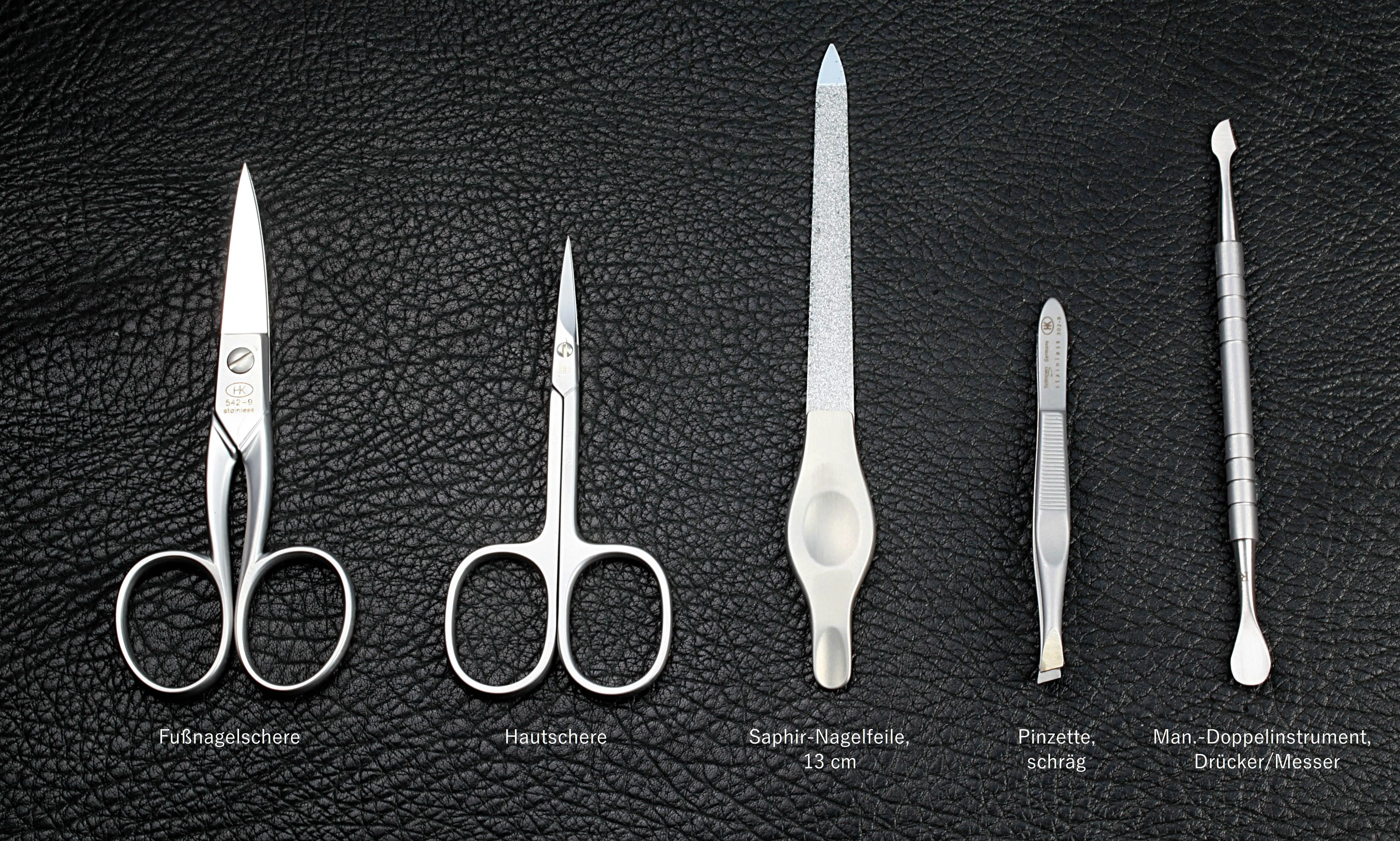 Die hochwertige HK-MANICURE Bestückung aus rostfreiem Edelstahl in mattierter Optik wartet mit einer Besonderheit auf: Es empfiehlt sich dank seiner Fußnagelschere speziell für alle diejenigen, die starke Fußnägel haben, aber nicht so gerne mit einer Nagelzange arbeiten möchten. Nachfolgend die fünf Instrumente im Detail: