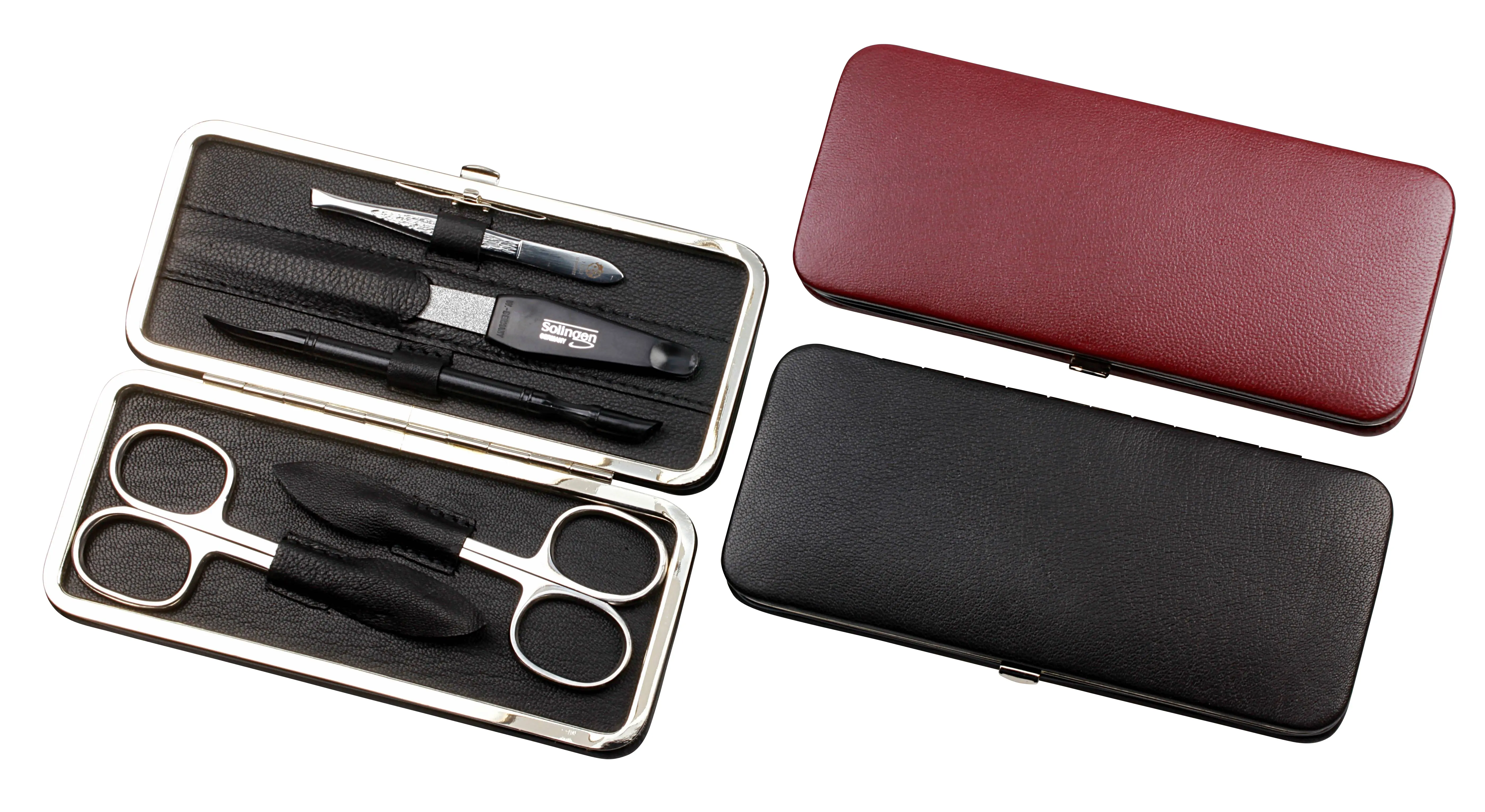 Ein exquisiter Klassiker mit Stil und Ausstrahlung! Das Etui aus feinstem, geschmeidig weichem Nappa-Lammleder in einem warmen Bordeaux-Ton ist in bester Feintäschnermanier flach um einen soliden Metall-Rahmen gearbeitet. Sein hochwertiger Inhalt besteht aus fünf feinen Nagelpflegeinstrumenten in bewährter SONNESCHEIN-Markenqualität: