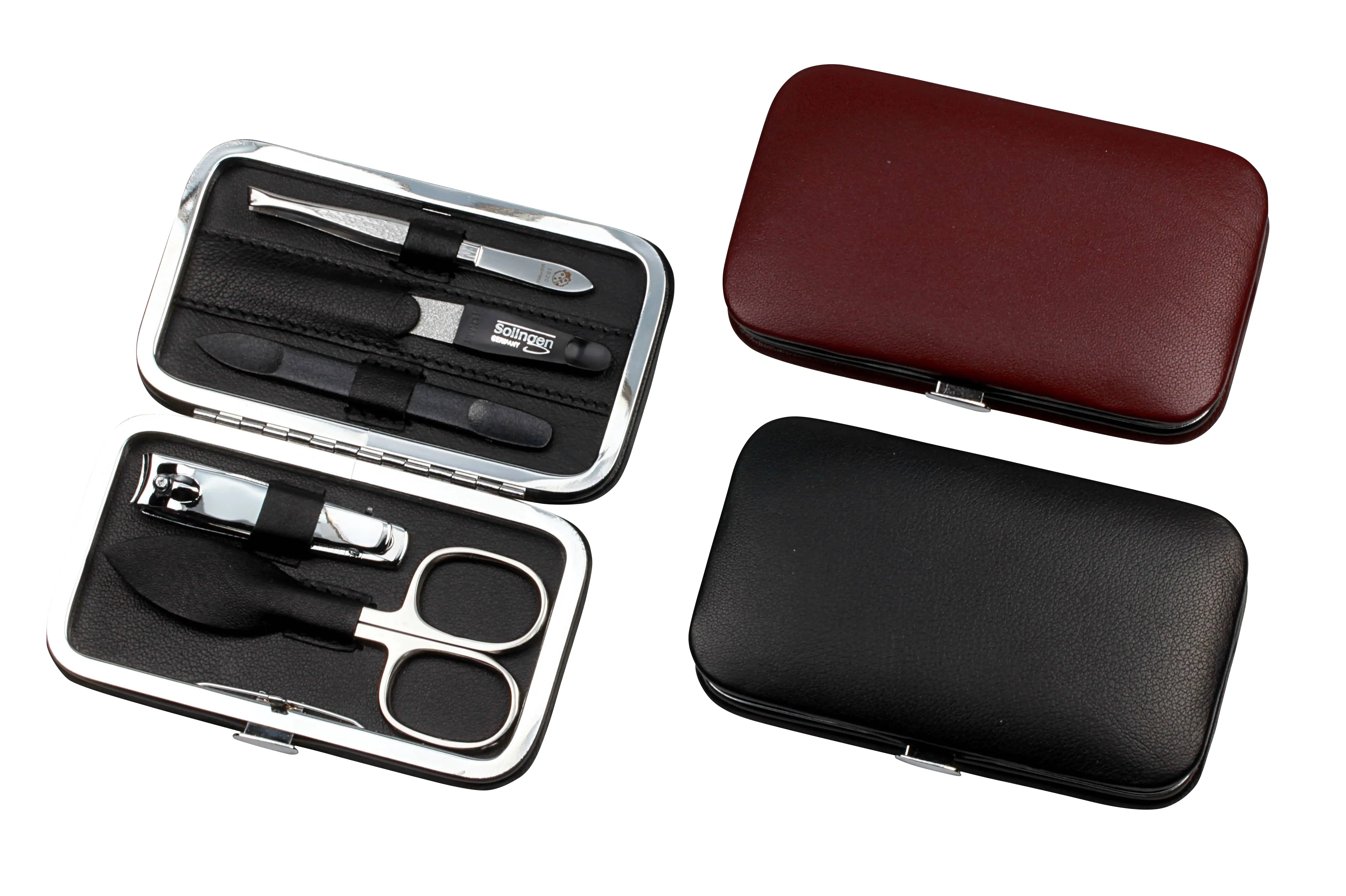 Unser kompakter Klassiker mit Stil und Ausstrahlung! Das Etui aus geschmeidigem, schwarzen Nappa-Lammleder ist in bester Feintäschnermanier flach um einen soliden, kleinen Metall-Rahmen gearbeitet. Sein hochwertiger Inhalt besteht aus fünf feinen Nagelpflegeinstrumenten in bewährter SONNESCHEIN-Markenqualität: