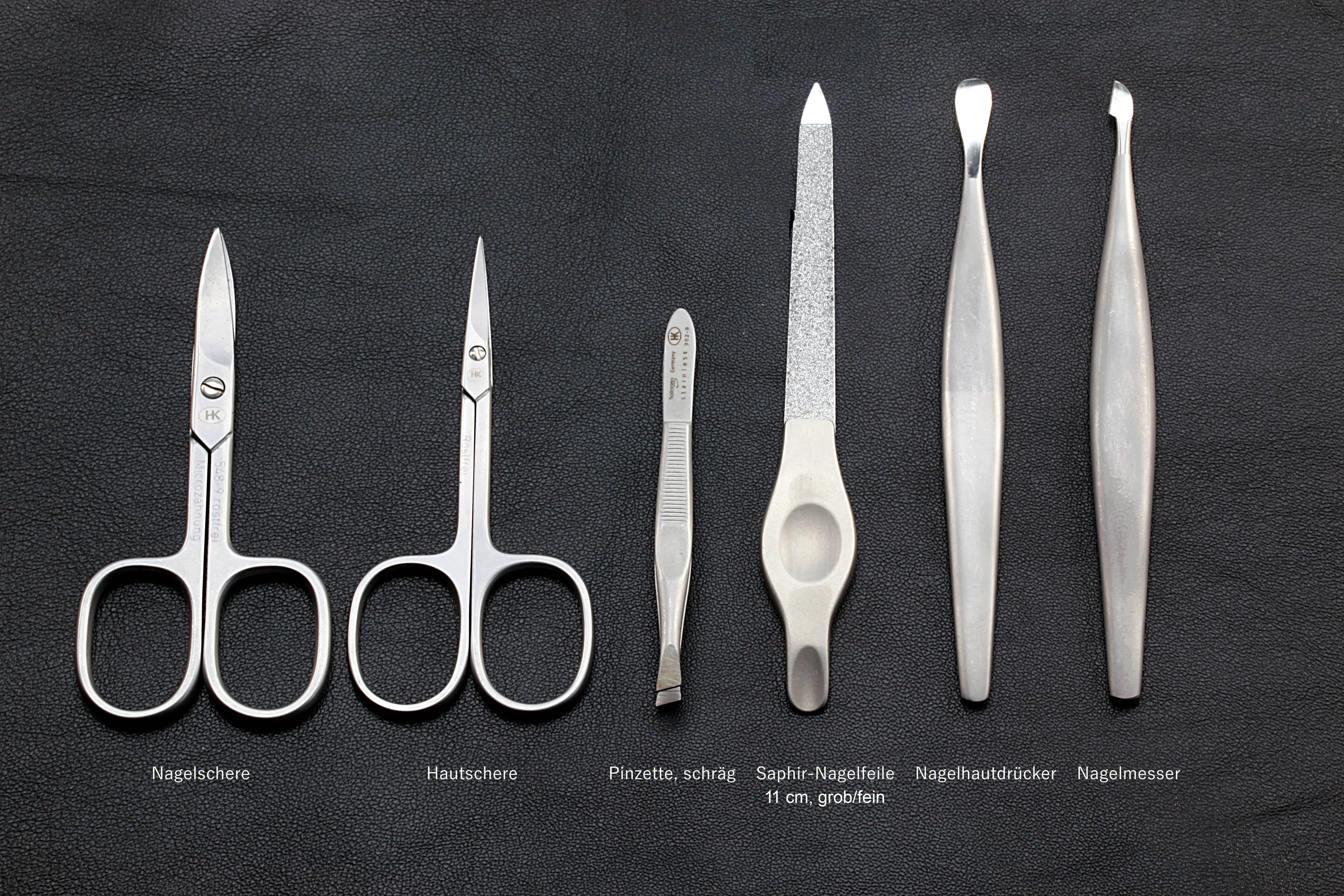 Dieses klassische Manicure-Etui aus feinstem, durchgefärbten Nappa-Lammleder mit solidem Nylon-Reißverschluss beinhaltet alle Instrumente für die tägliche Nagelpflege. Die hochwertige HK-MANICURE Bestückung aus rostfreiem Edelstahl in mattierter, blendfreier Optik umfasst die folgenden sechs Instrumente: