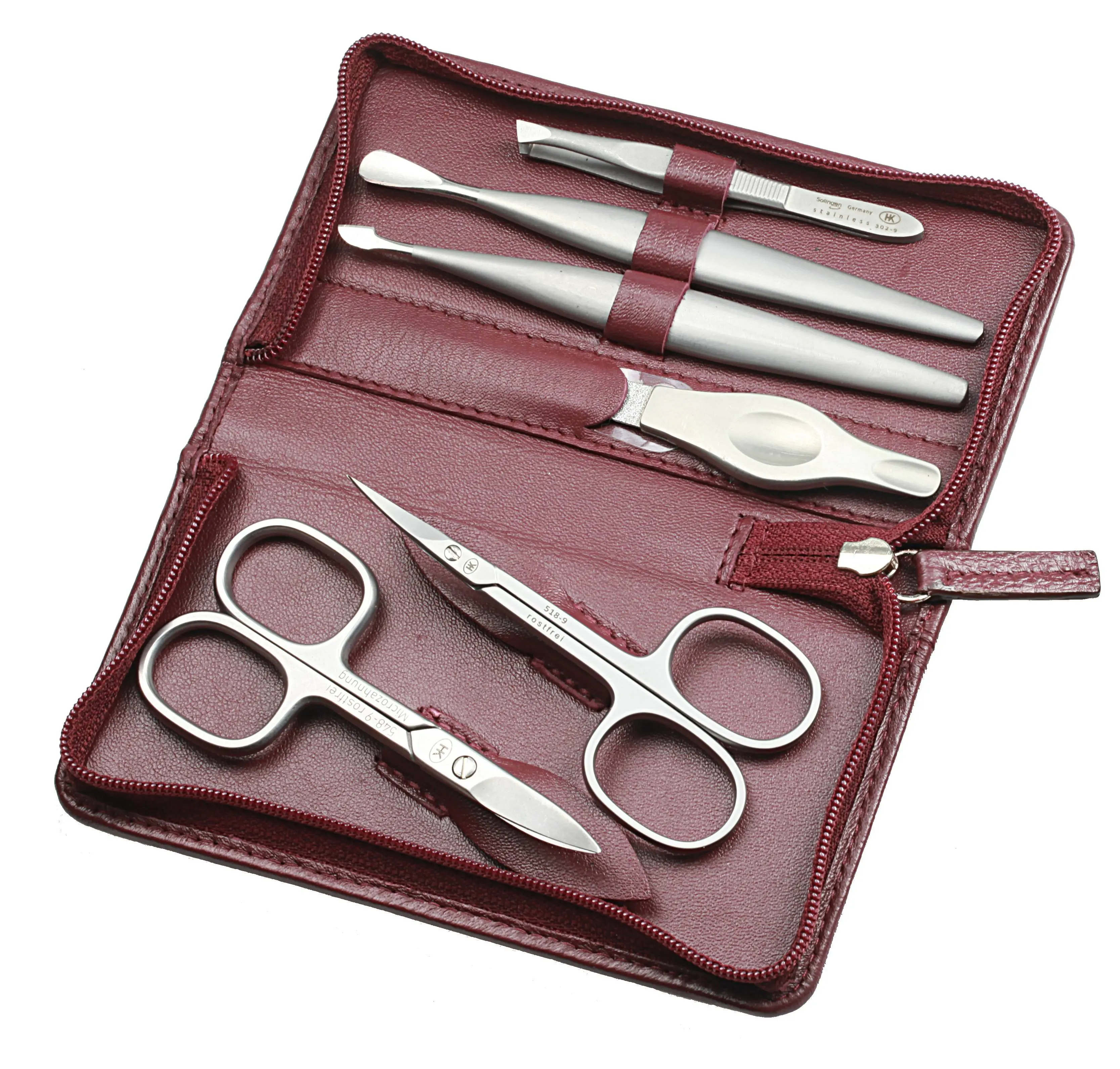 Produktinformationen "Manicure-Etui mit Reißverschluss: 6-tlg. Bestückung, rostfrei-edelmattiert; Nappa Lammleder, bordeaux"