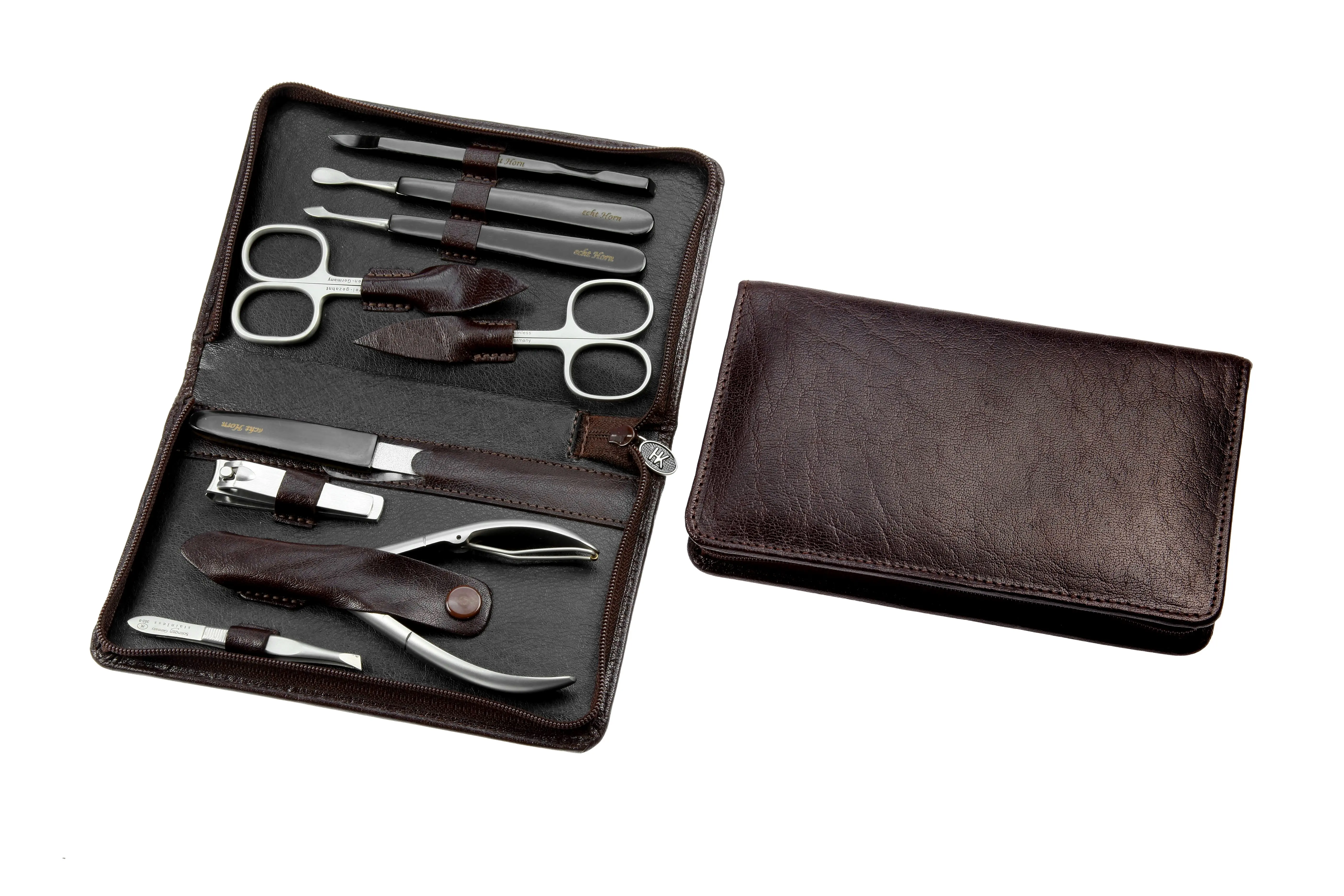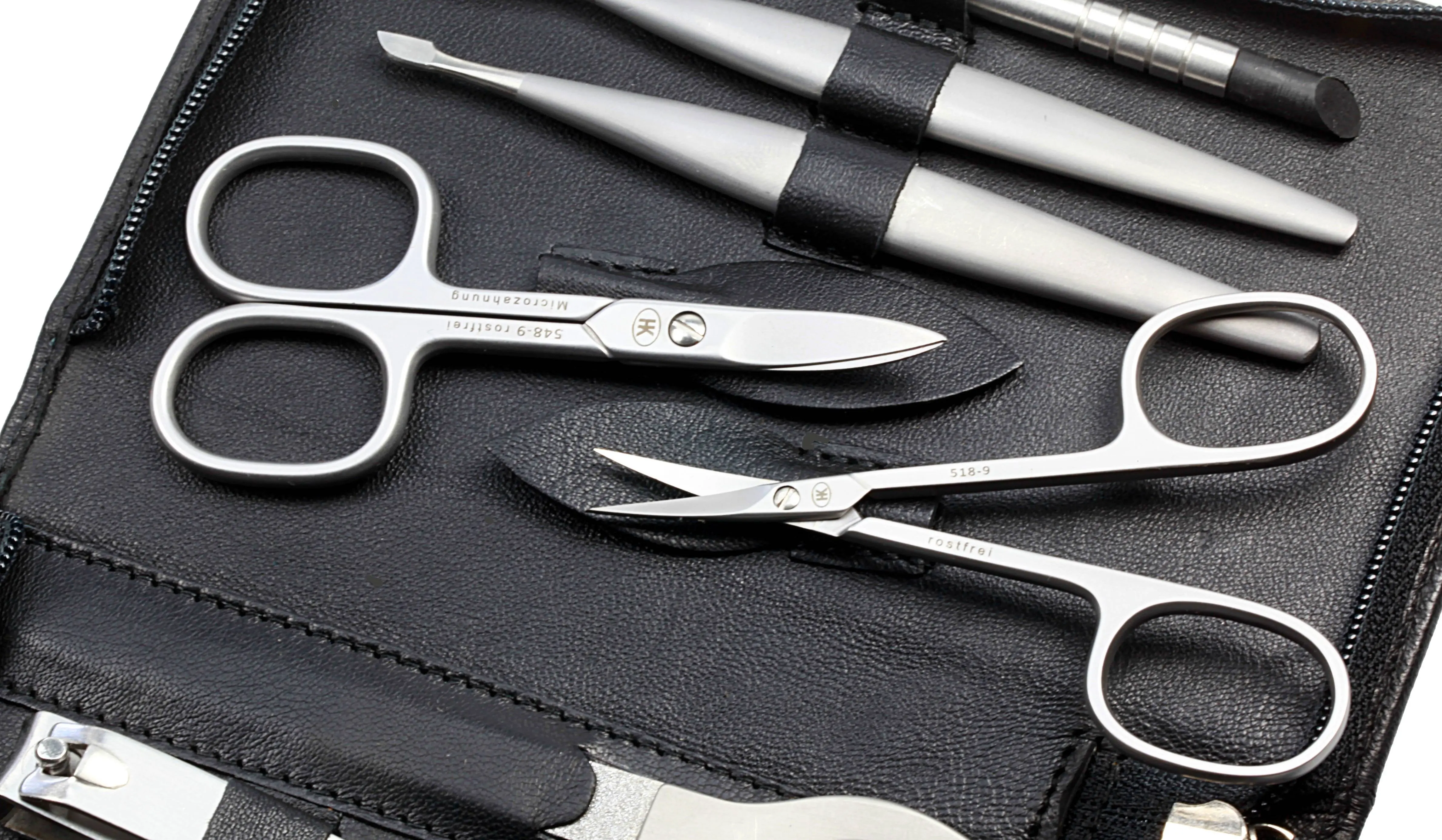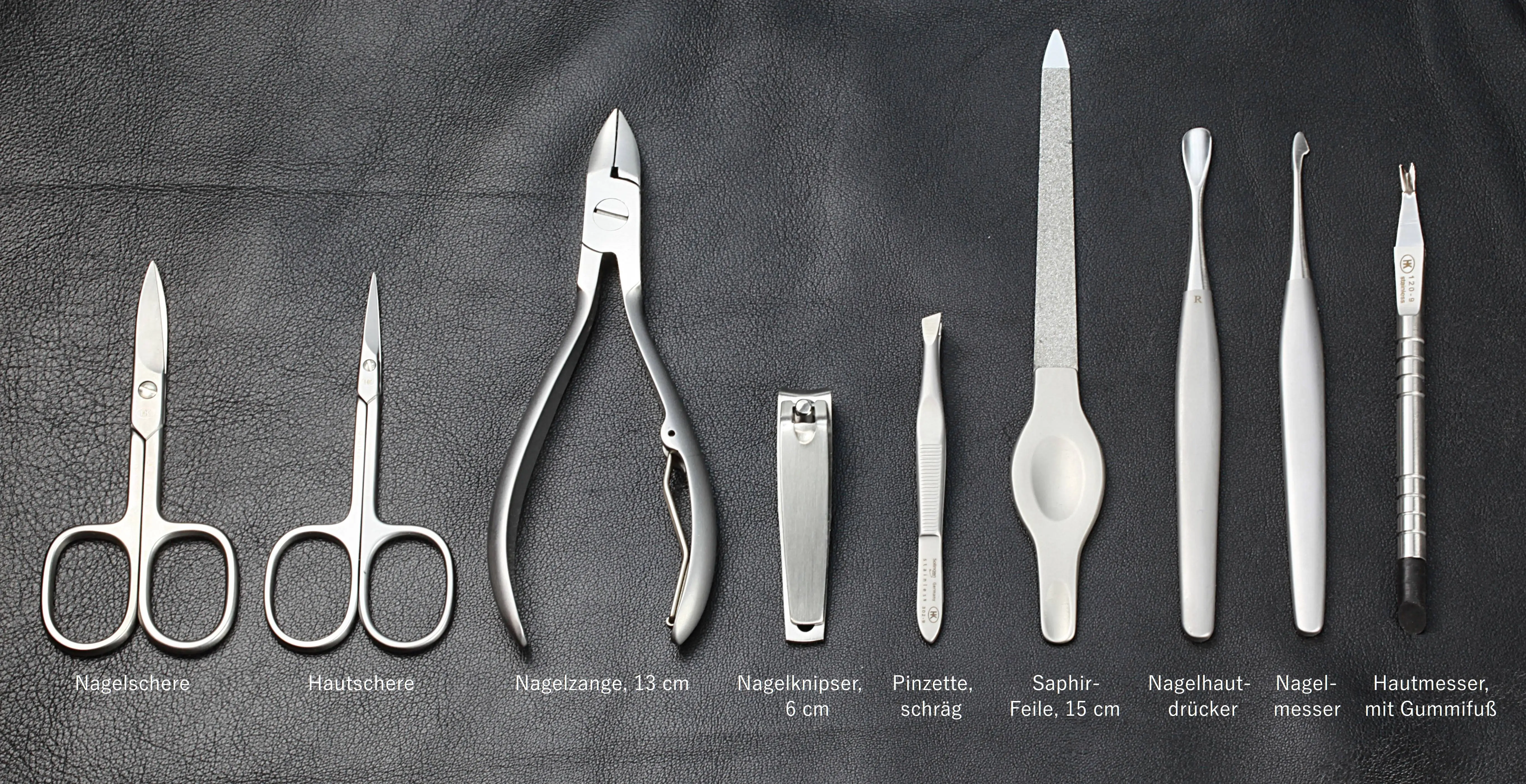 Die hochwertige Bestückung aus rostfreiem Edelstahl in mattierter Optik umfasst die folgenden neun hochwertigen HK-MANICURE Nagelpflege-Instrumente: