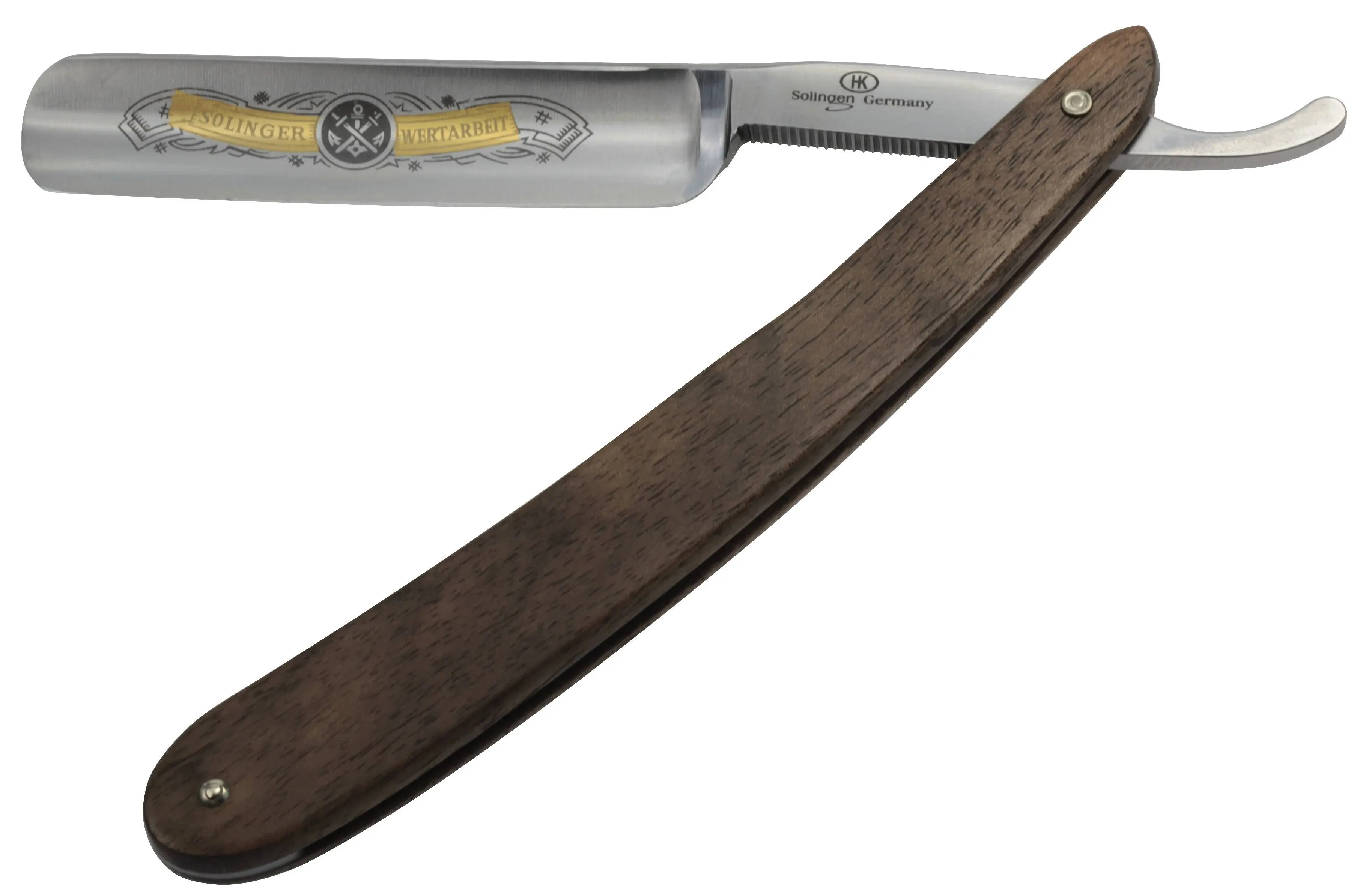 Die Schalen dieses Rasiermessers bestehen aus Walnussholz. Lieferung erfolgt im Stecketui aus echtem Vollrindleder!