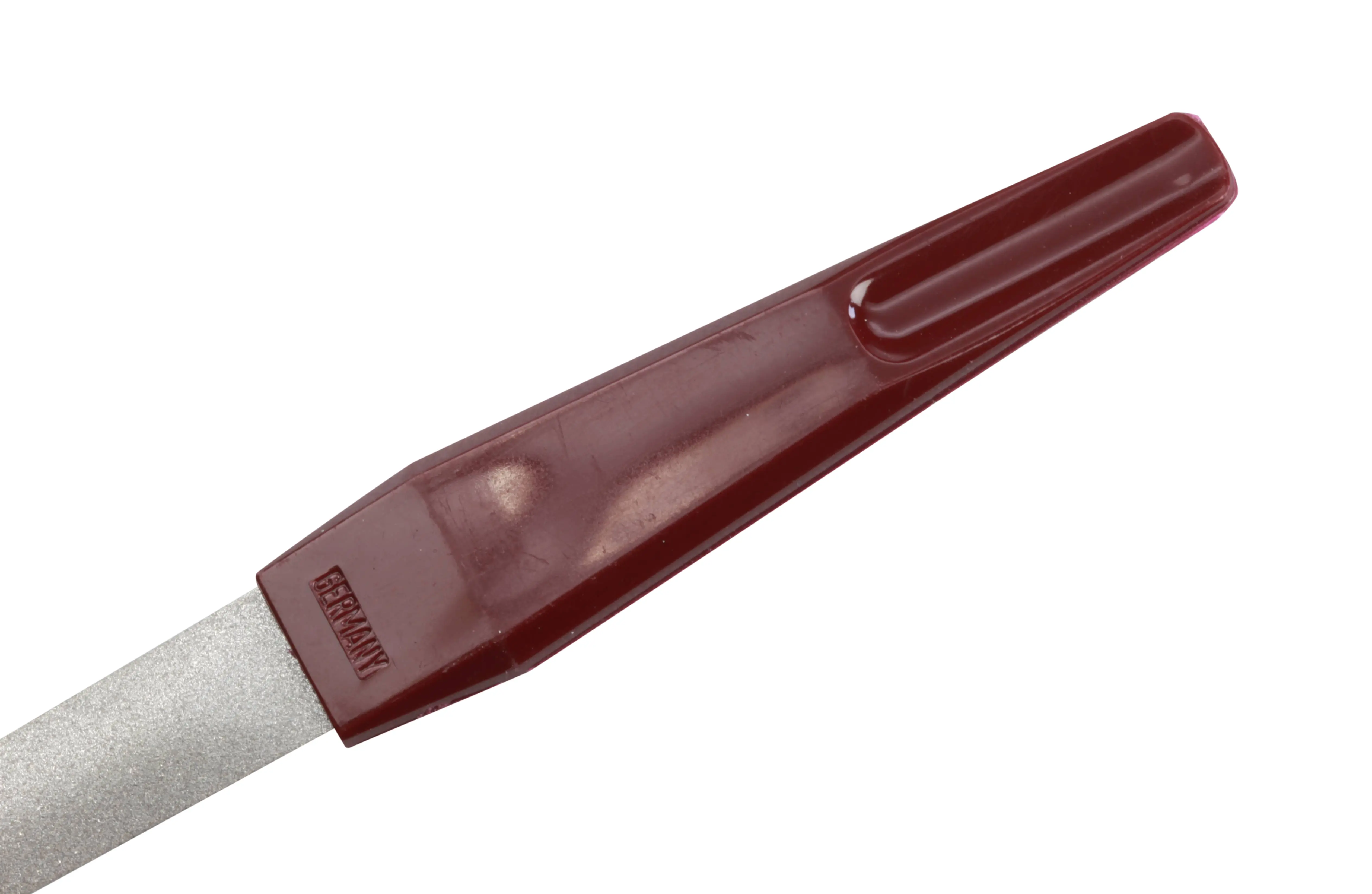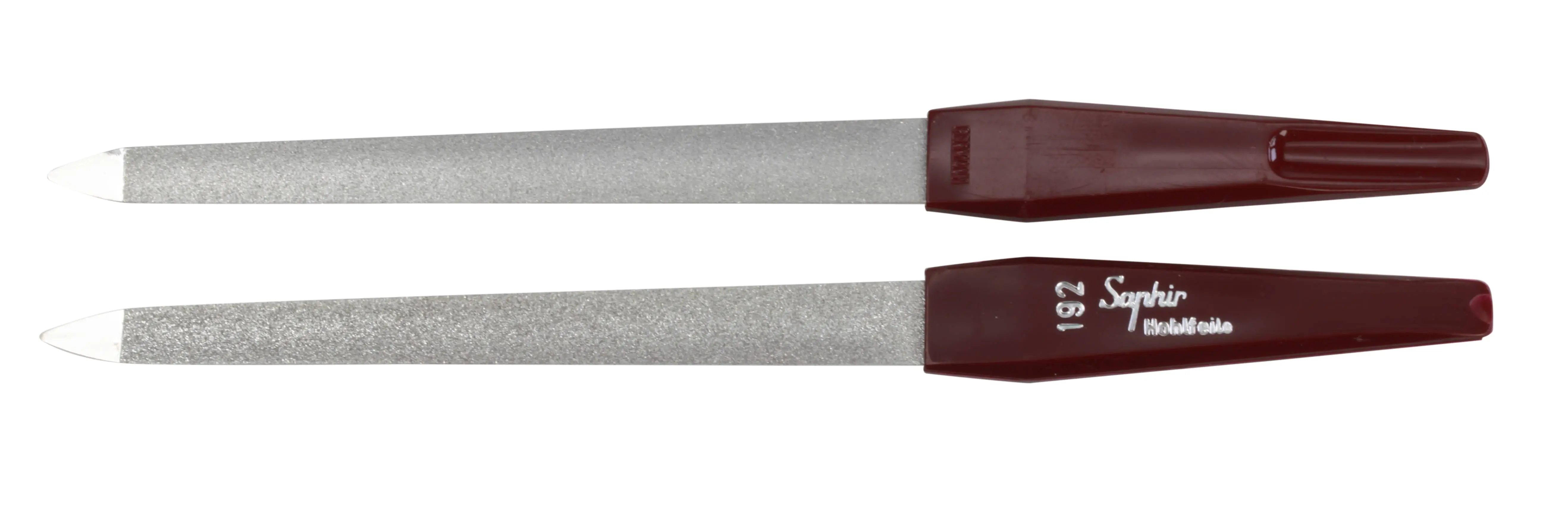 Um Verletzungen der Nagelhaut beim Gebrauch der Feile zu vermeiden, sind die Seiten des Feilenblatts glatt ohne größere Saphirpartikel, die überstehen.