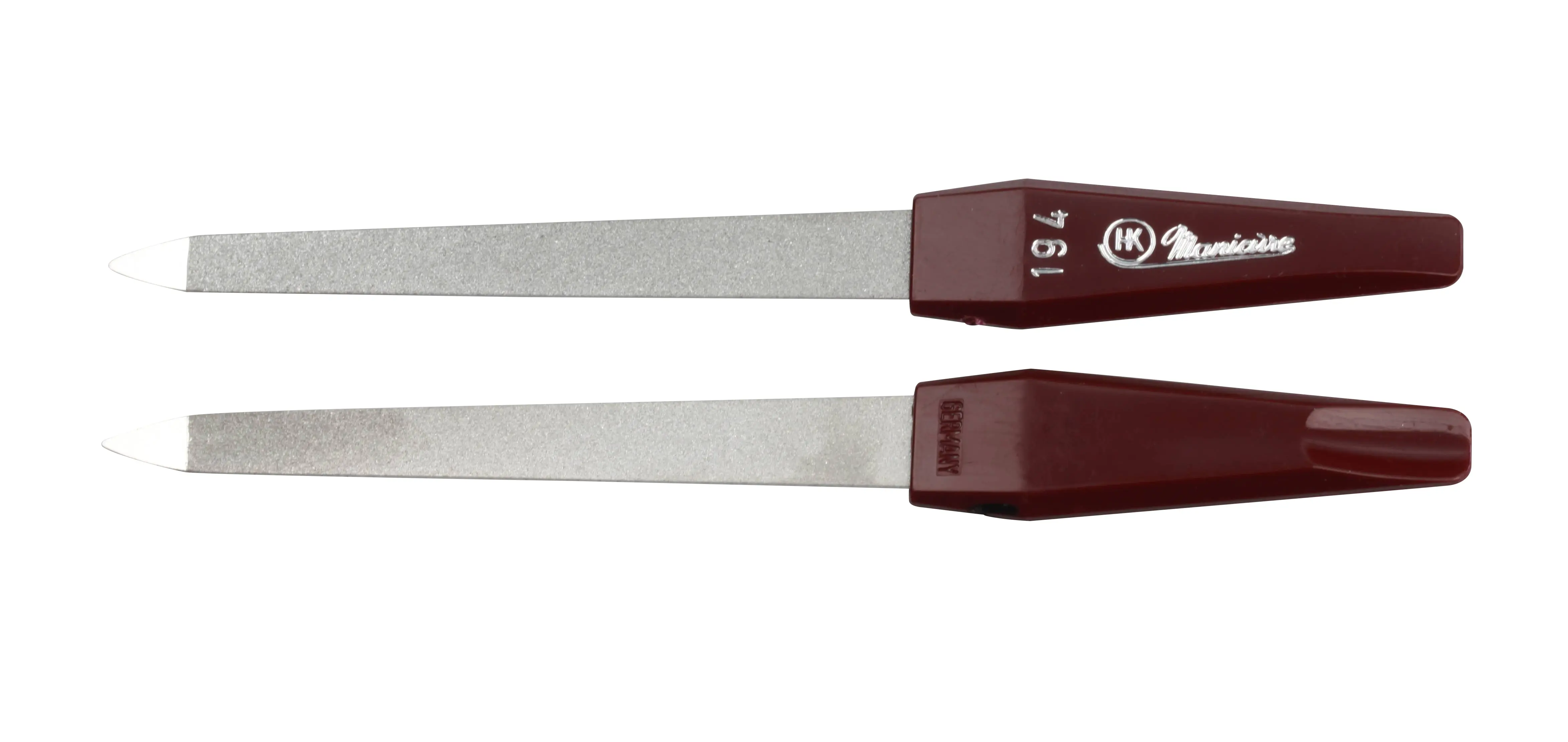 Alle unsere Saphir-Nagelfeilen haben eine grobe Belagseite zum Formen und eine feine Belagseite zum Glätten der Nägel. Damit die Feile lange gebrauchsfähig bleibt, sind die einzelnen Saphir-Partikel durch eine Chromschicht fest an das gehärtete und vollflexible Stahlblatt gebunden. Das spitze Ende des Feilblatts lässt sich auch als Nagelreiniger verwenden, während das Griffende als Nagelhautdrücker ausgeformt ist.