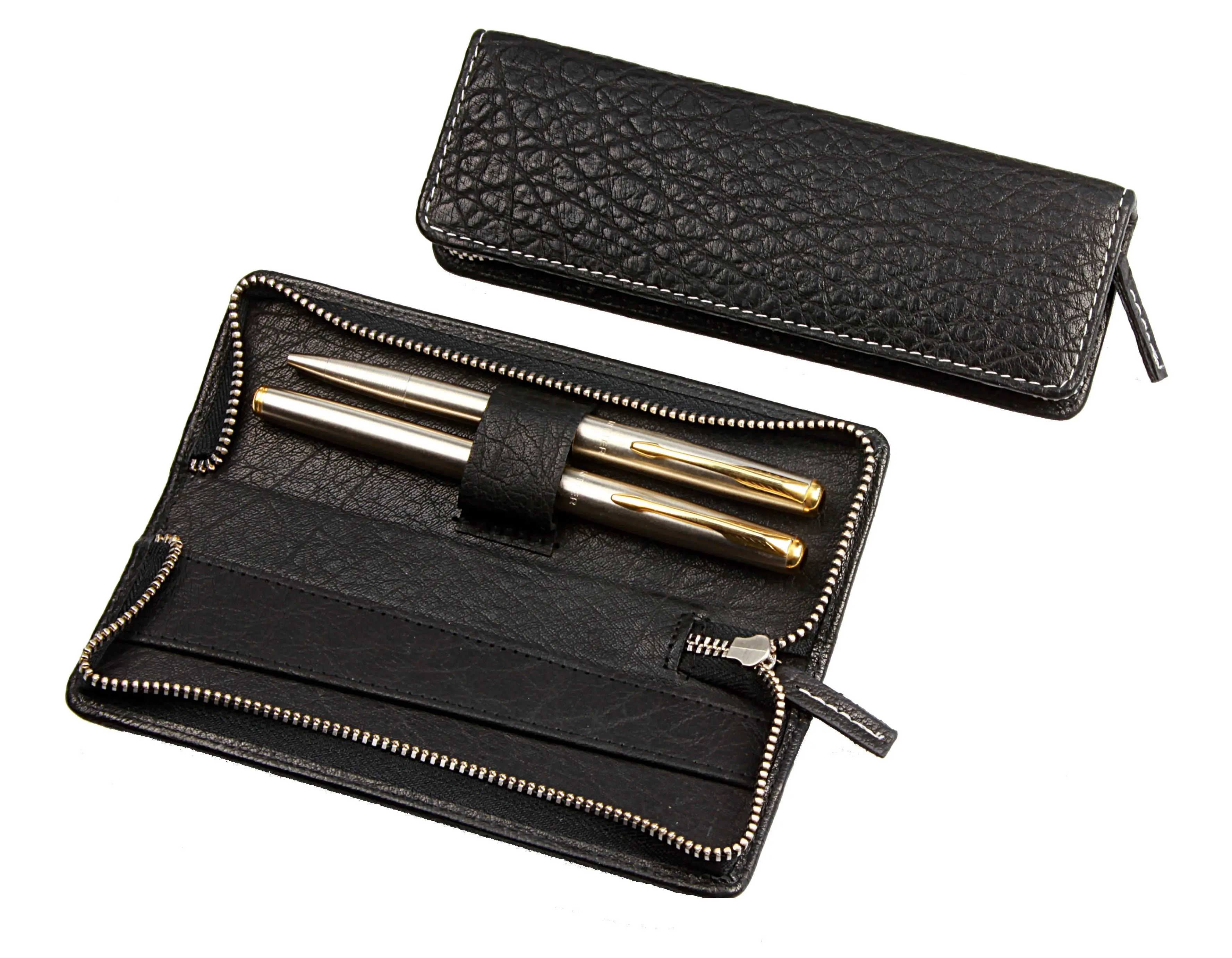 Die exklusiven Stiftetuis gibt es auch als Reißverschluss-Modelle. Dieses Etui für zwei Schreibgeräte ist aus geschrumpftem Büffelleder. Bei dieser speziellen Gerbart zieht sich die Haut im Verlauf des Gerbprozesses zusammen und erhält so nicht nur ihre markante, tiefporige Narbung, sondern auch eine besondere Stärke und Haltbarkeit. Selbstverständlich ist das Leder durchgefärbt. Zu diesem robusten Leder passt der solide Metall-Reißverschluss besonders. Optisch vollendet wird der Eindruck durch helle Kontrastnähte!