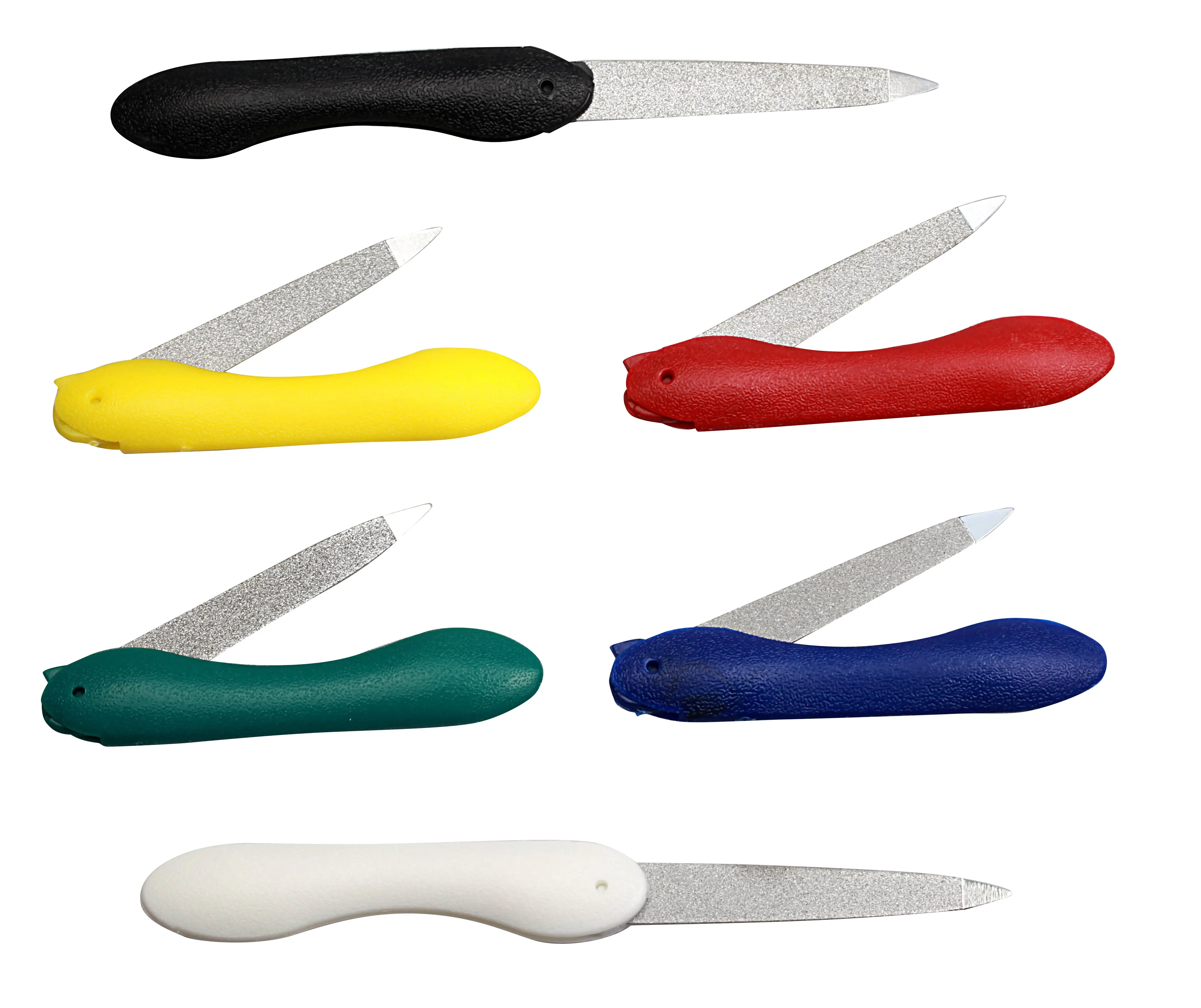 Diese Taschen-Klappfeile ist der optimale Begleiter für unterwegs und sollte in keiner Handtasche fehlen! Geschlossen schützt der ergonomisch geformte Griff das Feilblatt, das sich leicht ausklappen lässt. Ganz so wie bei den "großen Artgenossen" hat auch das Feilblatt dieser Taschen-Klappfeile eine grobe Belagseite zum Kürzen und eine feine zum Glätten der Nägel. Die Spitze der feile läßt sich auch als Nagelreiniger verwenden.