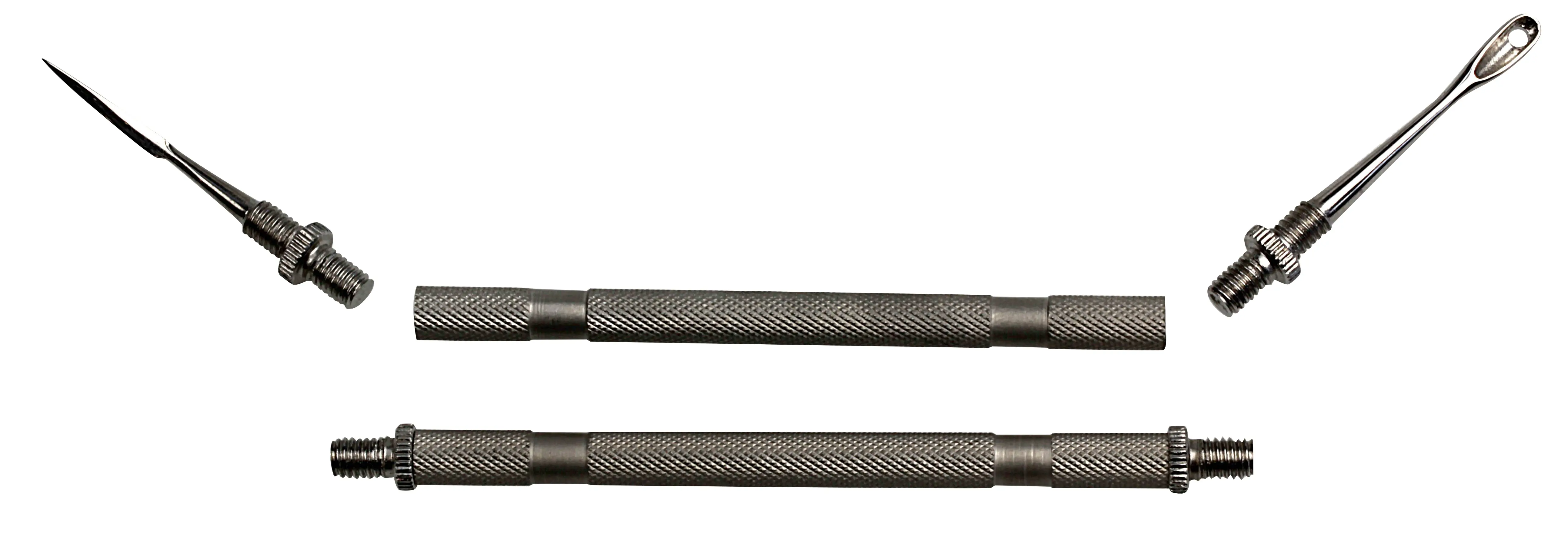 Um die Funktionsinstrumente bei der Aufbewahrung oder einem Transport zu schützen und Verletzungen auszuschließen, lassen sich die beiden Instrumente in den Griff einstecken und mit dem Gewinde arretieren.