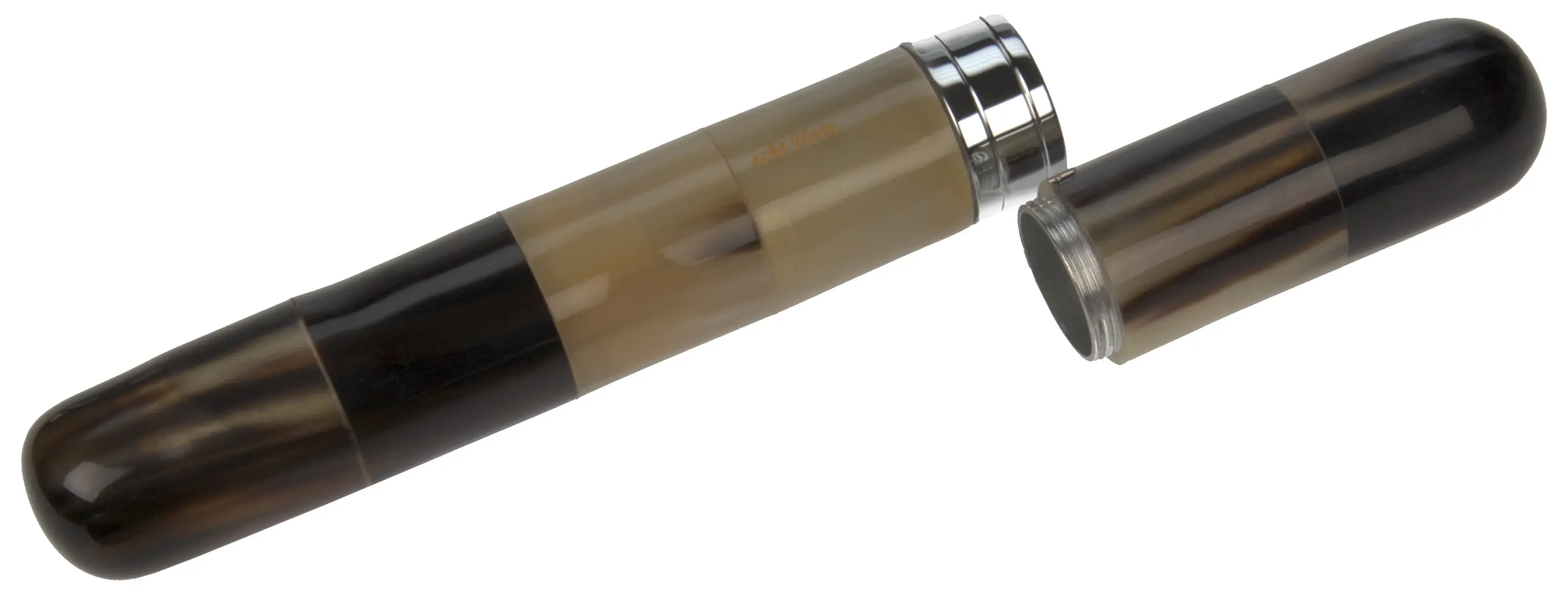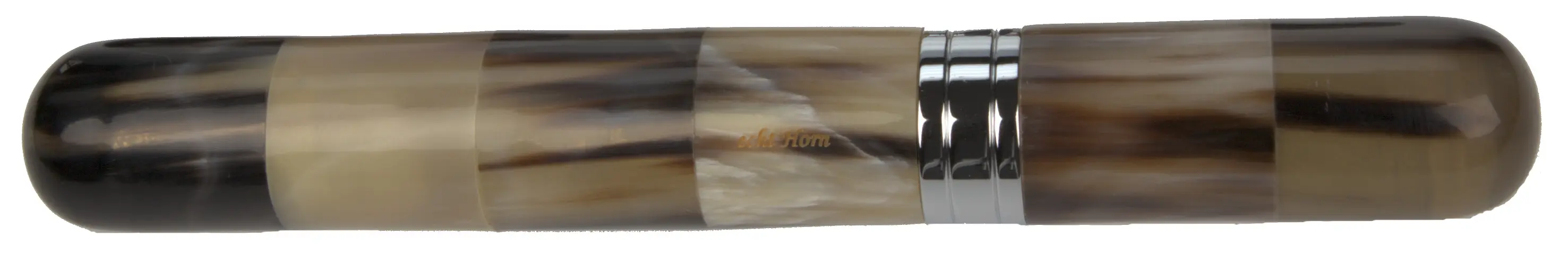 Mit viel Liebe zum Detail und handwerklicher Kunst entsteht dieser Köcher für Zahnbürsten. Um einen Metallkern herum werden dabei die thermoplastisch geformten Horn-Plättchen passgenau zusammengefügt. Das dynamische Spiel der lebendigen Farbnuancen, das Horn ohnehin auszeichent, wird hier kunsvoll auf die Spitze getrieben.