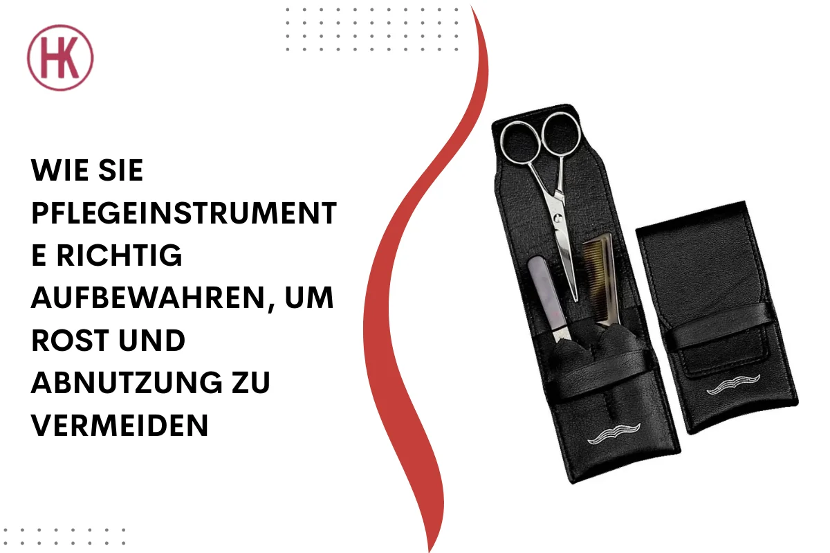 Pflegeinstrumente sollten nach der Anwendung gründlich getrocknet und in einem trockenen, geschlossenen Raum fern von Feuchtigkeit aufbewahrt werden. Schutzhüllen helfen, Feuchtigkeit und Rostbildung zu verhindern.