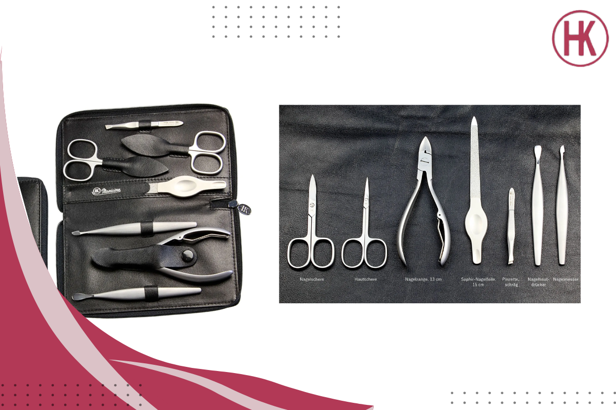 At Hans Kniebes, we design not only precision instruments but also storage solutions that reflect the same craftsmanship philosophy. Our Amalfi Full-Grain Leather Manicure Case, 7-Piece – crafted from full-grain leather with individually secured compartments, this structured case stabilizes each stainless steel instrument and minimizes friction between tools. The enclosed design protects grooming tools from humidity exposure while supporting organized, professional storage standards.