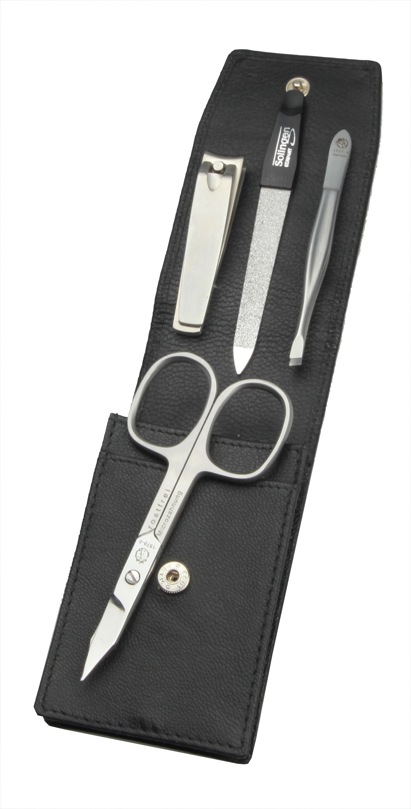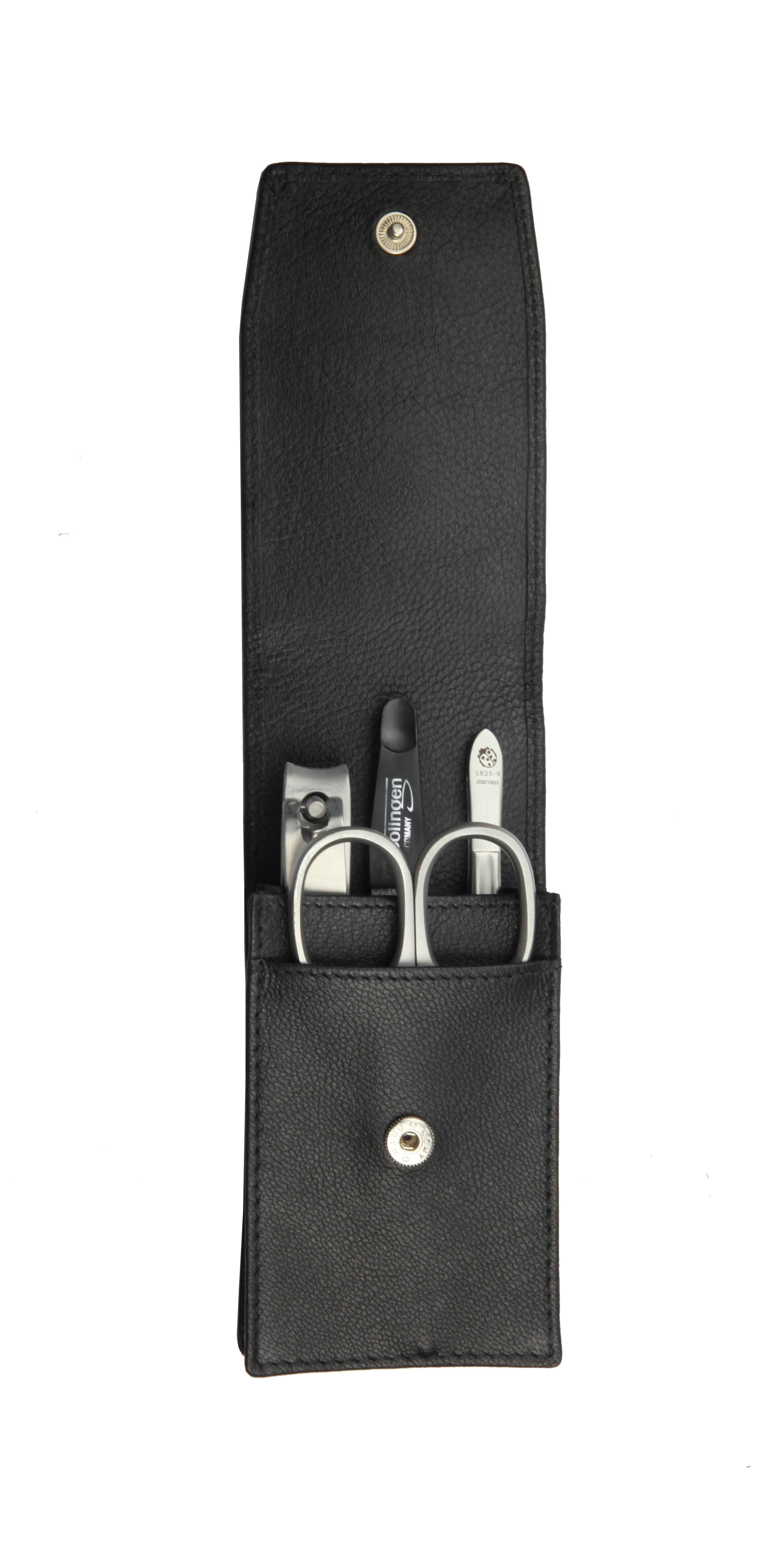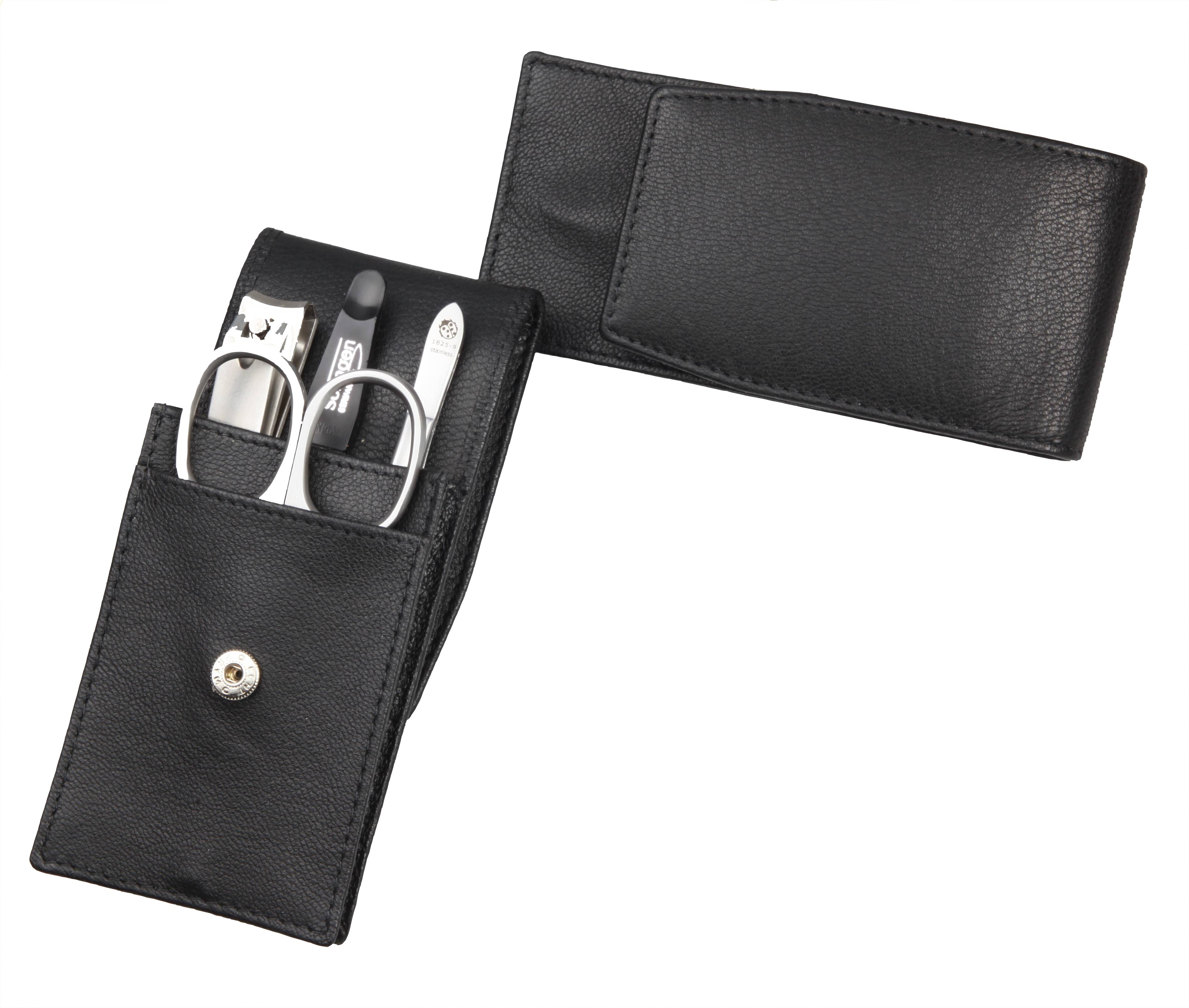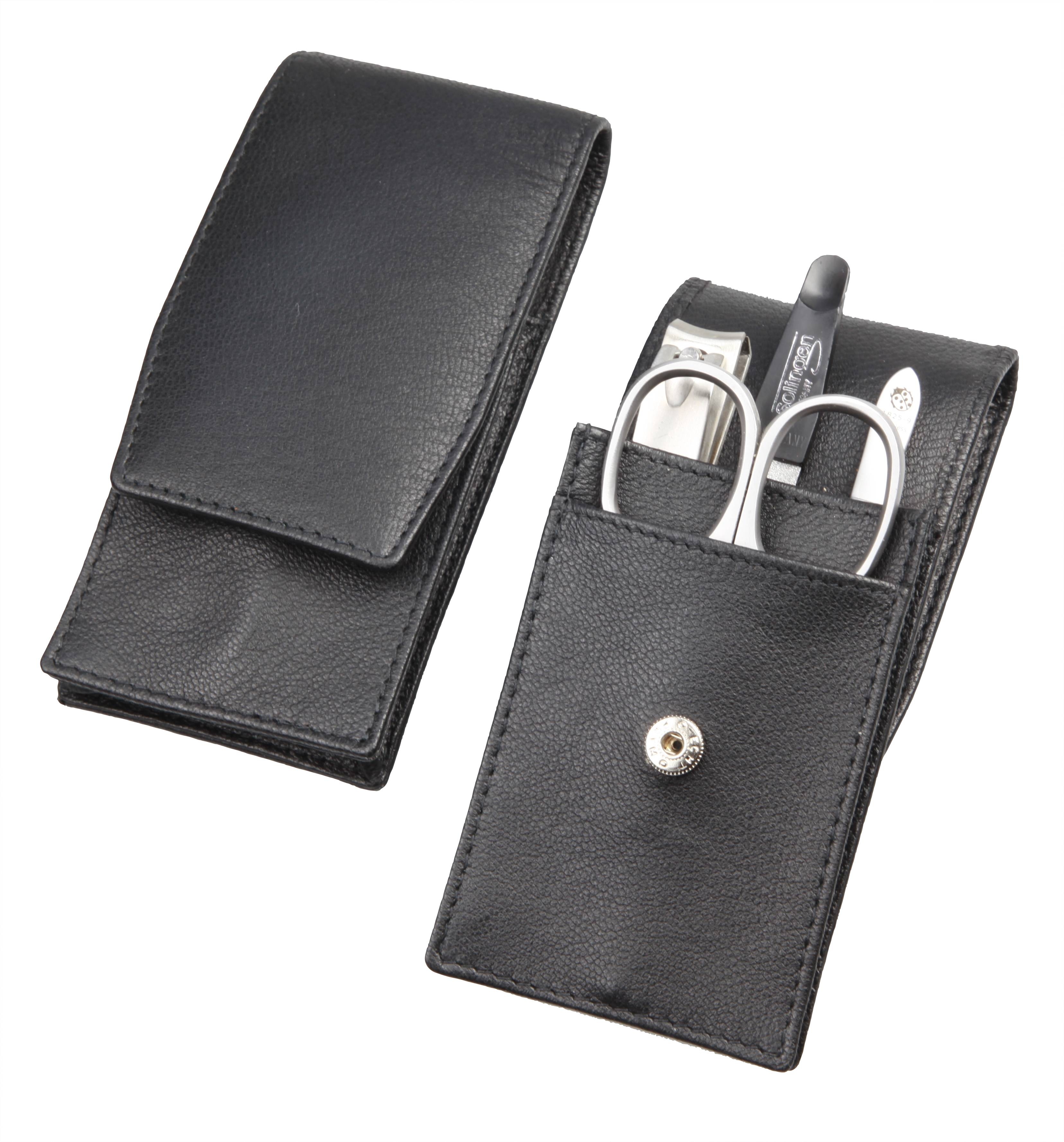 compact manicure set: 4 implements, stainless, matte finish; sheep nappa leather, black
