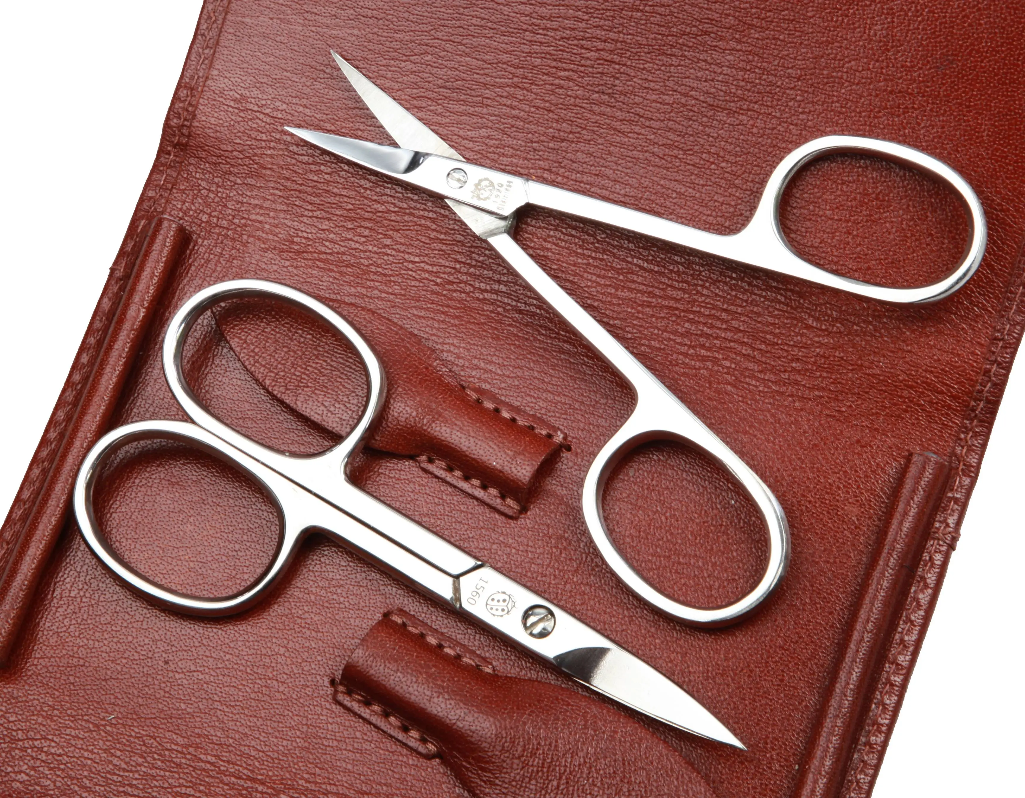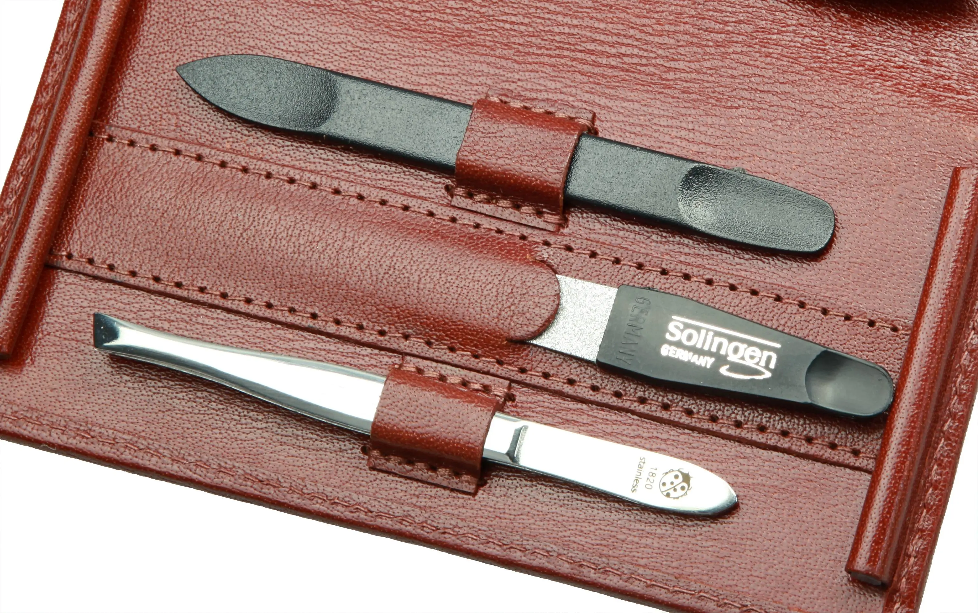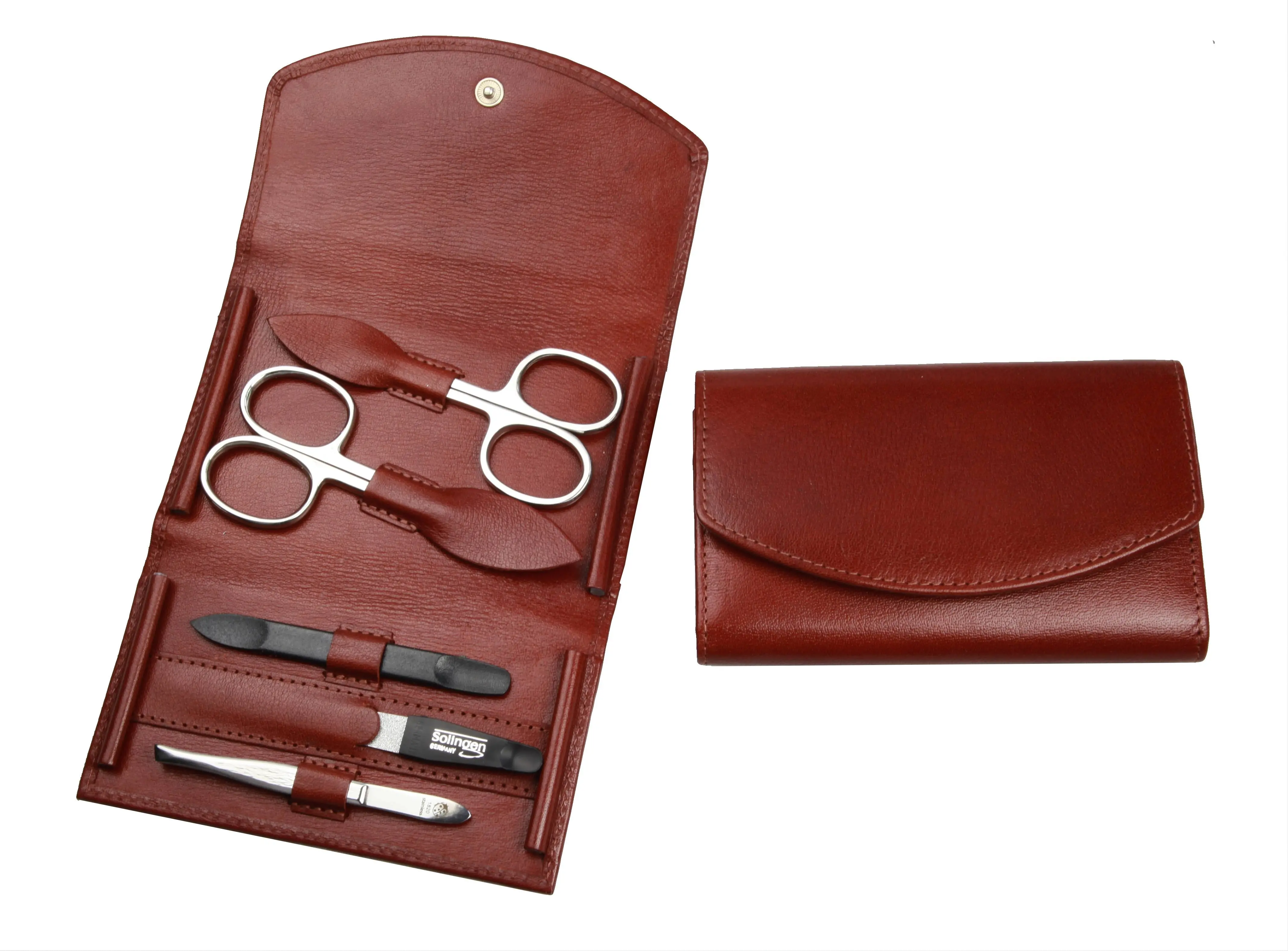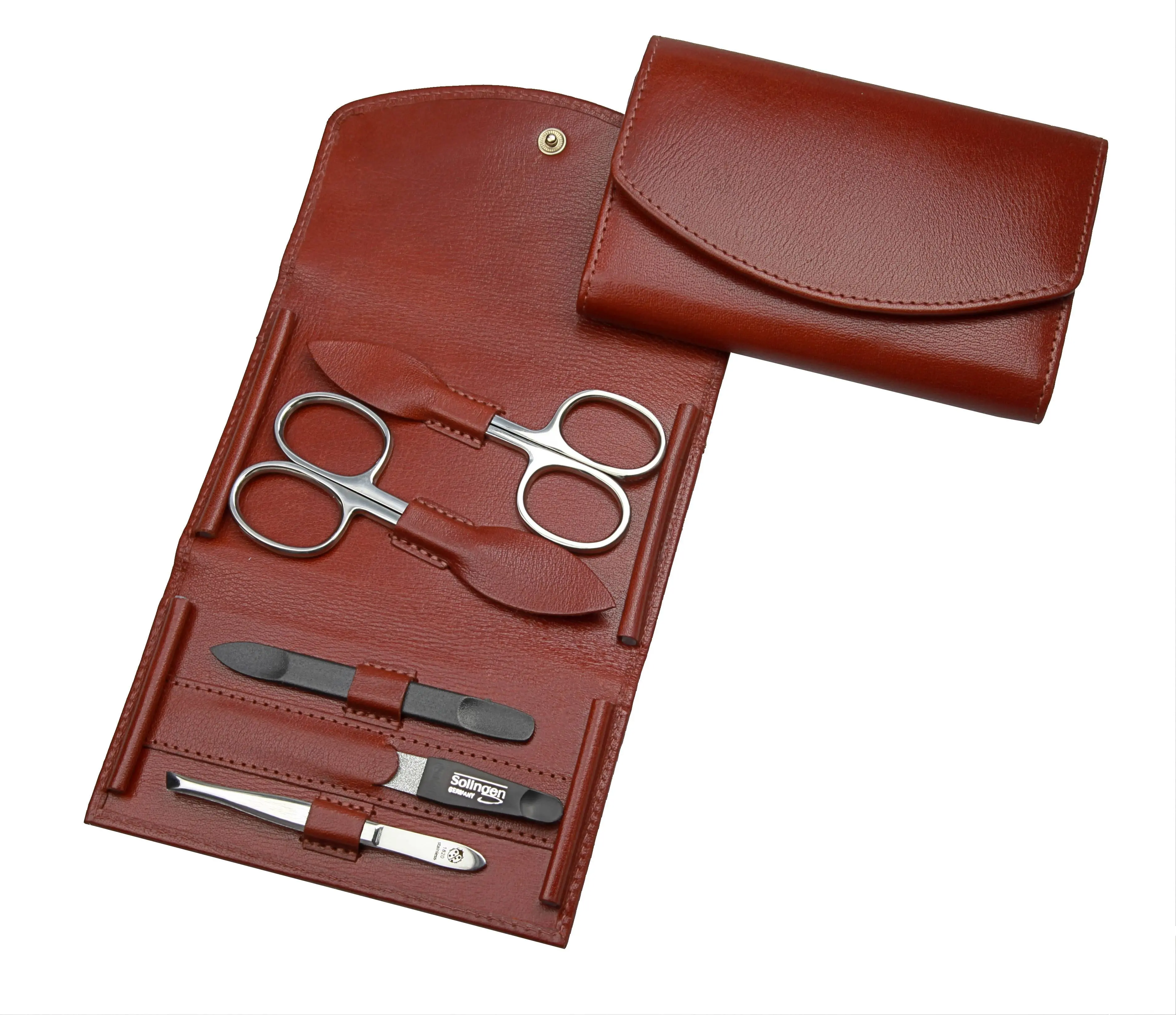 manicure set: 5 implements, stainless steel, mirror-polished; buffalo leather, cognac brown