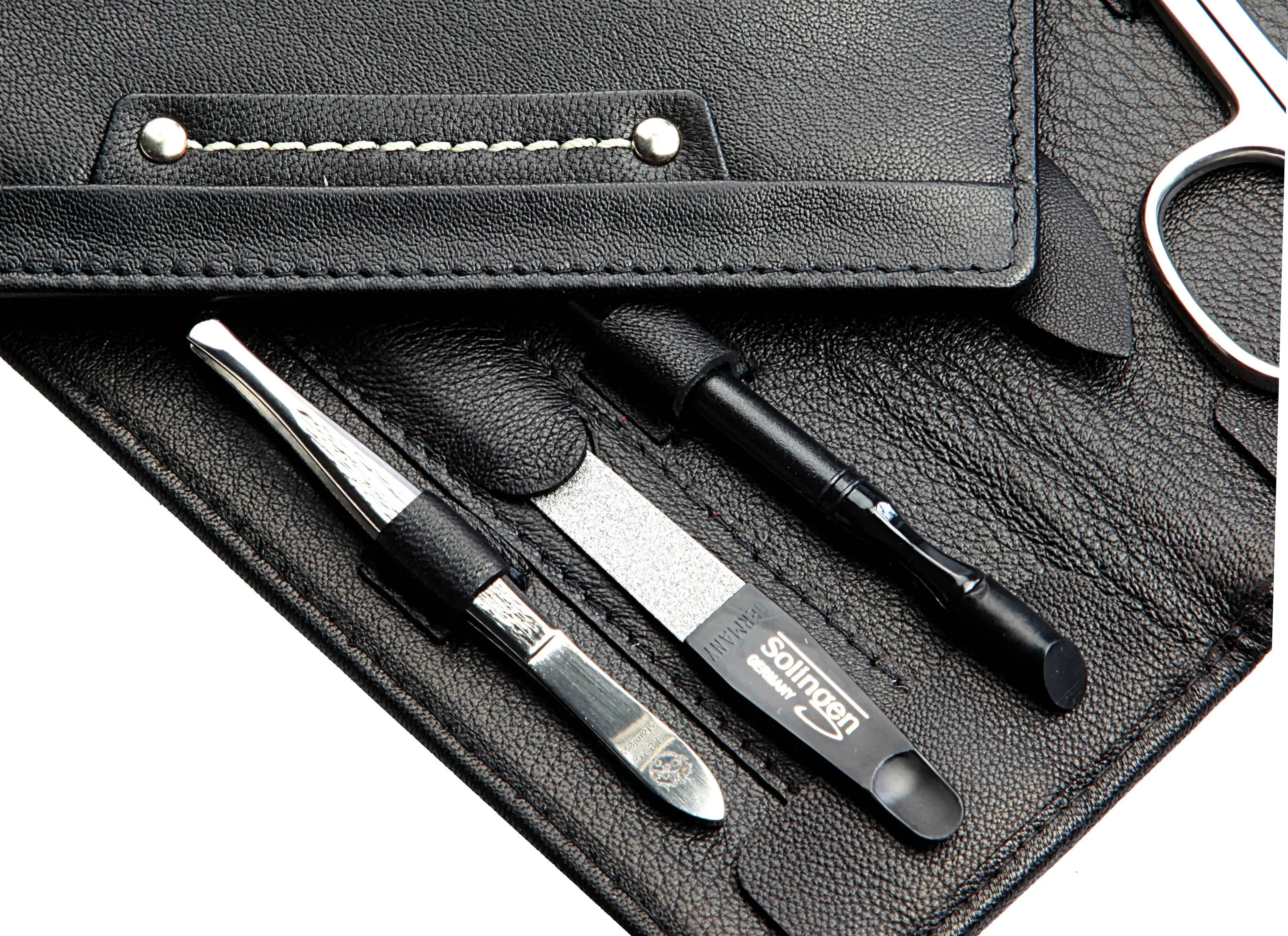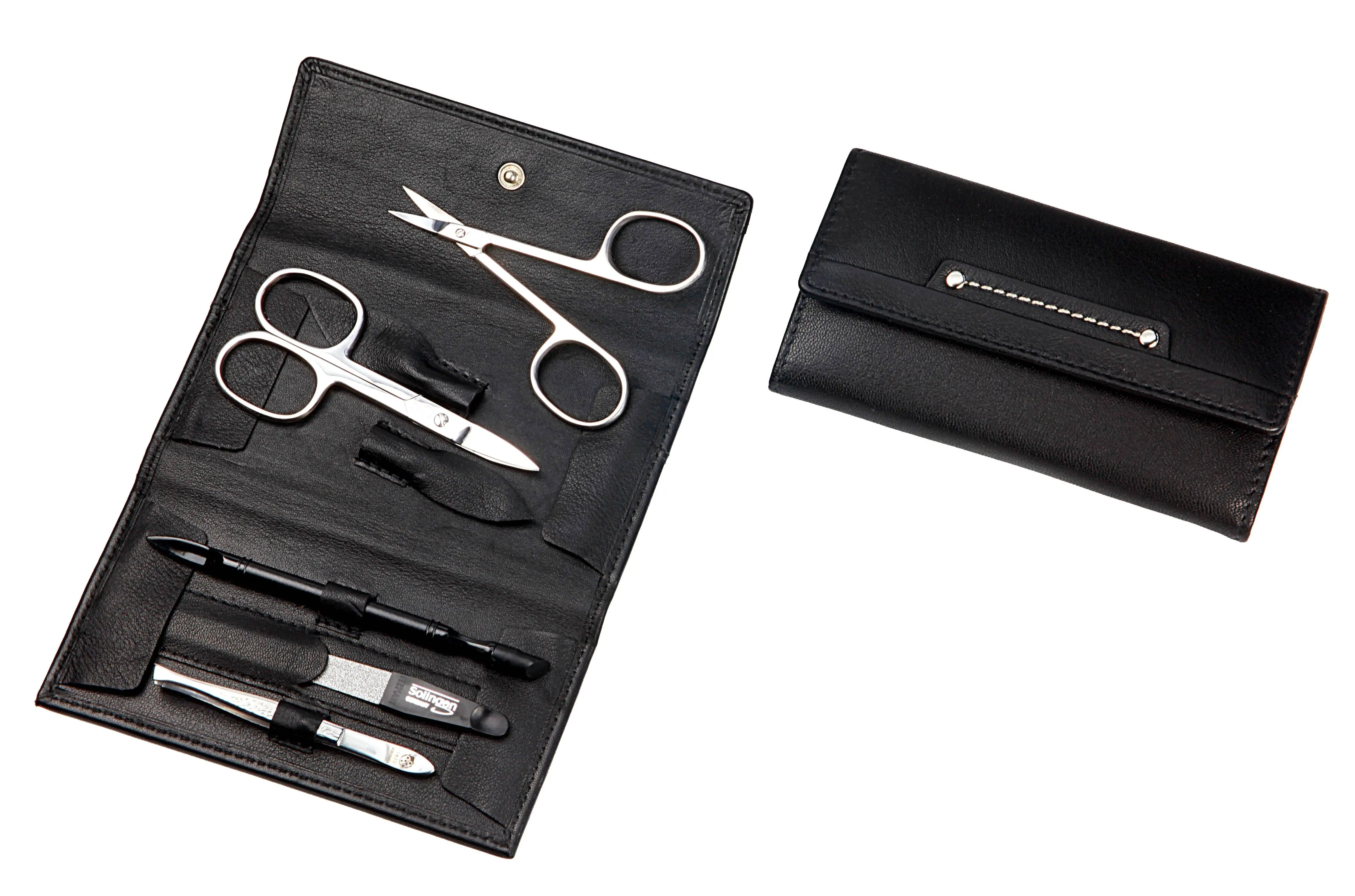 manicure set: 5 implements, stainless steel, mirror polished; nappa lambskin, black
