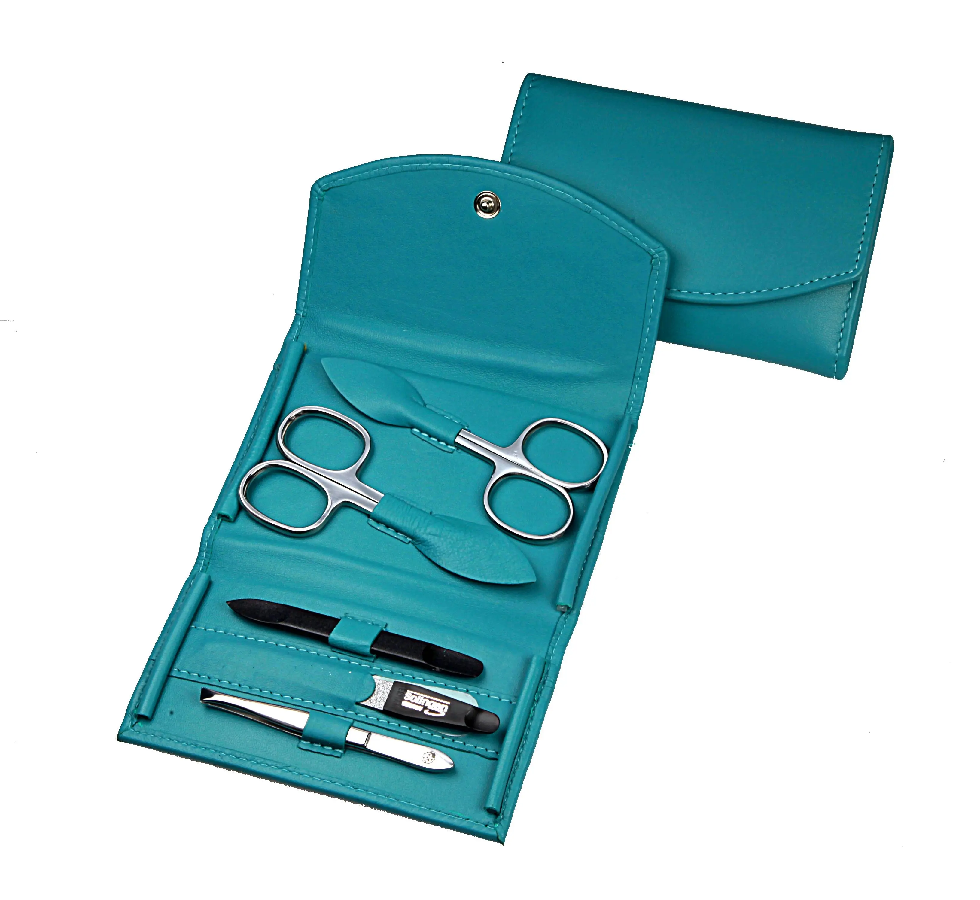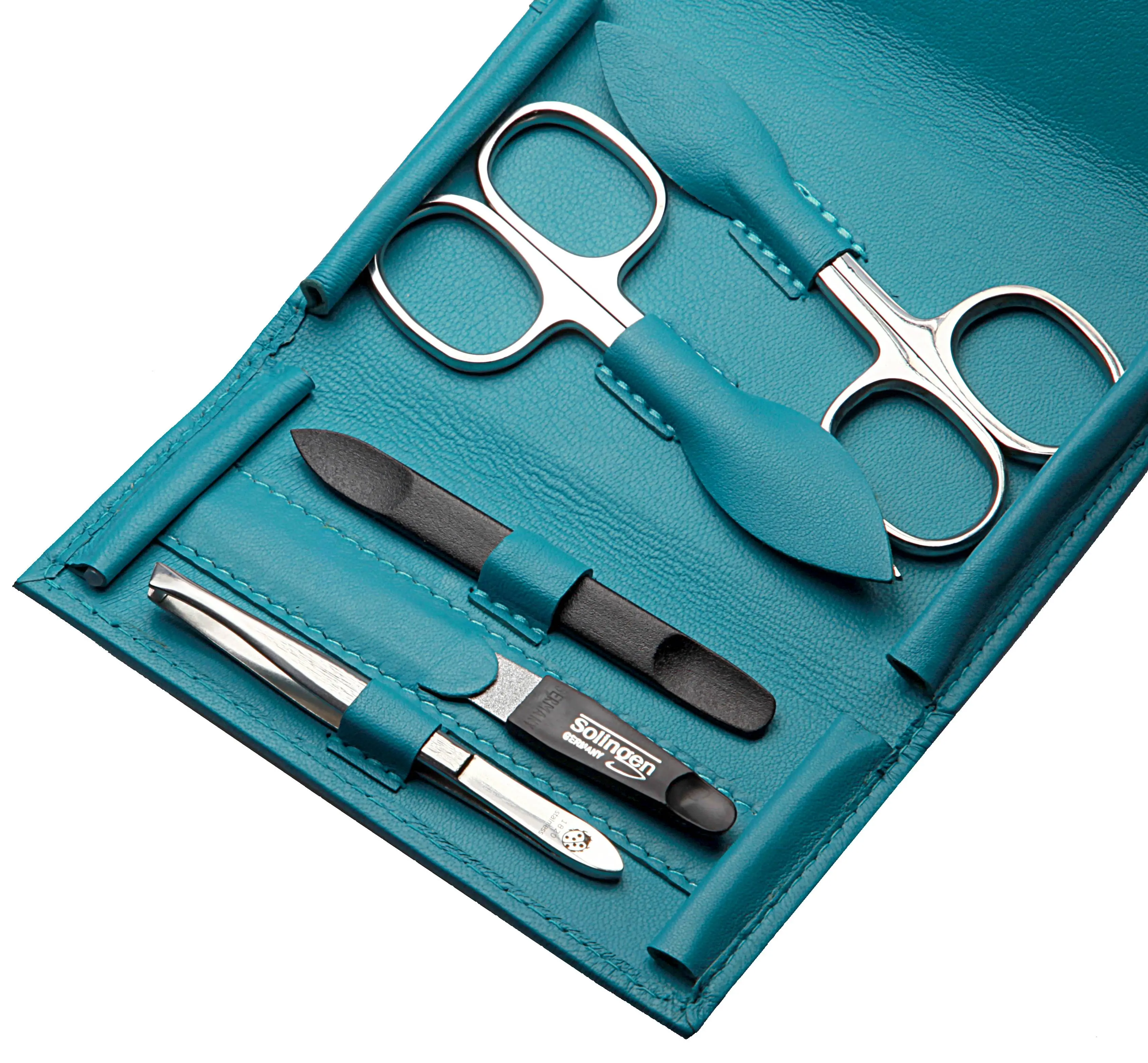 manicure set: 5 implements, stainless steel, mirror polished; nappa lambskin, turquoise