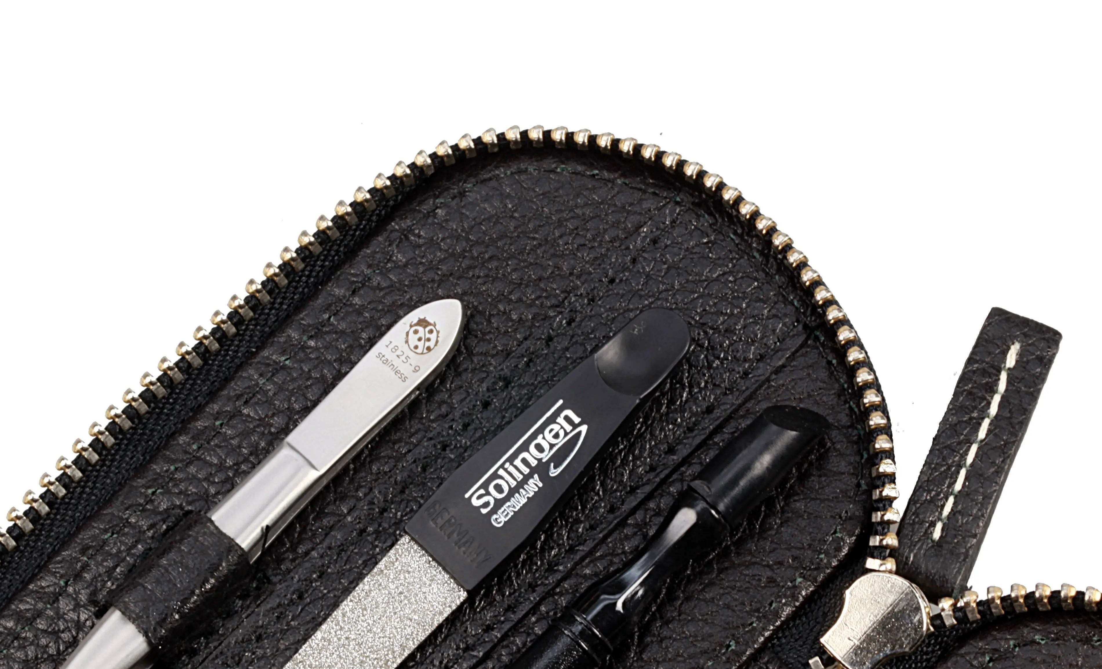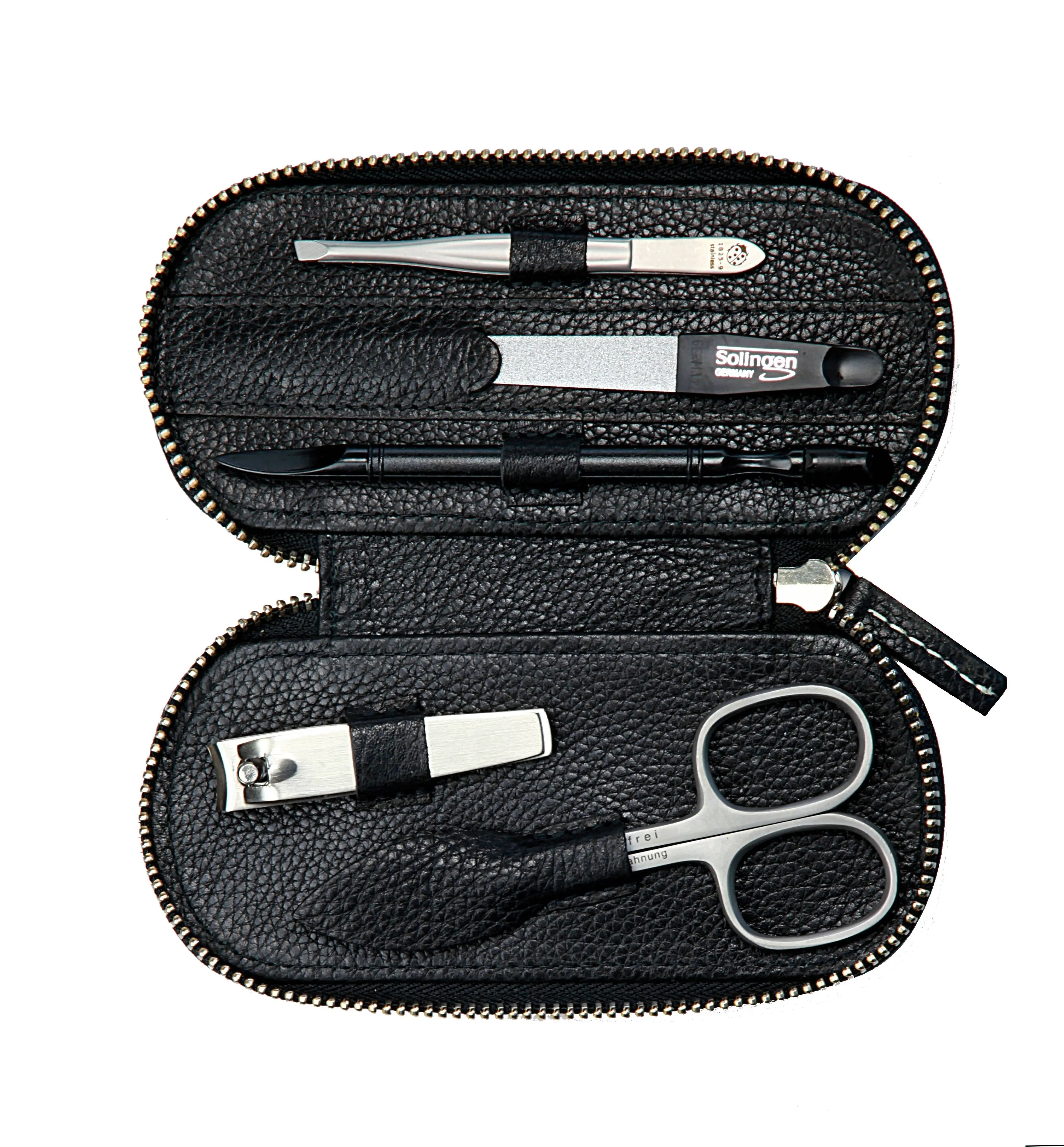 manicure set with metal zipper: 5 implements, stainless steel, matt finish; genuine cowhide, black with light contrast stitching