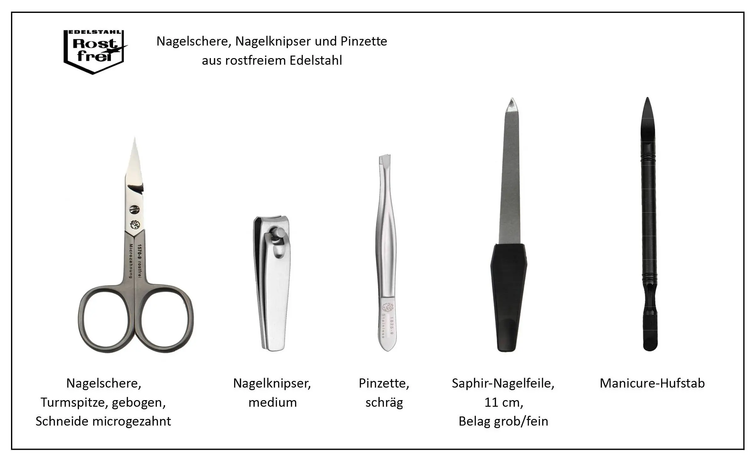 The set includes five fine SONNENSCHEIN nailcare instruments made of stainless steel with a matt finish: