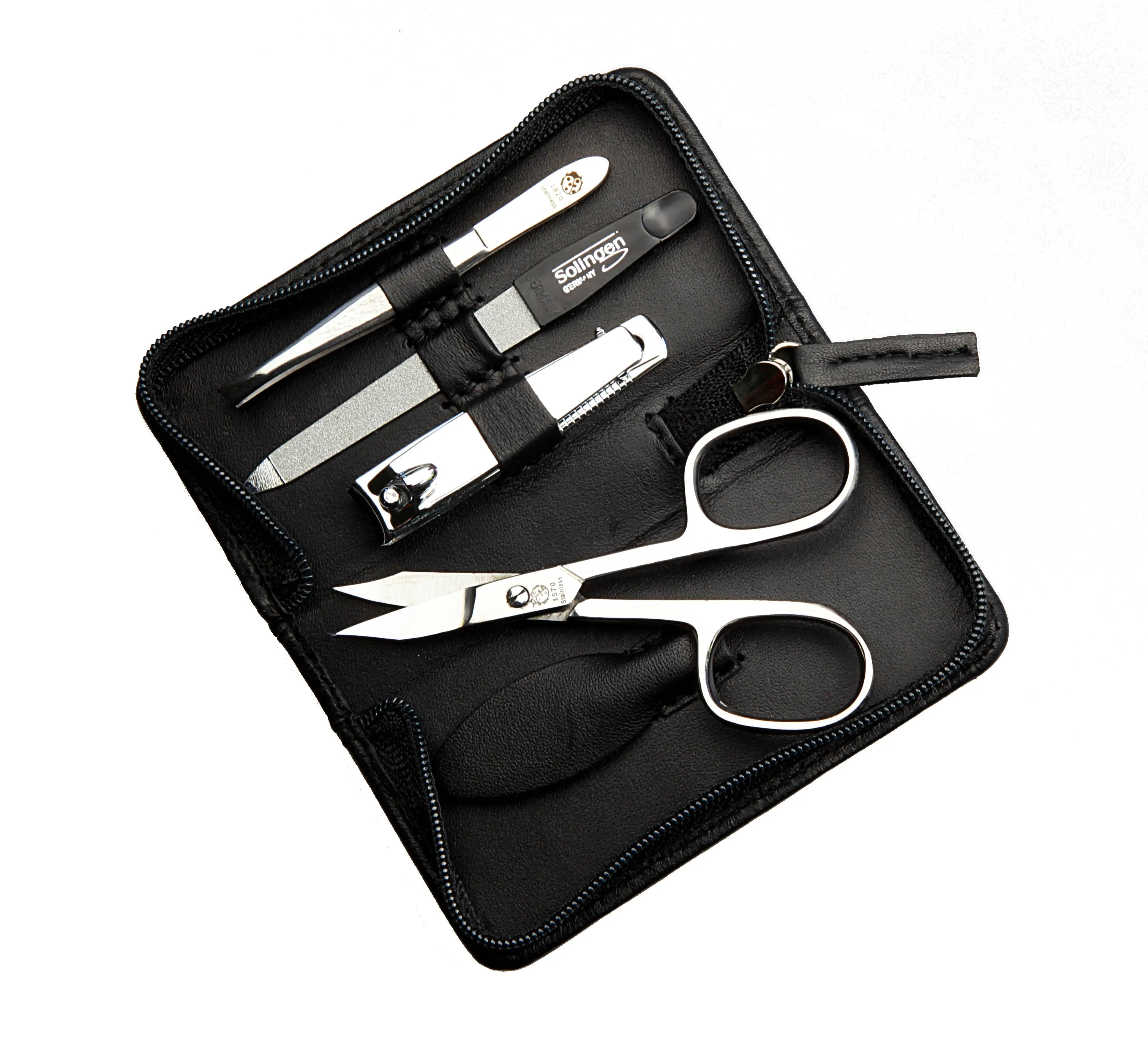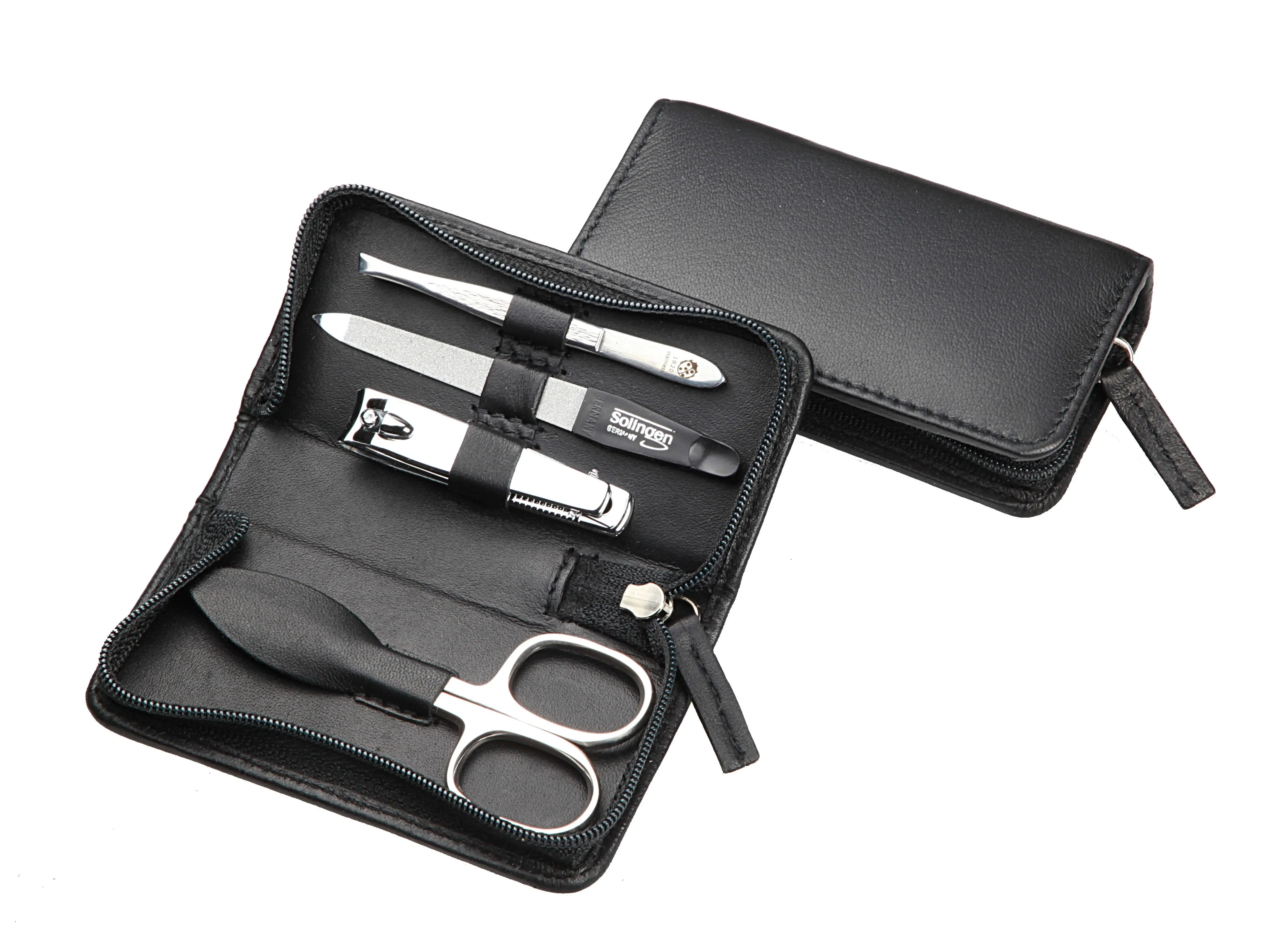 manicure set with zipper: 4 implements, stainless steel, mirror-polished; nappa lambskin, black