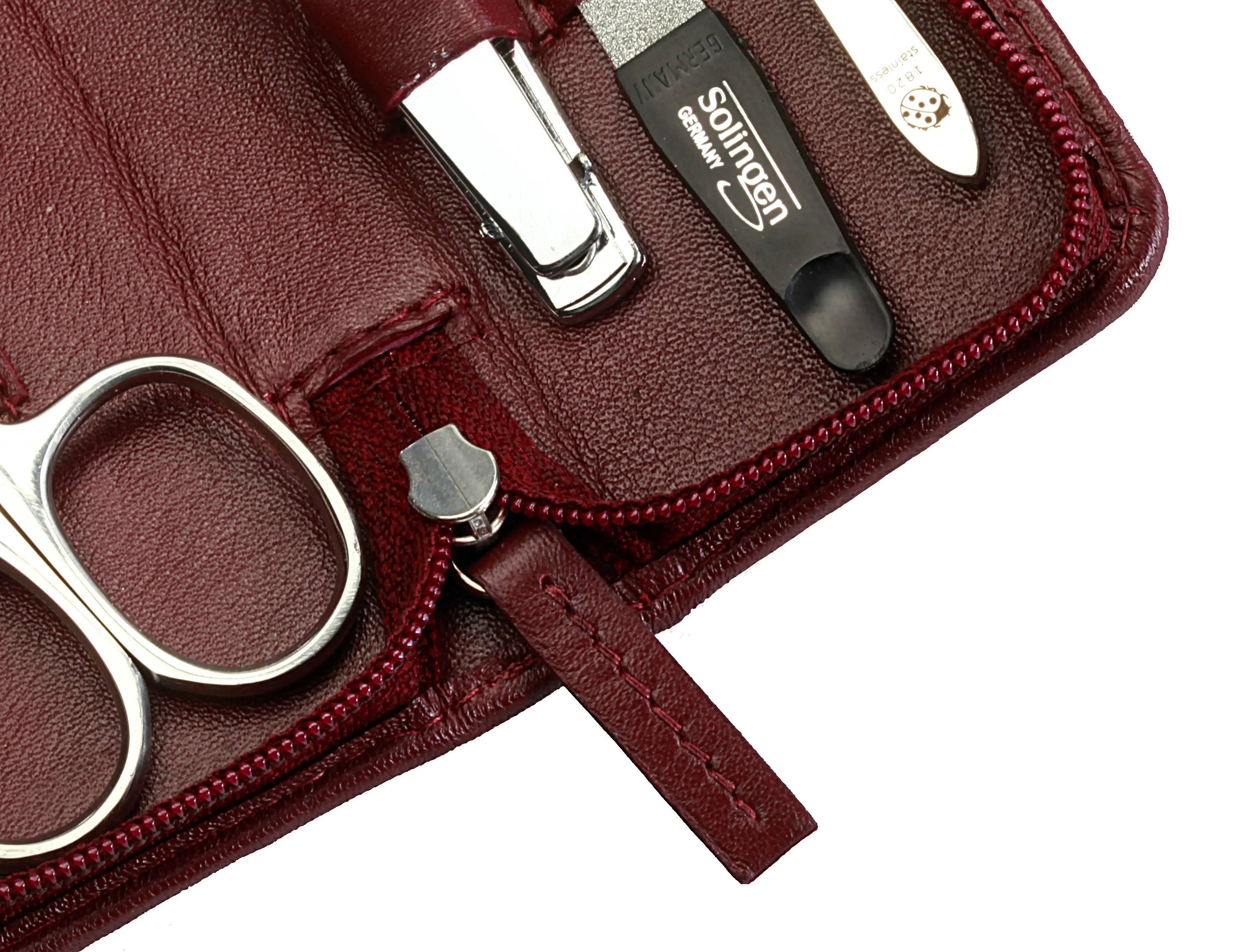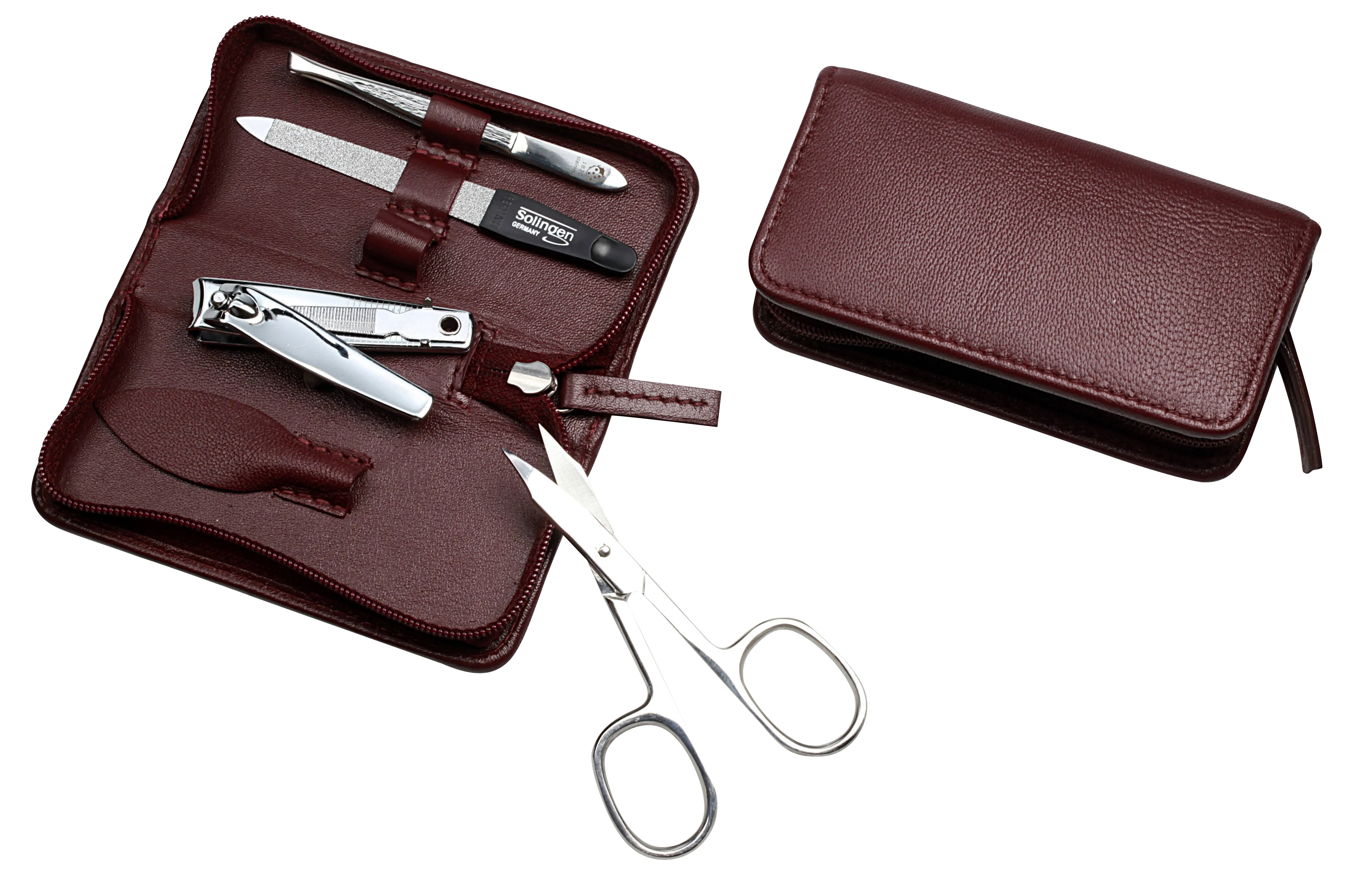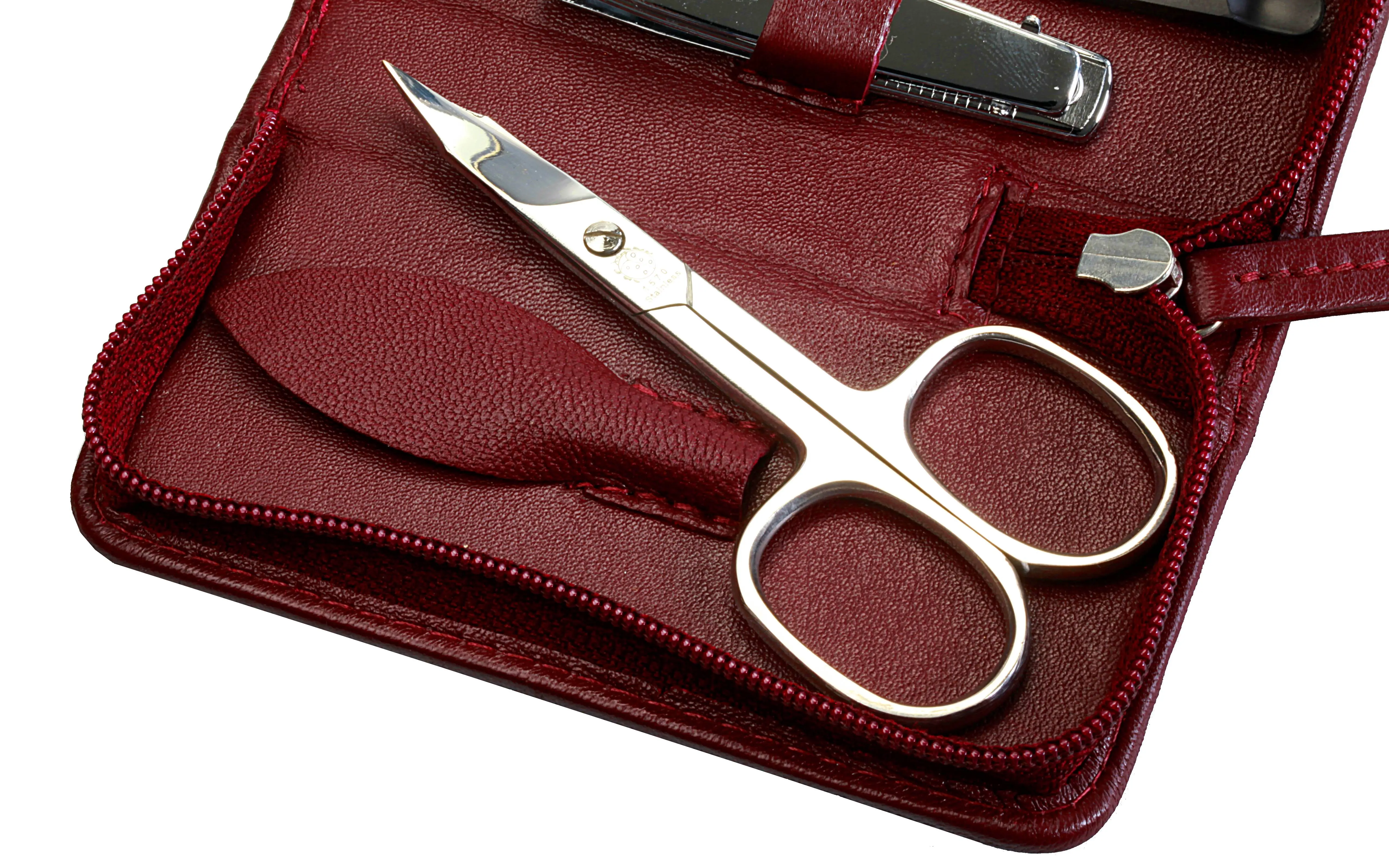 manicure set with zipper: 4 implements, stainless steel, mirror-polished; nappa lambskin, burgundy