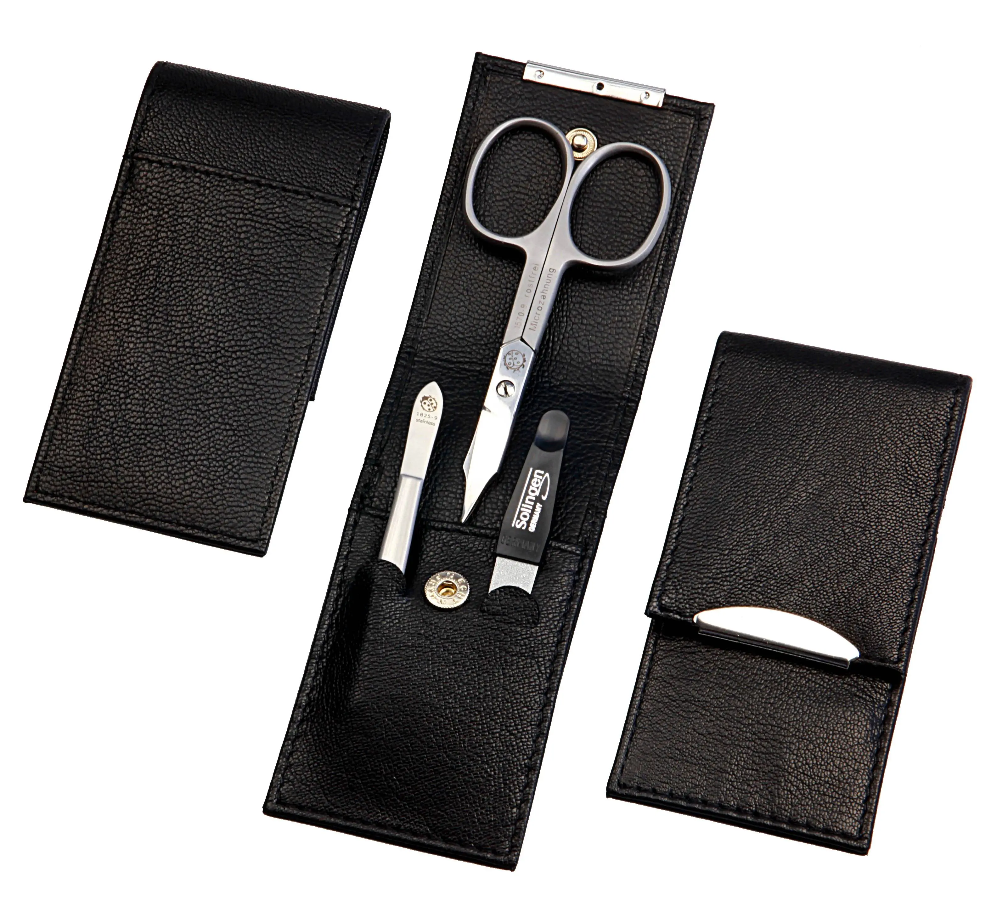 pocket sized manicure set: 3 implements, stainless steel, matt finish; sheep nappa leather, black