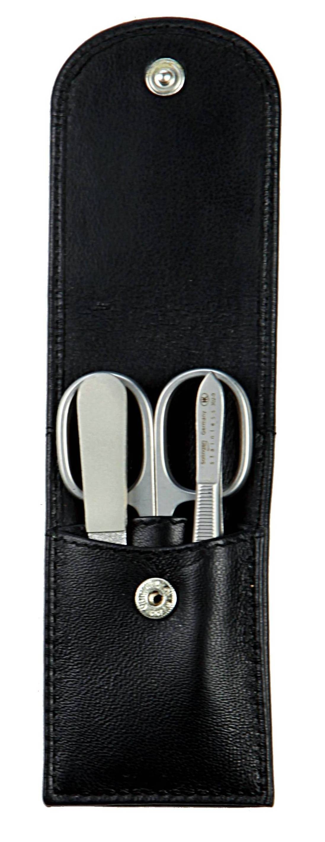 pocket sized manicure set: 3 implements, stainless steel, matte finish; nappa lamb leather, black